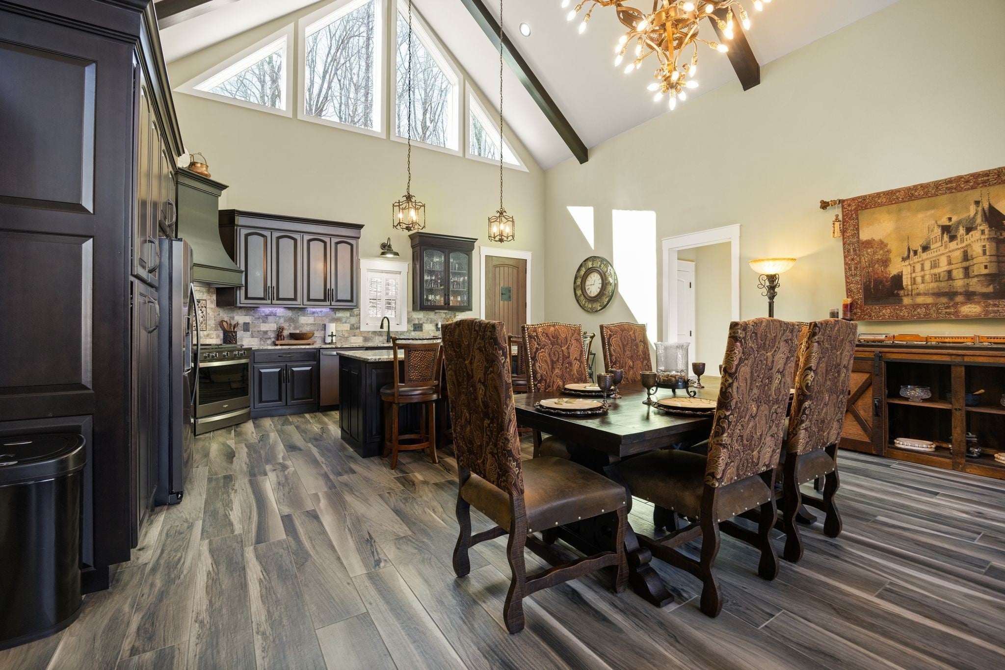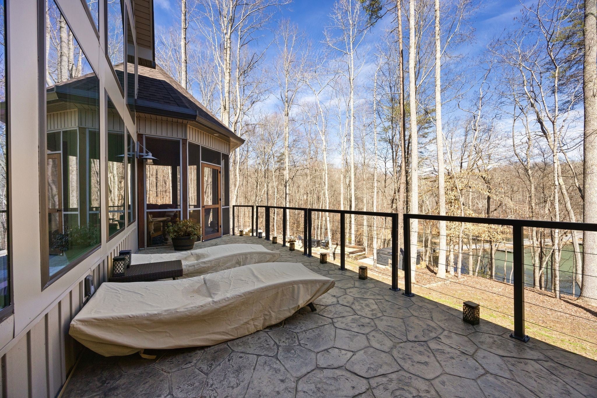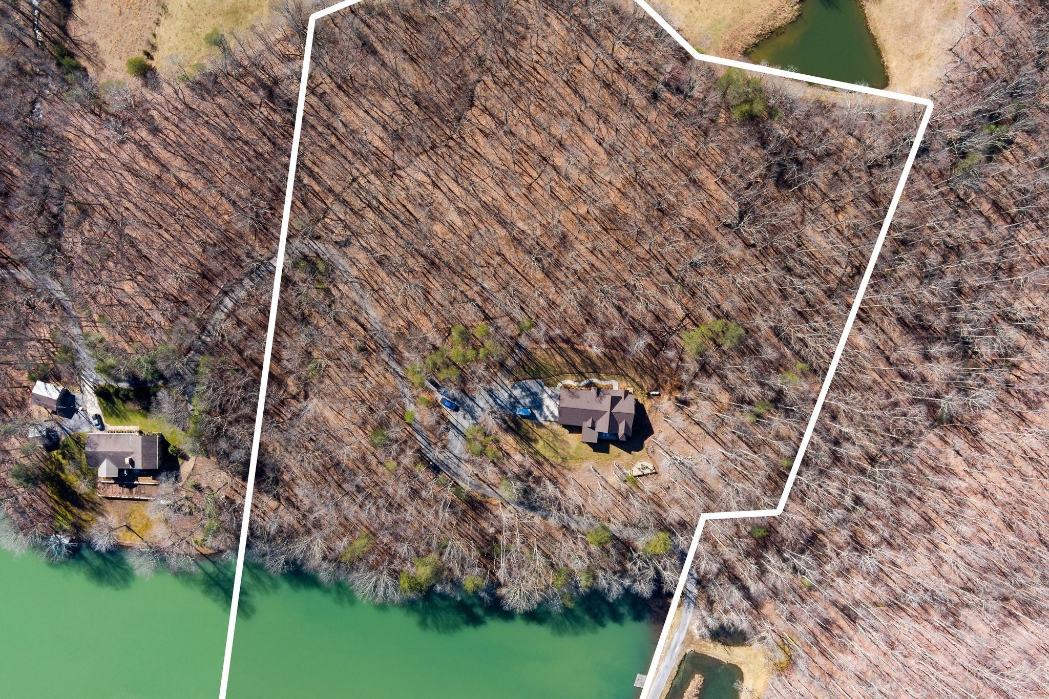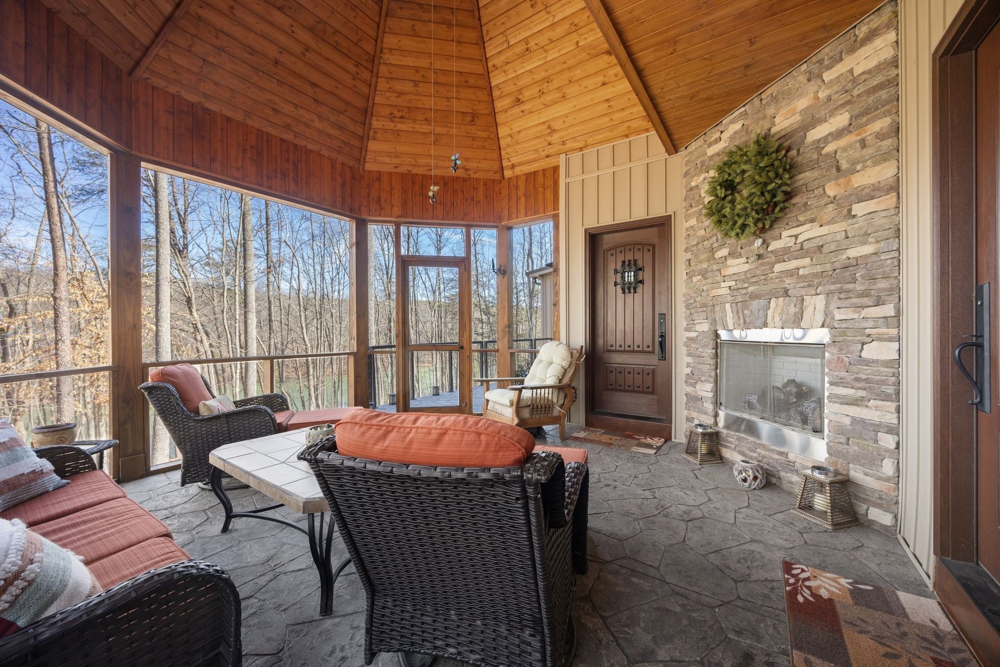 In the quiet, gated community of Mountains Farms, you will arrive at a gorgeous all custom home on 10.81 wooded acres overlooking the community’s private lake. As you approach the drive, you will be greeted by the brand new 1200 sq ft heated, cooled, fully insulated detached garage designed to match the home perfectly. Landscaping is mature and beautiful rock accents compliment the stamped concrete sidewalk and porches. Outside you can enjoy the warmth of the slate stone firepit, take a soak in the hot tub, or cast a line from your private, lighted dock at the water’s edge. A slate stone cooking area is located outside for grilling and around the corner from the full house Generac generator. Inside, the breathtaking great room welcomes with a floor to ceiling stone gas fireplace, beamed ceilings, and a wall of windows to view the lake. The impressive kitchen and massive island invite you to gather. Both primary and guest suites are large with vaulted ceilings, full baths and custom closets. The third bedroom is re-designed as a theatre room with surround sound & lighting and raised seating for an authentic movie night experience. The witches hat screened porch has a second gas stone fireplace for another relaxing space to spend an evening at home. A home office, spacious laundry room and attached garage with custom cabinetry matching the interior complete the home. The third attached garage bay has been converted to a home gym with full insulation, heat/air, and padded flooring. This space is incredibly flexible as a gym, game room, hobby spot, etc. As you tour the home, notice the solid wood doors, Emtek hardware, iron return vents, metal plate covers, crawl space encapsulation and a storm shelter/safe room with hidden access from the theater room. Additional storage with a single garage is located on the upper section of the property. Here you will find secluded serenity in a thoughtfully designed home with special attention given to quality and detail.