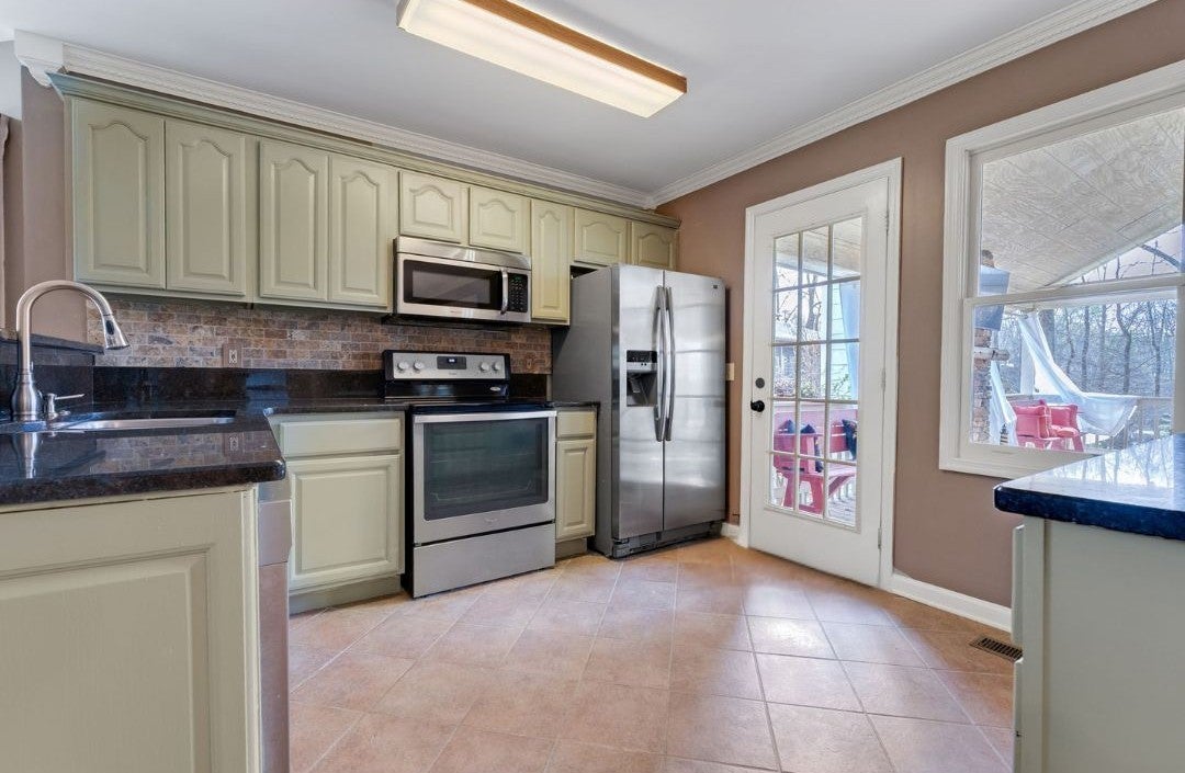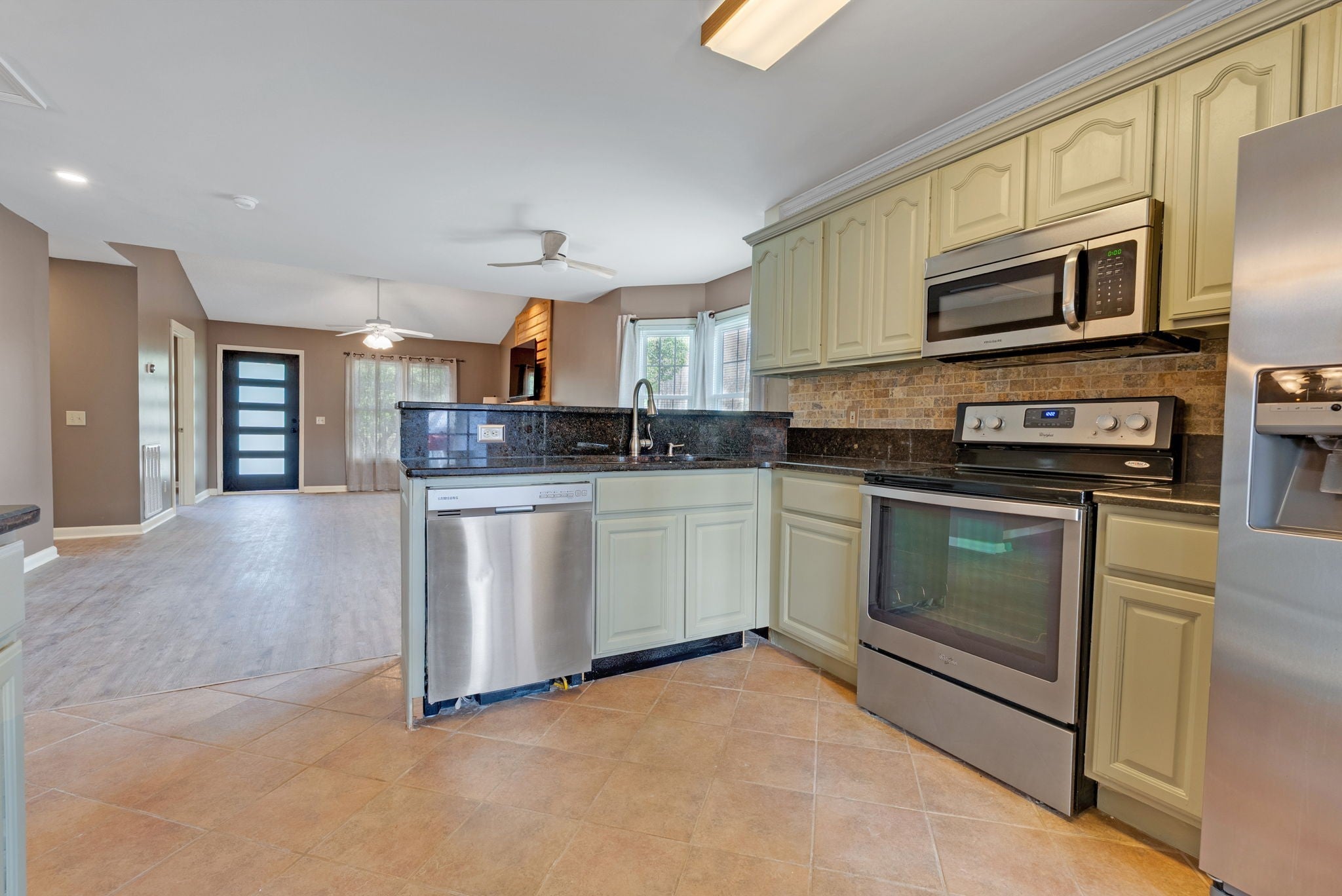 - Electric Range, Dishwasher, Dryer, Microwave, Refrigerator, Stainless Steel Appliance(s), Washer