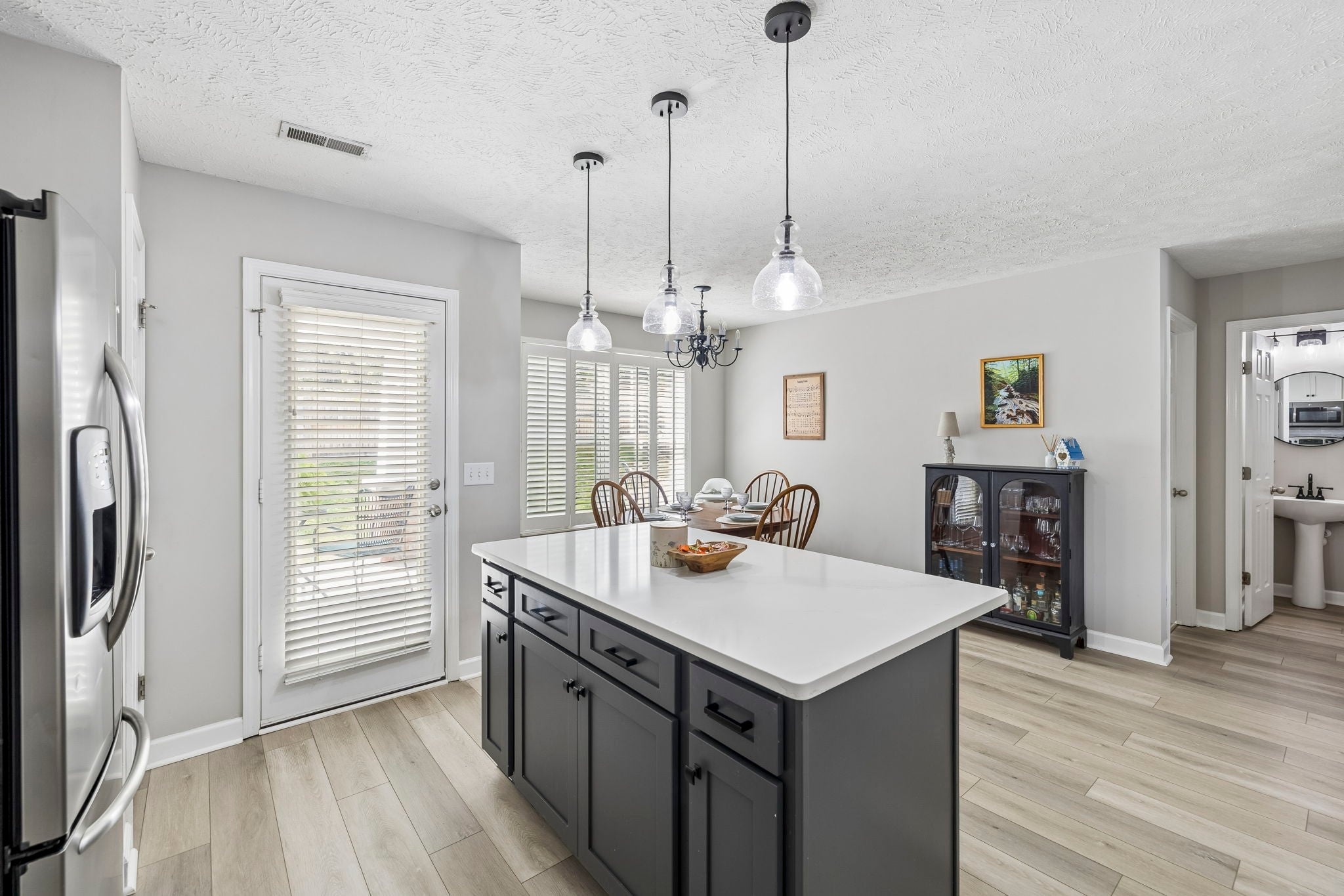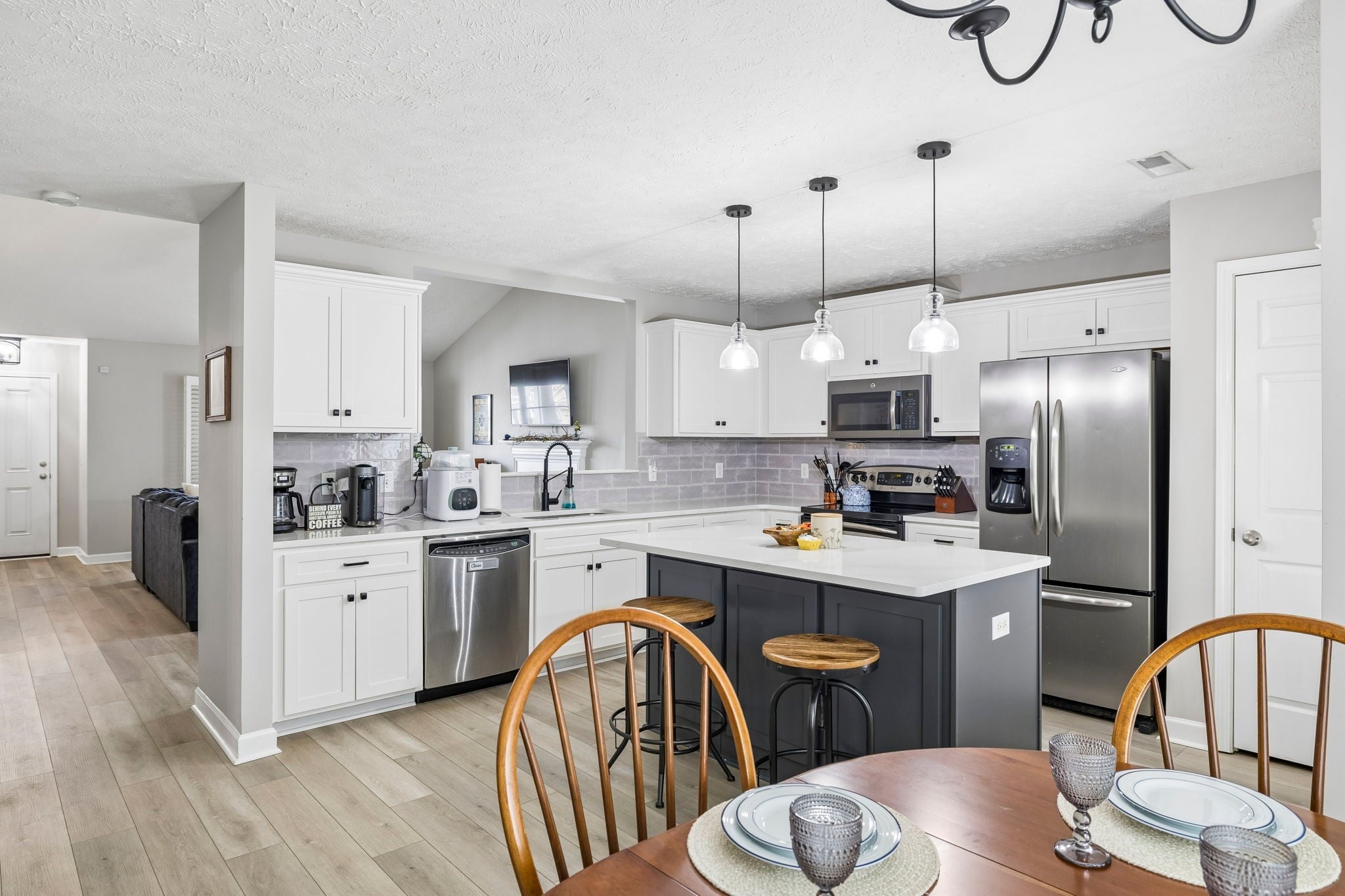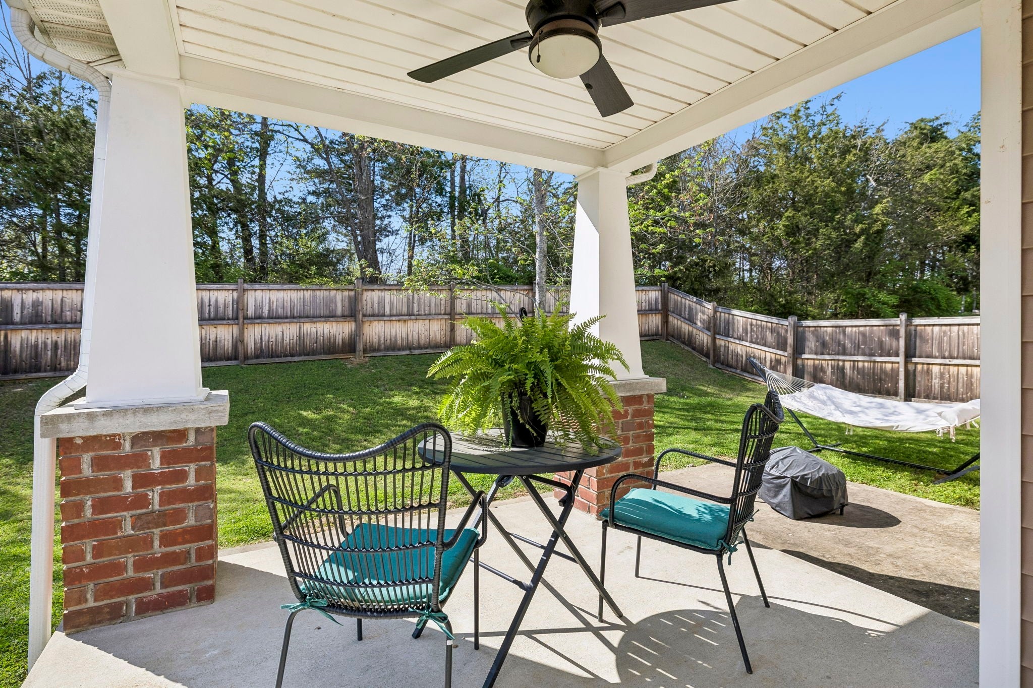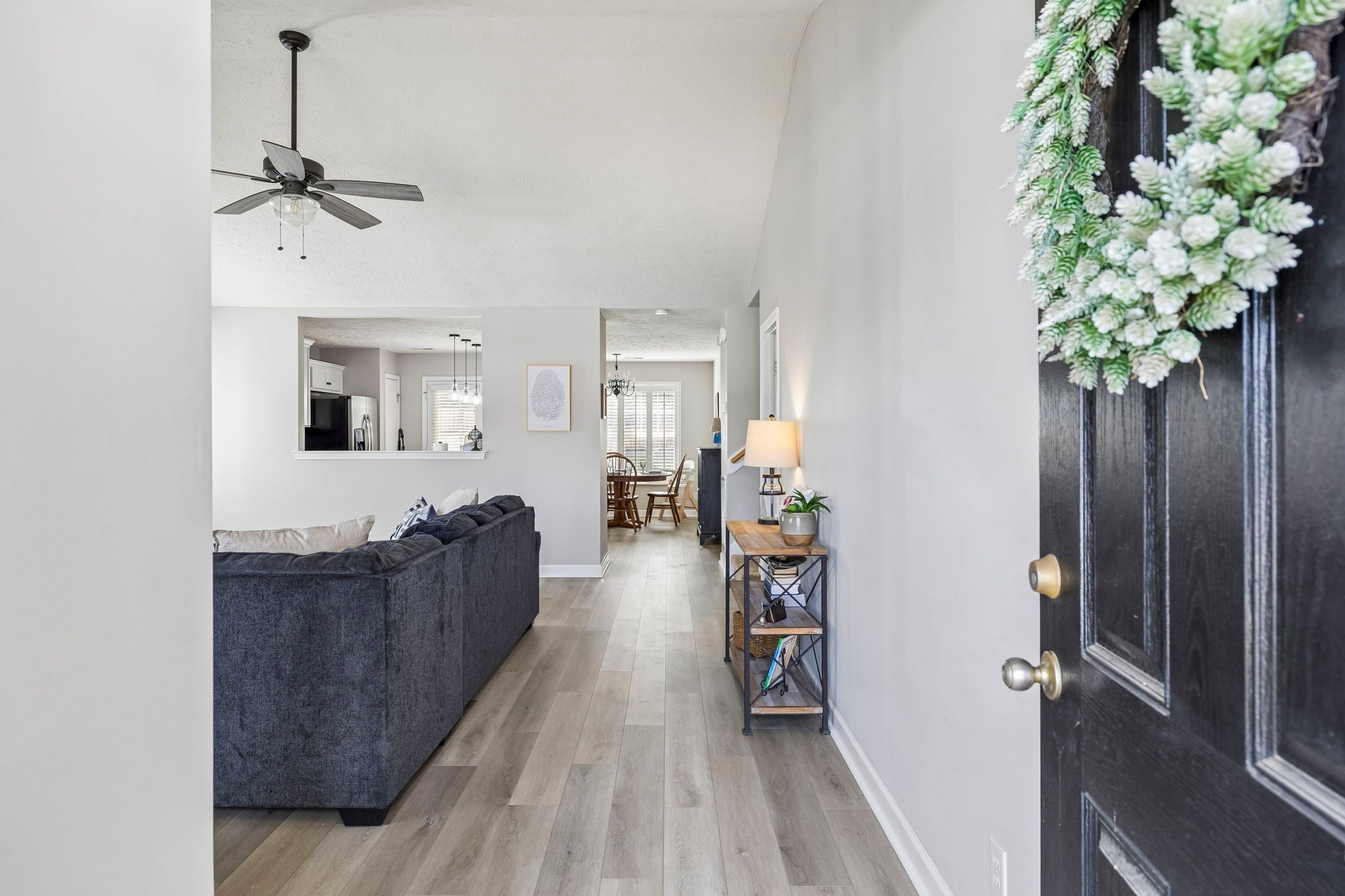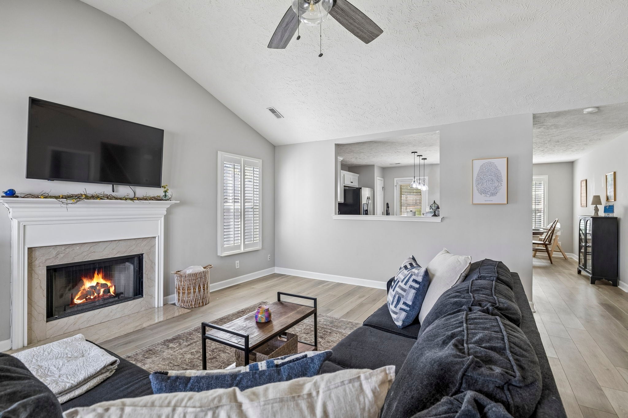 Welcome home to this beautifully maintained 3 bedroom, 2.5 bath single-family home in the heart of Mt. Juliet! Offering 1,893 sq ft of comfortable living space, this move-in ready gem checks all the boxes. Step onto the charming covered front porch before being welcomed inside by soaring vaulted ceilings, luxury vinyl plank flooring, and plantation shutters throughout the main level. The stunning kitchen features quartz countertops, a center island with seating, pendant lighting, a subway tile backsplash, stainless steel appliances, and a pass-through window to the living room, and the refrigerator stays! The breakfast area flows seamlessly from the kitchen, keeping the whole family connected. The main level primary suite is a true retreat, featuring a walk-in closet and a spa-like bath complete with gray cabinetry, quartz countertops, matte black hardware, and a relaxing soaking tub. Cozy up by the fireplace in the inviting living room, and enjoy the flexibility of two additional bedrooms and a bonus room upstairs, perfect for a home office, playroom, or guest space. Major updates mean peace of mind for years to come: new roof (2024), new hot water heater (2024), and a brand new HVAC system (2025). The big-ticket items are already done! Head outside to the covered back patio with an extra concrete slab, ideal for a grill or firepit setup, all within a fully fenced backyard. Neighborhood amenities including a resort-style pool and playground make this community truly special. Location does not get much better, just minutes from Mt. Juliet's best shopping, dining, and with easy highway access, commuting is a breeze.