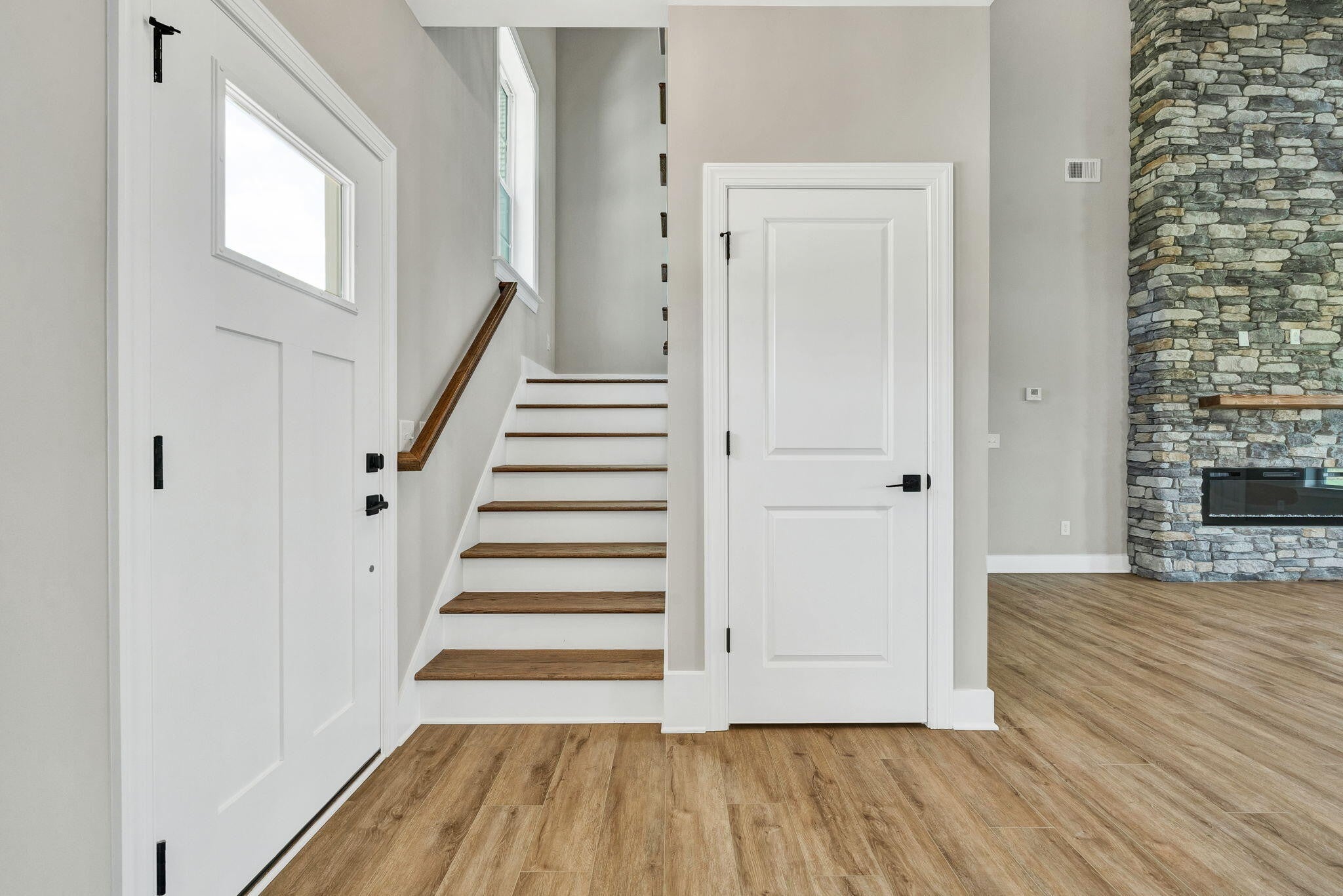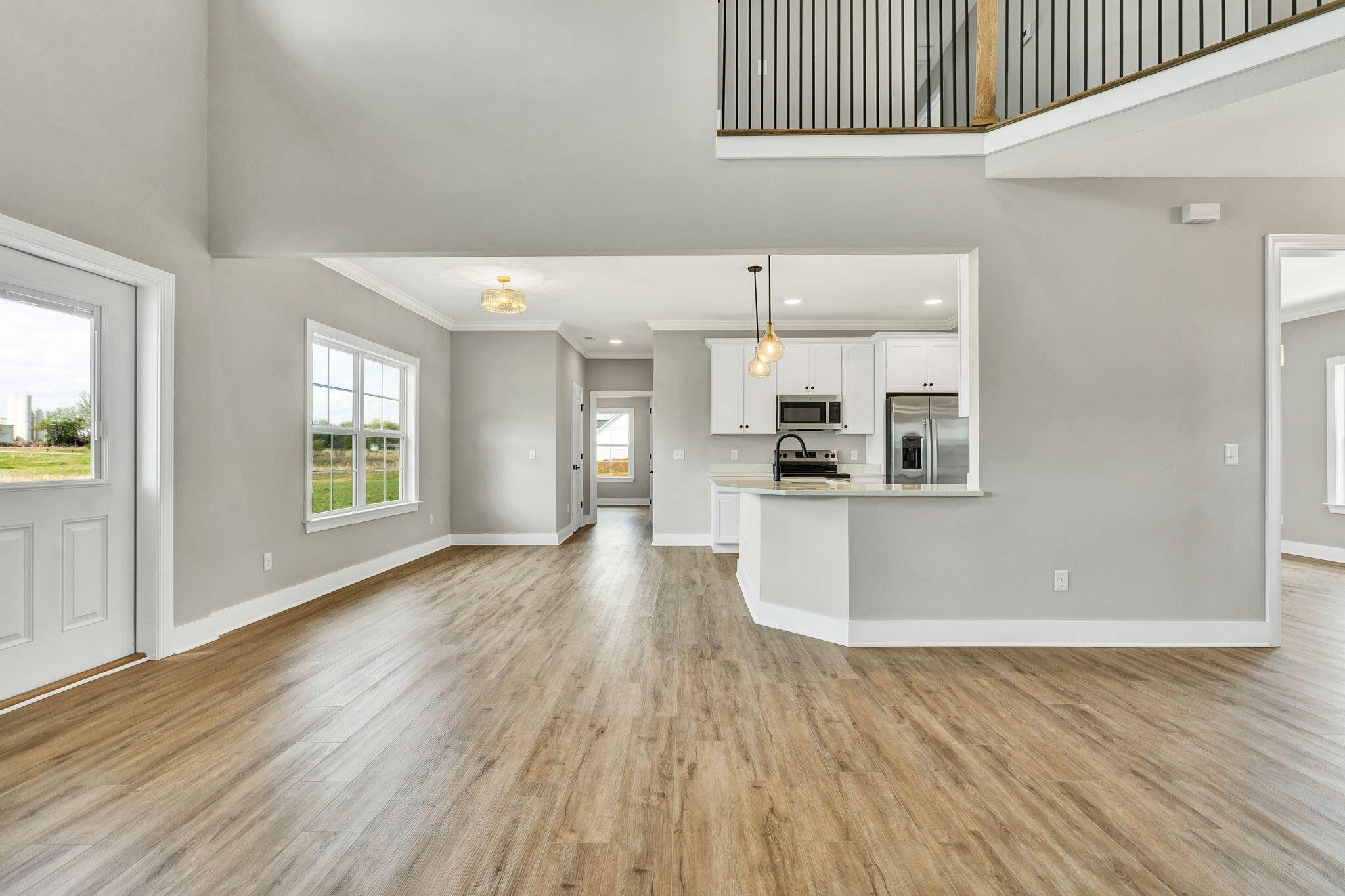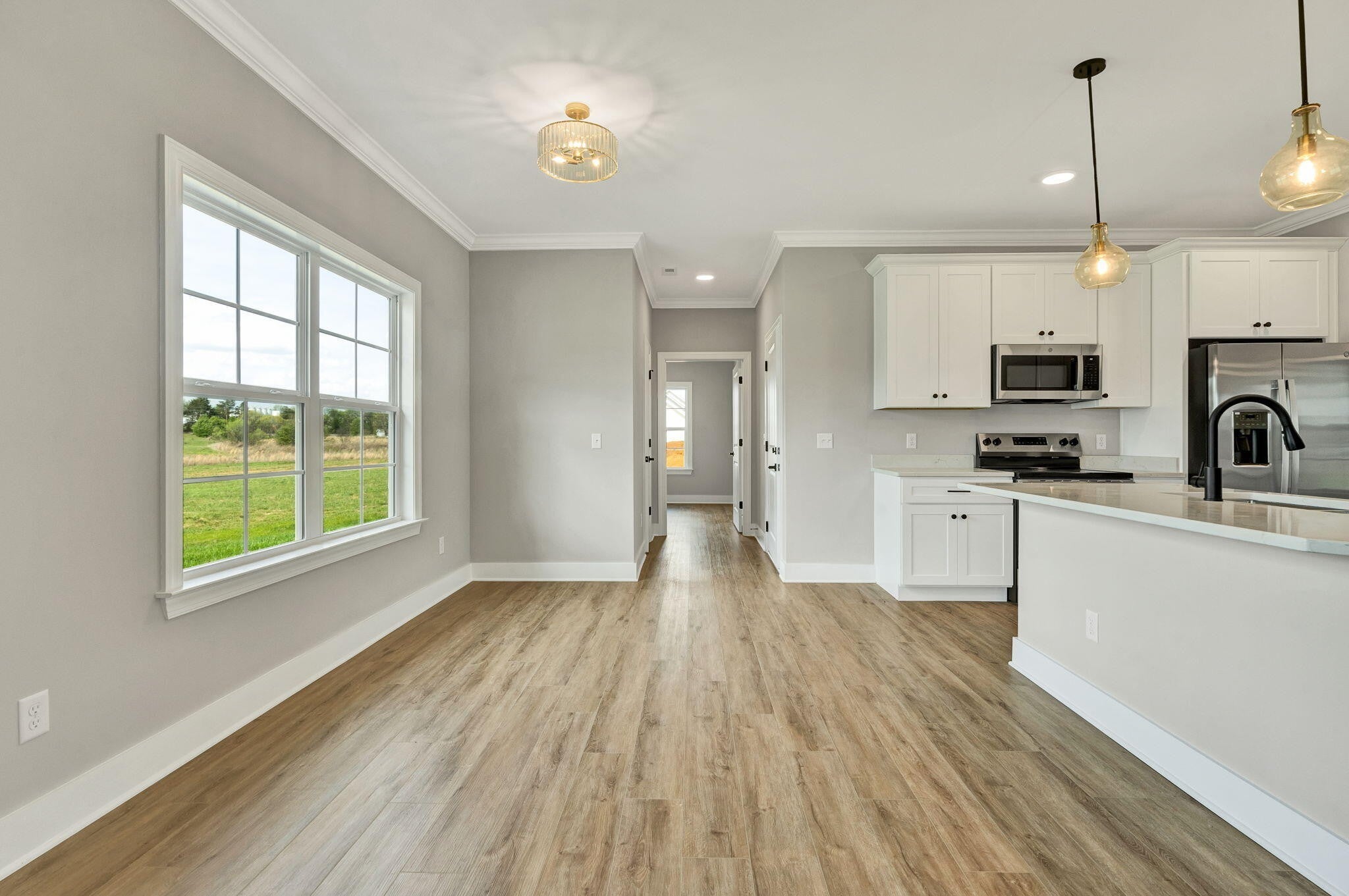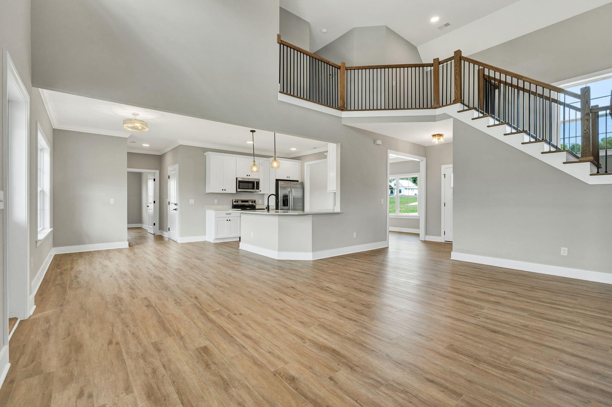 This thoughtfully designed new construction home offers 2,450 sf of refined living space, blending comfort, functionality, and modern style. With 3 bedrooms, 2.5 bathrooms, and a well planned open floor plan, the home creates a bright and inviting atmosphere ideal for both everyday living and entertaining. The main level makes a strong impression with soaring 20 foot ceilings, crown molding, and luxury vinyl flooring that extends throughout the entire home, offering both durability and a cohesive, upscale look. The living area is anchored by a stacked stone electric fireplace, creating a warm and stylish focal point. A separate formal dining room provides an ideal setting for hosting gatherings, holidays, or special occasions. The kitchen is designed to be both functional and visually appealing, featuring quartz countertops, ample cabinetry, and generous workspace for meal preparation. A breakfast bar offers casual seating, while the dedicated breakfast area provides additional space for dining and everyday convenience. The primary suite is located on the main level, offering privacy and ease of access. This spacious retreat includes a large walk in closet and a well appointed en suite bathroom with dual vanities and a walk in tile shower. A generously sized laundry room on the main floor adds to the home's everyday practicality. Upstairs, 2 additional bedrooms and a full bathroom provide comfortable accommodations for family or guests. A large bonus room offers exceptional flexibility and can easily be used as a media room, home office, playroom, or additional living space to suit a variety of needs. Every detail of this home has been designed with livability in mind, offering a balance of open gathering spaces and private areas. With quality craftsmanship, modern finishes, and a versatile layout, this home presents an excellent opportunity for buyers seeking new construction in a well designed and functional space.