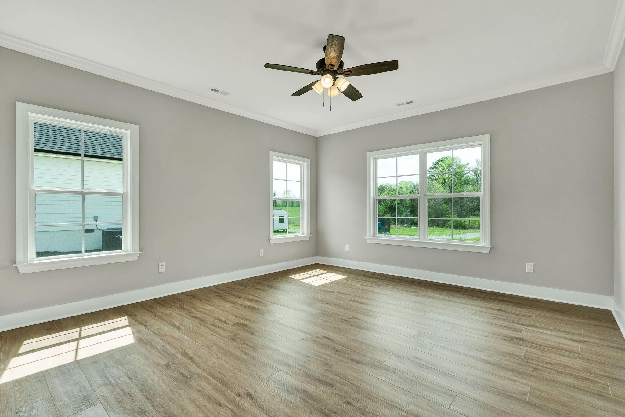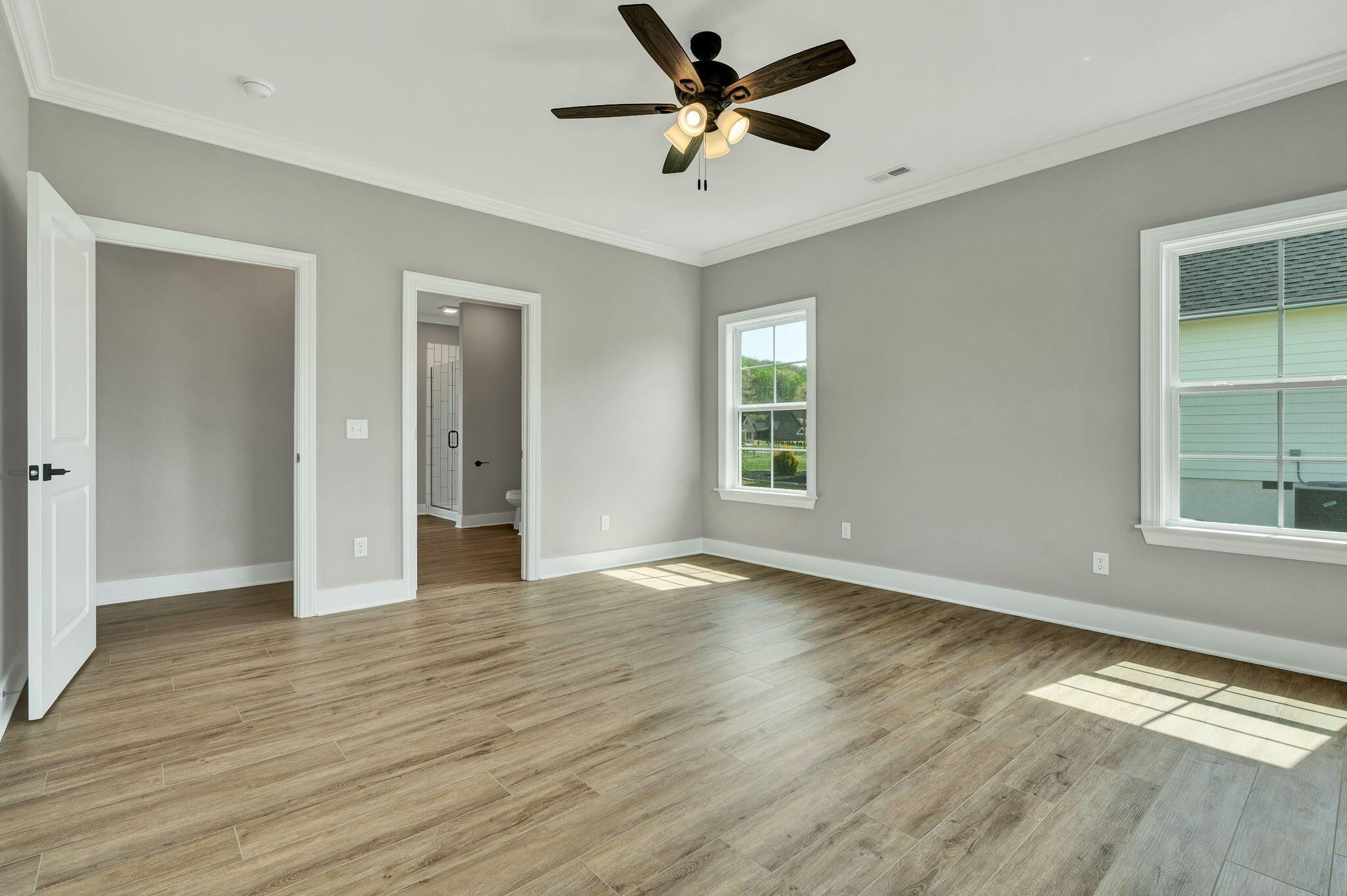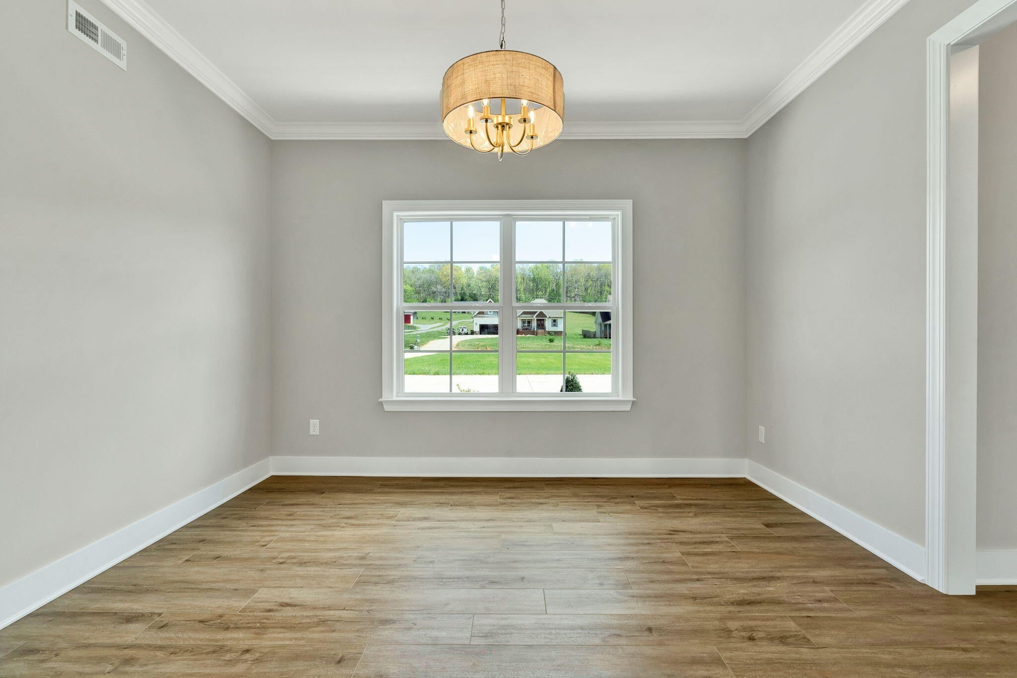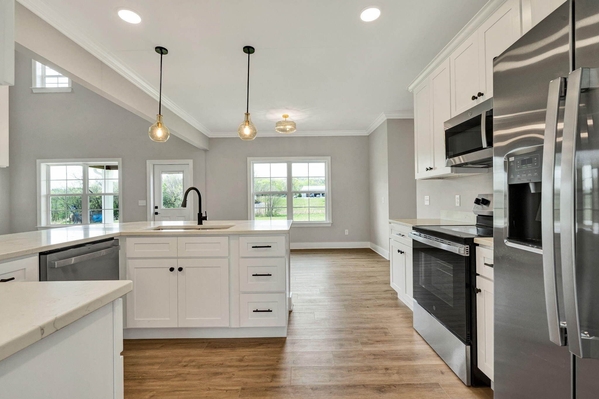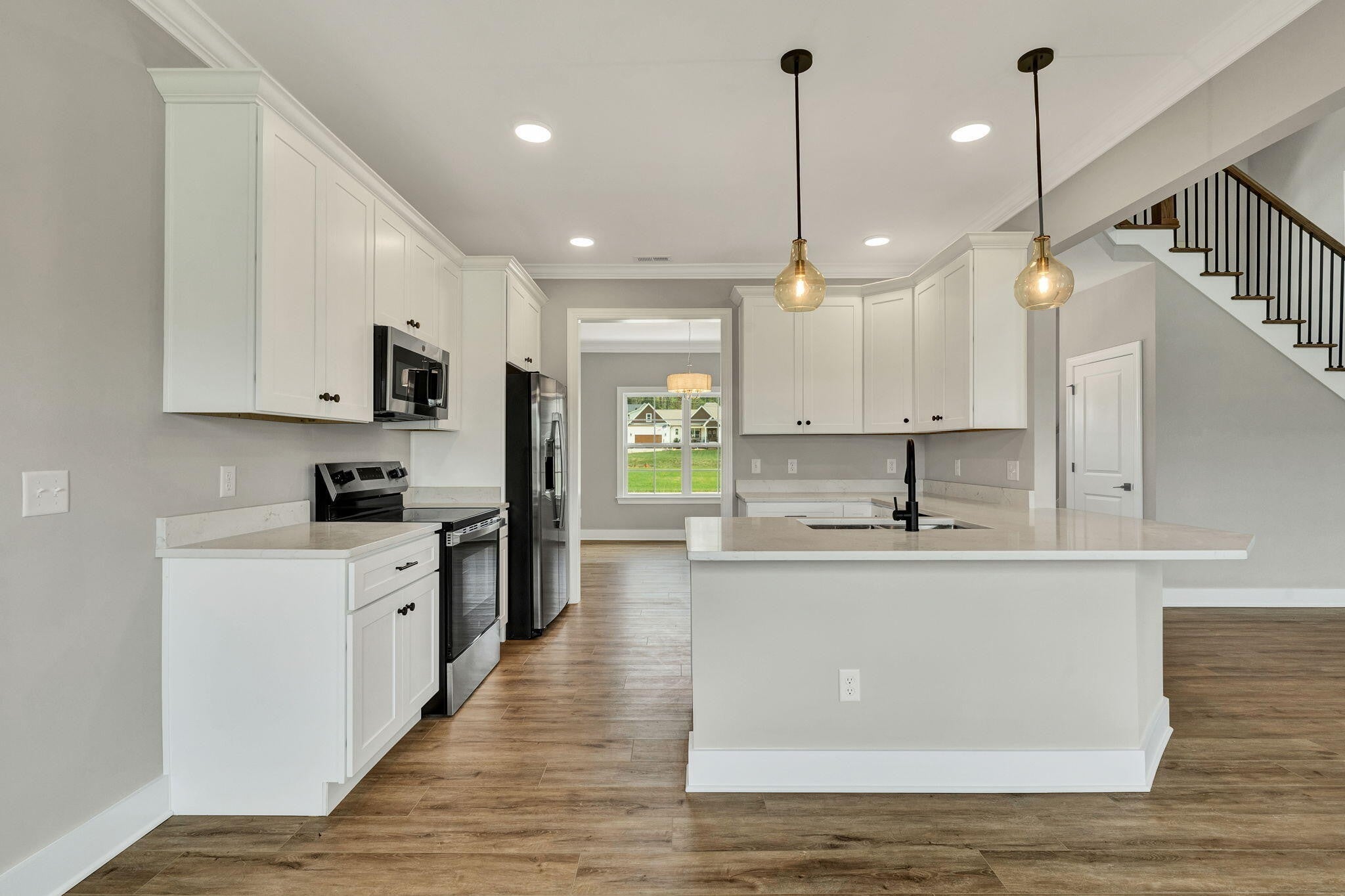 This thoughtfully designed new construction home offers 2,450 sf of refined living space, blending comfort, functionality, and modern style. With 3 bedrooms, 2.5 bathrooms, and a well planned open floor plan, the home creates a bright and inviting atmosphere ideal for both everyday living and entertaining. The main level makes a strong impression with soaring 20 foot ceilings, crown molding, and luxury vinyl flooring that extends throughout the entire home, offering both durability and a cohesive, upscale look. The living area is anchored by a stacked stone electric fireplace, creating a warm and stylish focal point. A separate formal dining room provides an ideal setting for hosting gatherings, holidays, or special occasions. The kitchen is designed to be both functional and visually appealing, featuring quartz countertops, ample cabinetry, and generous workspace for meal preparation. A breakfast bar offers casual seating, while the dedicated breakfast area provides additional space for dining and everyday convenience. The primary suite is located on the main level, offering privacy and ease of access. This spacious retreat includes a large walk in closet and a well appointed en suite bathroom with dual vanities and a walk in tile shower. A generously sized laundry room on the main floor adds to the home's everyday practicality. Upstairs, 2 additional bedrooms and a full bathroom provide comfortable accommodations for family or guests. A large bonus room offers exceptional flexibility and can easily be used as a media room, home office, playroom, or additional living space to suit a variety of needs. Every detail of this home has been designed with livability in mind, offering a balance of open gathering spaces and private areas. With quality craftsmanship, modern finishes, and a versatile layout, this home presents an excellent opportunity for buyers seeking new construction in a well designed and functional space.