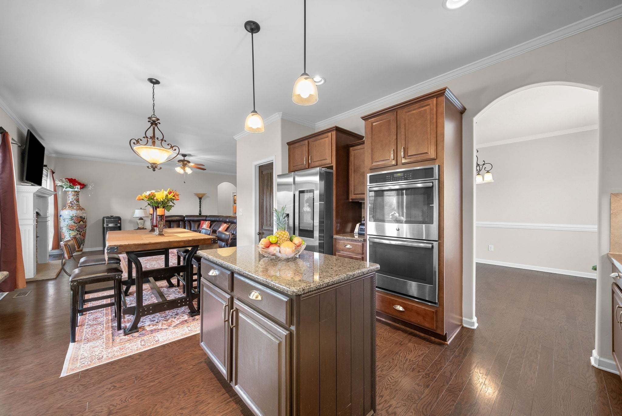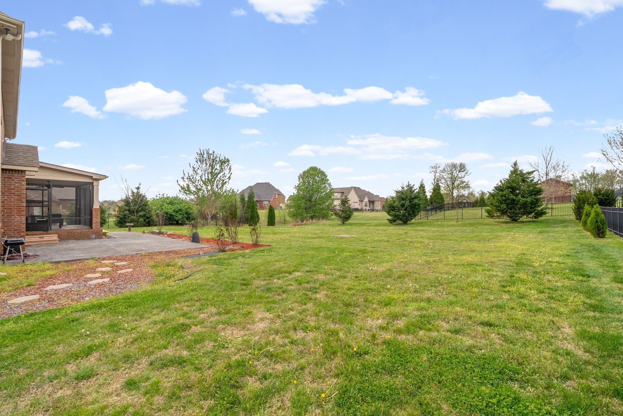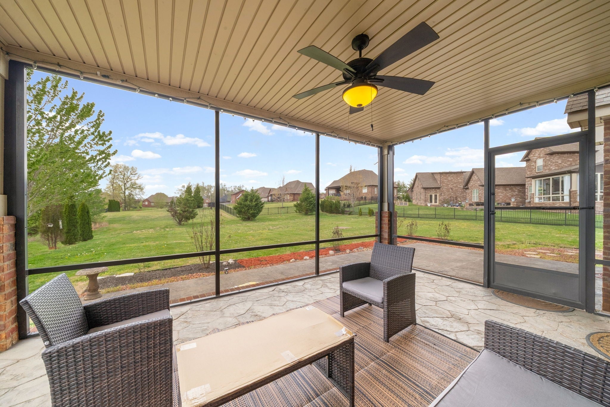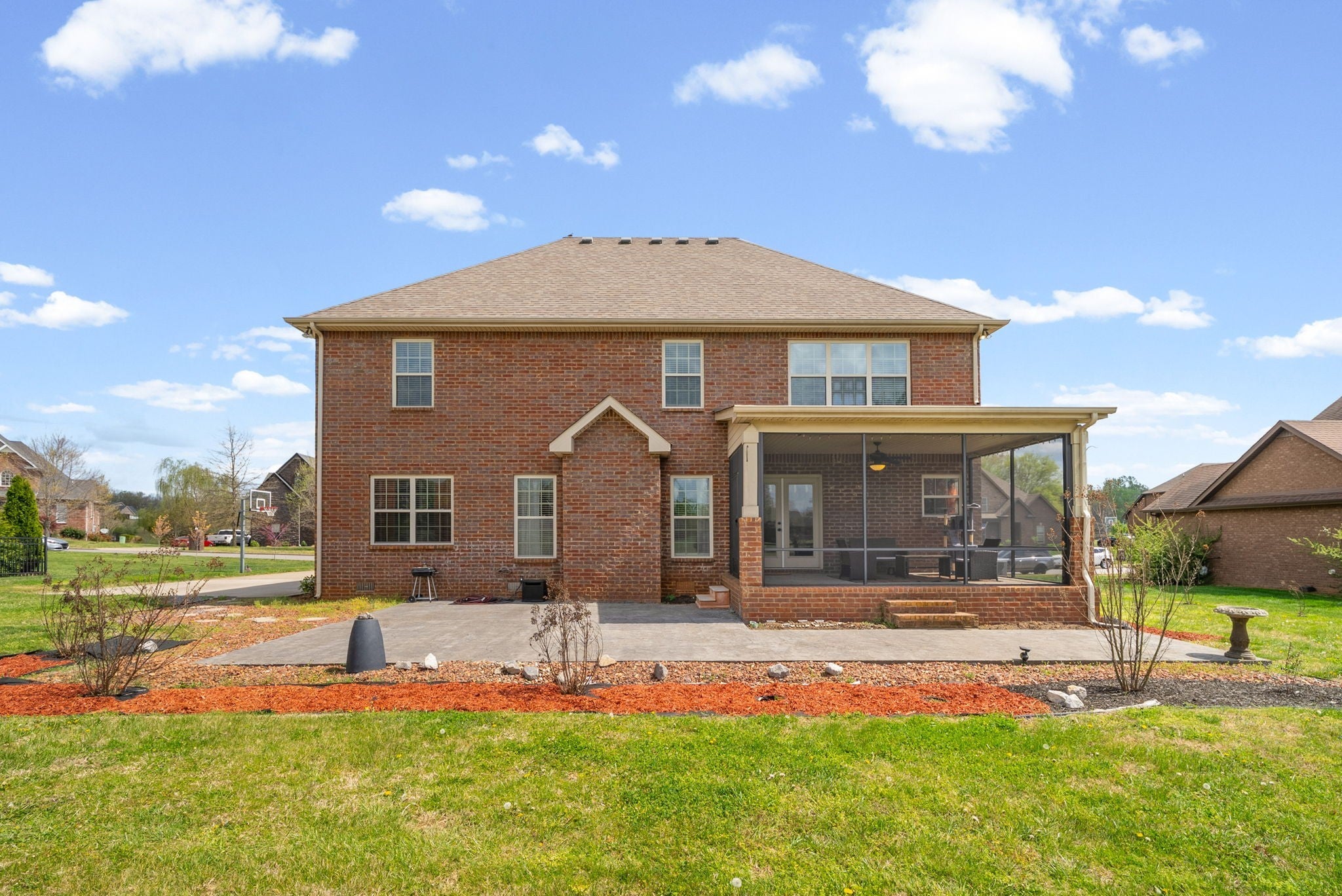 This stunning five-bedroom, three-bathroom home seamlessly blends comfort and style, offering a thoughtfully designed open-concept kitchen with a Samsung Smart Refrigerator and living area centered around a warm, inviting fireplace. The spacious primary suite, located on the second floor, features dual vanities and provides a private retreat for relaxation. On the main level, a well-appointed bedroom with an adjacent full bath offers the perfect accommodation for guests or extended family. In 2021, all carpeting was removed and replaced with beautiful LVP flooring, enhancing both the home’s elegance and durability. Step outside to unwind in the screened-in patio, complete with stamped concrete—an ideal setting for both quiet mornings and evening gatherings. Impeccably flooring. Enjoy relaxing outdoors in your screened in patio with stamped concrete. Vivint home security system valued at $4000 to convey. Smart system to include 2 thermostats, all windows in main floor have sensors, 2 cameras and a control panel. All of the smoke/carbon dioxide detectors through home are all connected to each other and the Vivint system.