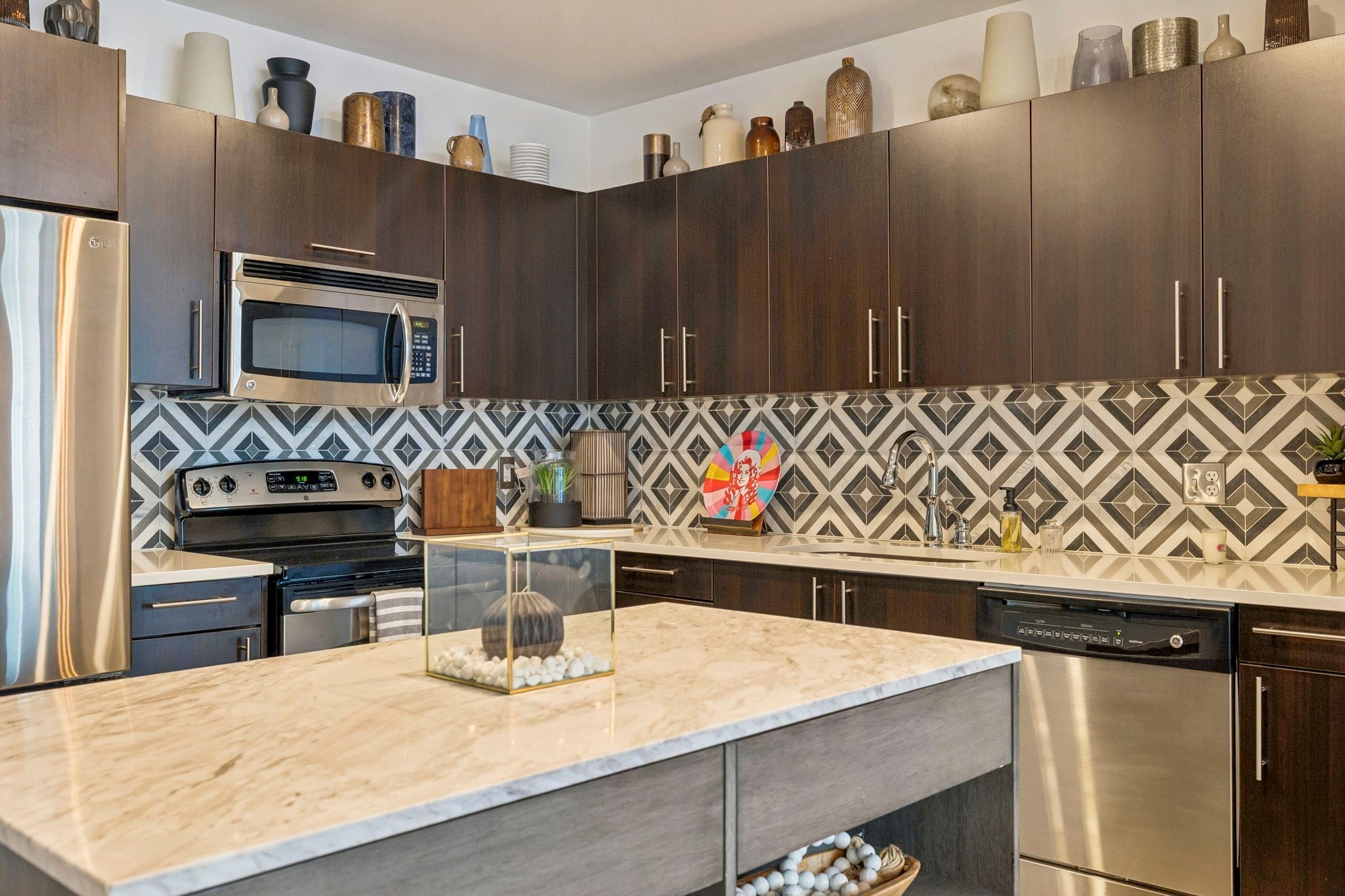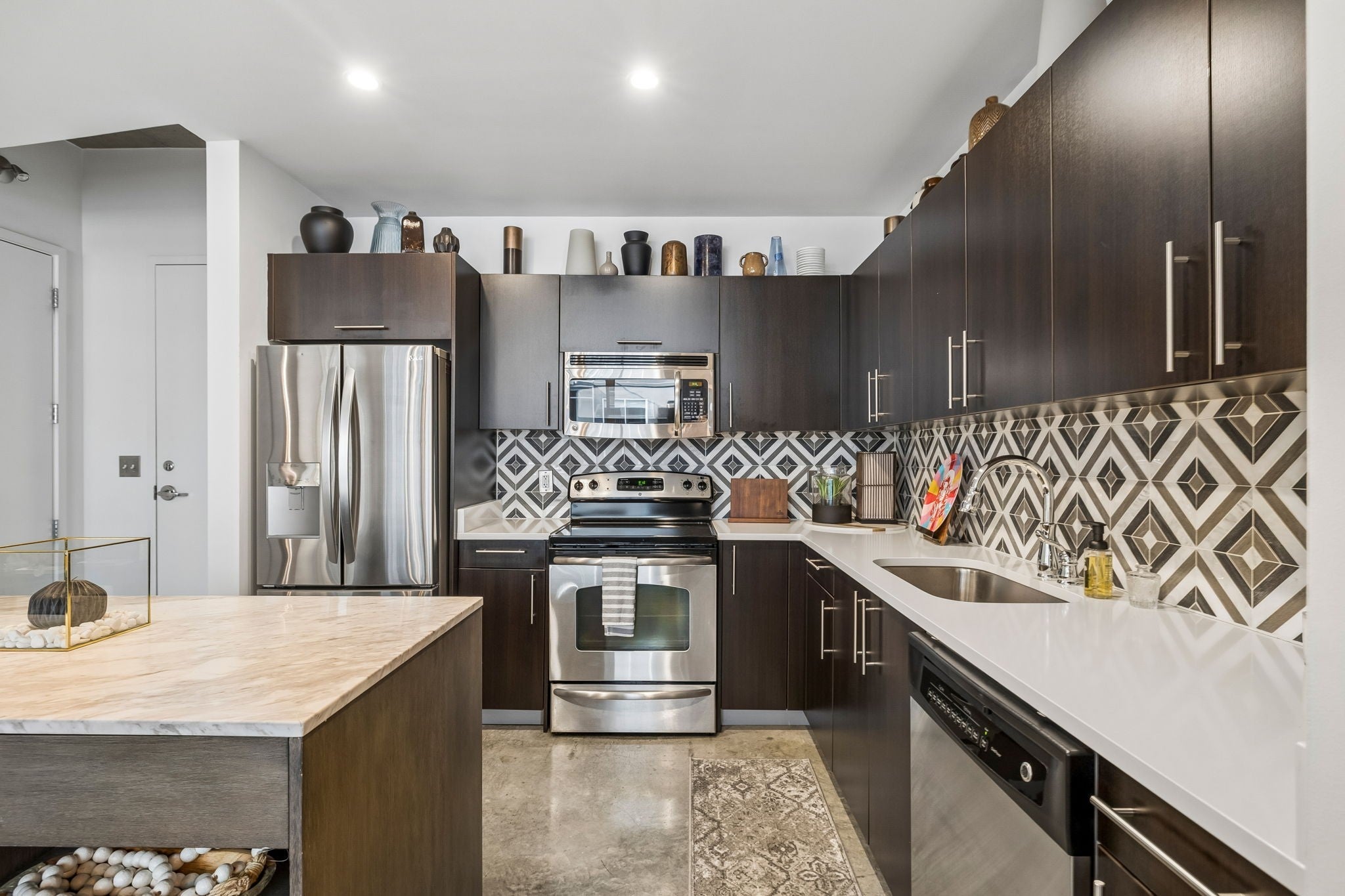 - Electric Oven, Electric Range, Dishwasher, Dryer, Freezer, Ice Maker, Microwave, Refrigerator, Stainless Steel Appliance(s), Washer