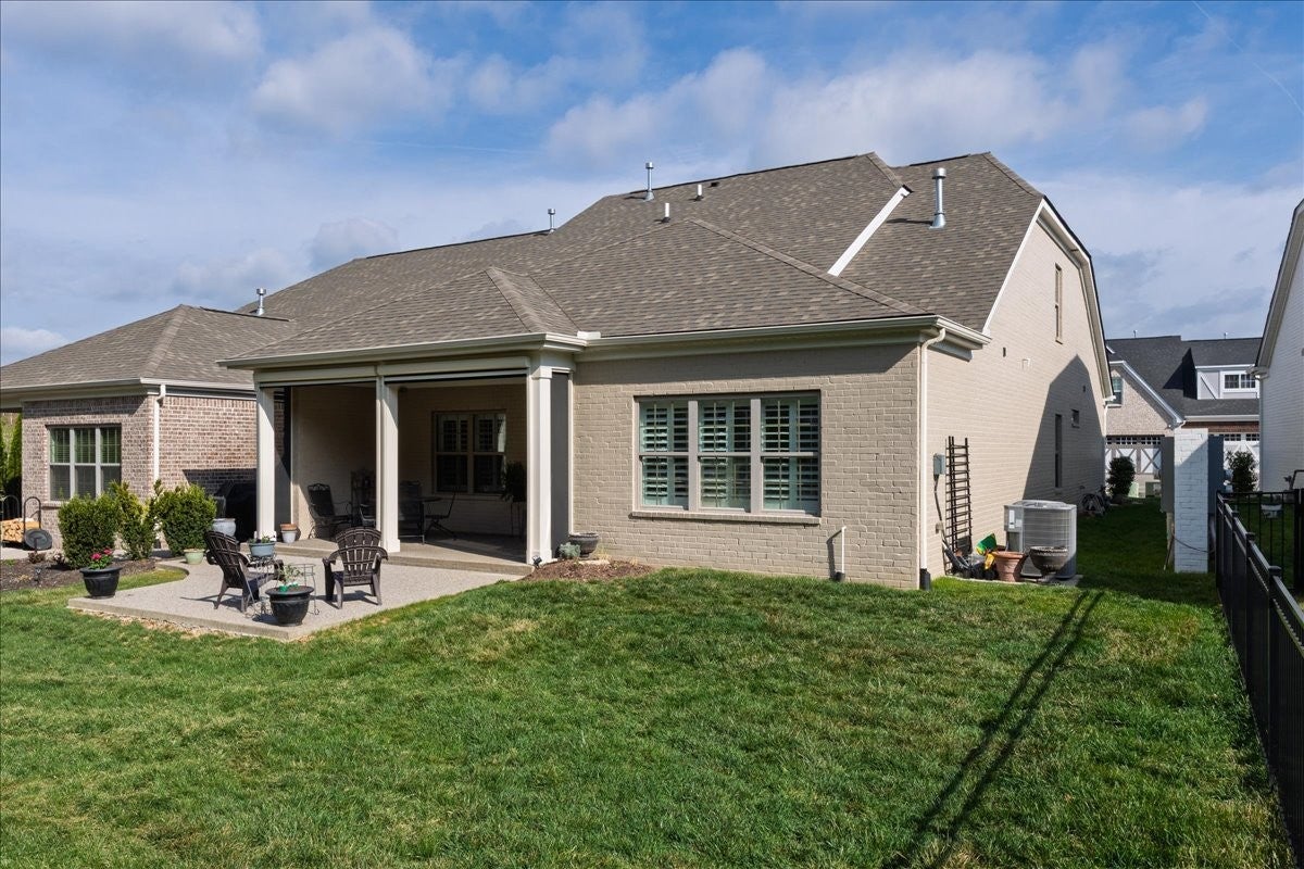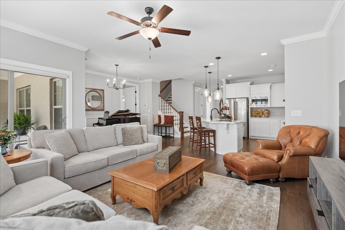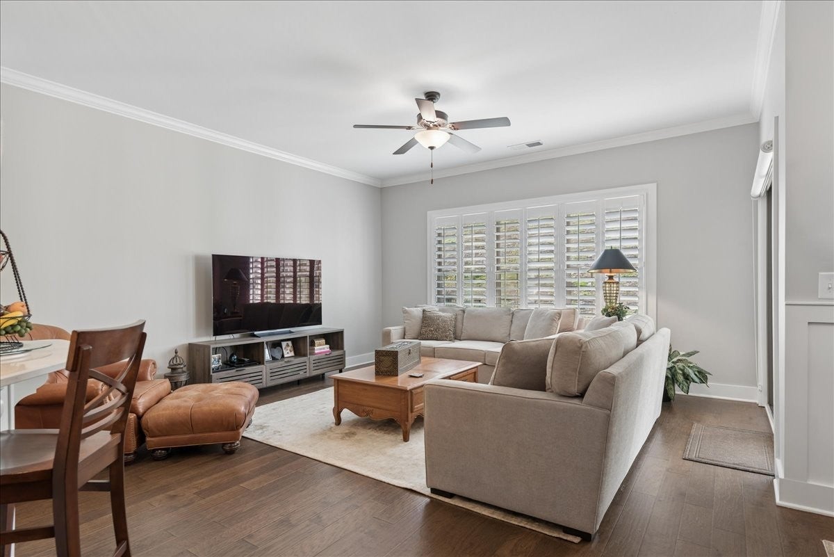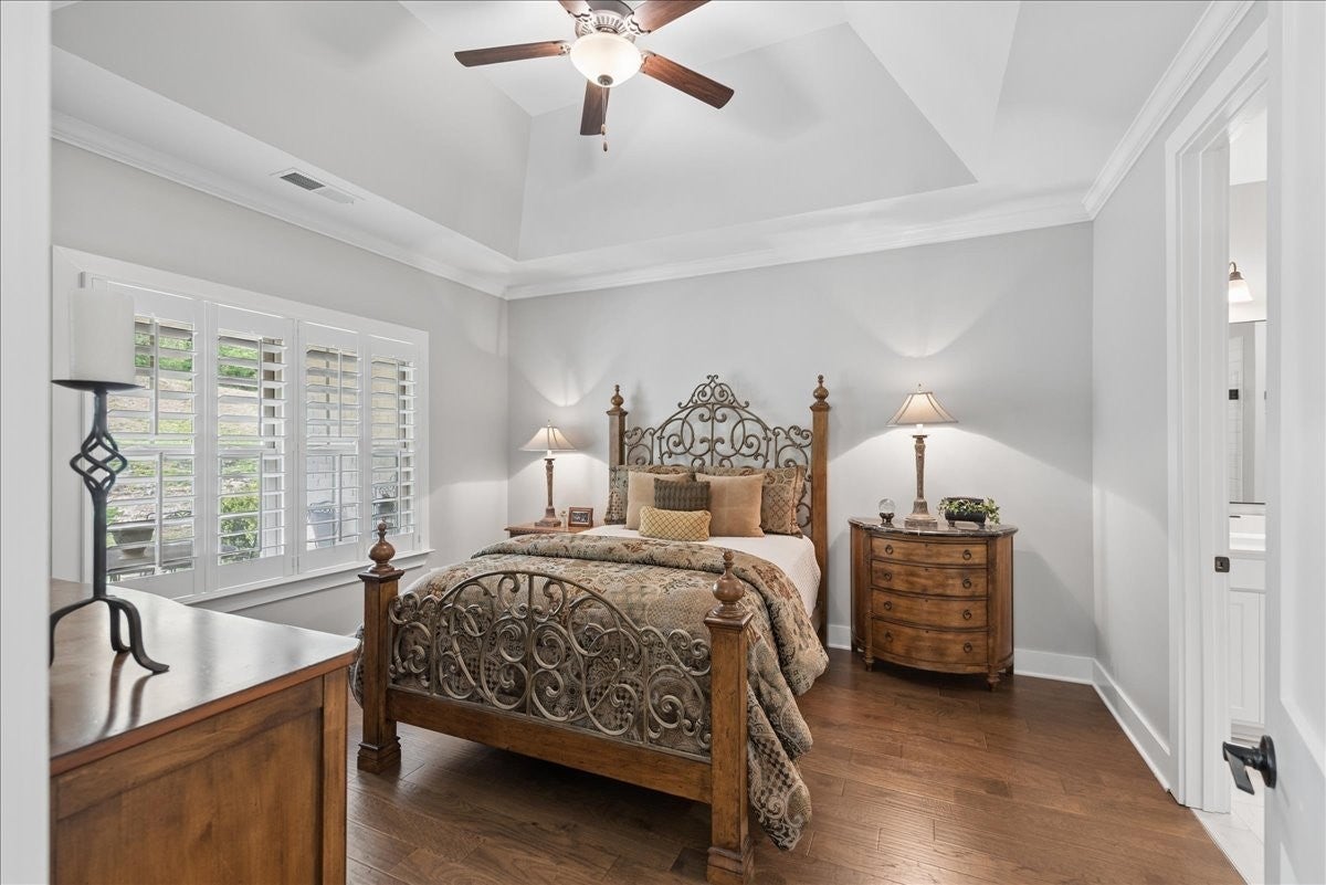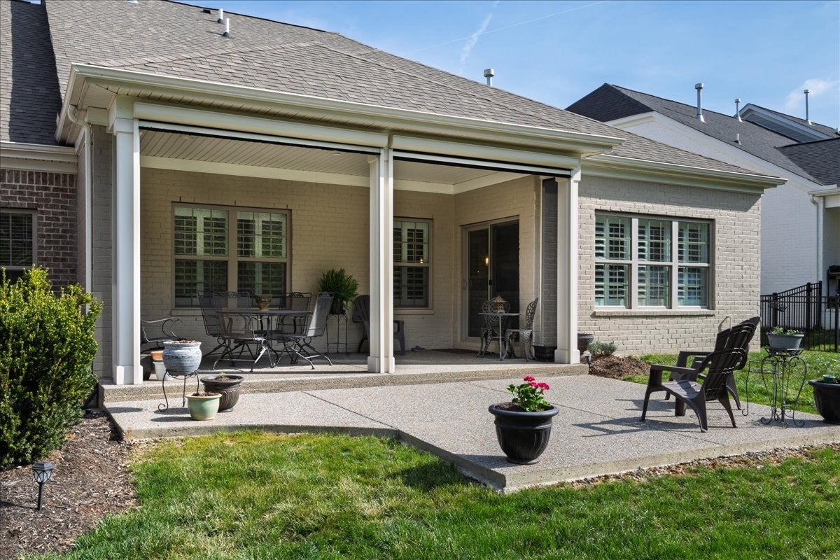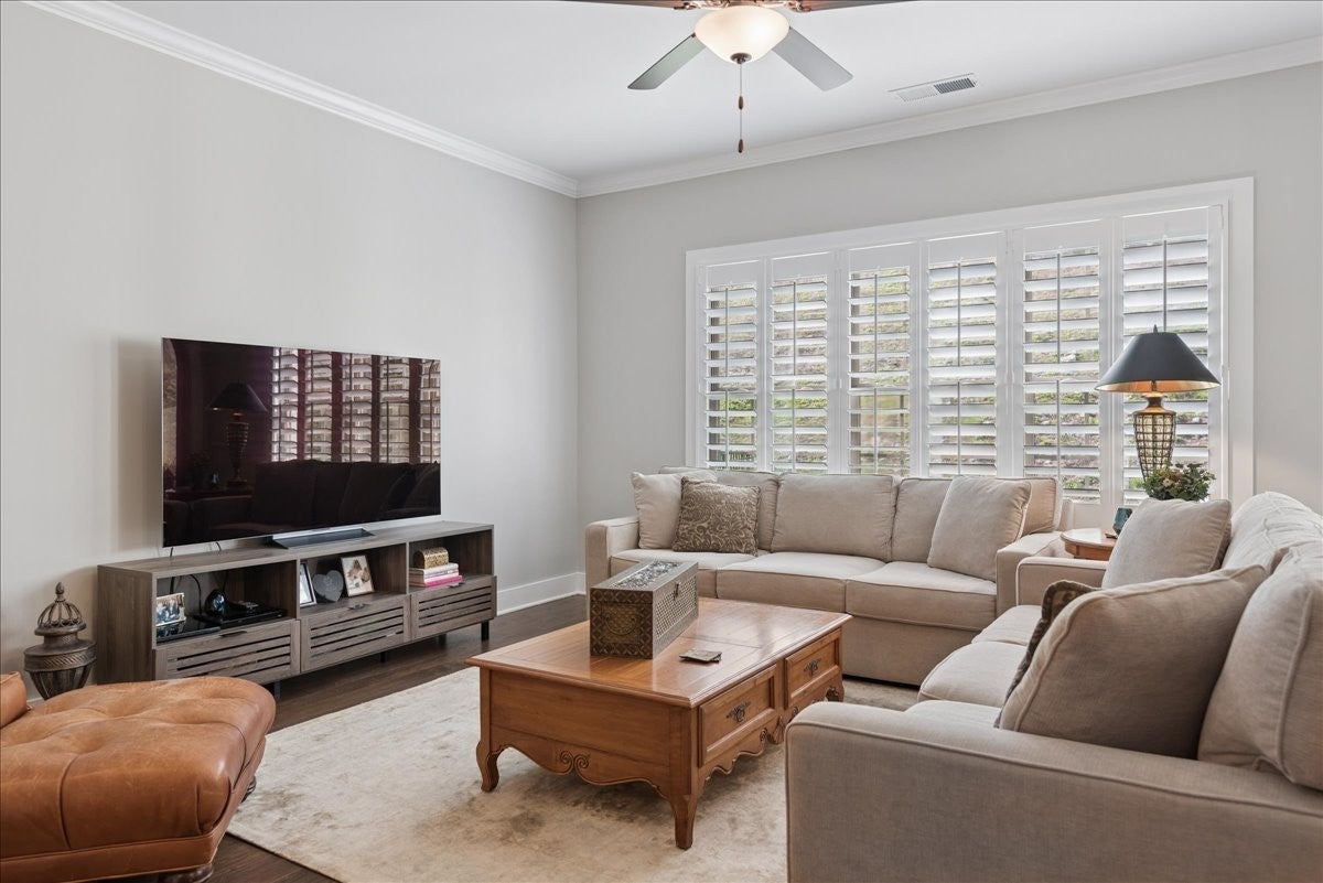 Welcome to this beautifully upgraded home in the highly desirable Millstone community, where luxury finishes and thoughtful details create a truly move-in-ready home. The main level features hardwood flooring throughout, 8-foot doors, craftsman trim, crown molding, and elegant archways. A private study with French glass doors offers the perfect work-from-home space. The gourmet kitchen is a standout with quartz countertops, glass-front cabinetry, and Frigidaire Gallery appliances including a double oven, built-in microwave, and gas cooktop. The open layout flows into the dining area with added wainscoting and updated lighting, and a spacious living room with ceiling fan. The main-level primary suite offers a tray ceiling, spa-like bath with dual vanities, cultured marble countertops, and a tiled walk-in shower with frameless glass door. Ceramic tile flooring is featured in all bathrooms and laundry. Upstairs includes a fully finished second level with full bath—ideal as a private 3rd (or even 4th) bedroom suite with easy access to a hall closet, or perfect for guests, bonus space, or a secluded retreat—plus attic storage. Since purchase, upgrades include plantation shutters, smart recessed lighting, remote patio screens, sealed aggregate exterior surfaces, fresh interior paint, updated fixtures, added shelving, Ring doorbell, and keyless entry. Enjoy the covered patio pre-wired for a ceiling fan, plus a second uncovered aggregate patio—perfect for relaxing or entertaining. This meticulously maintained home offers low-maintenance living with high-end upgrades—Don’t miss it!