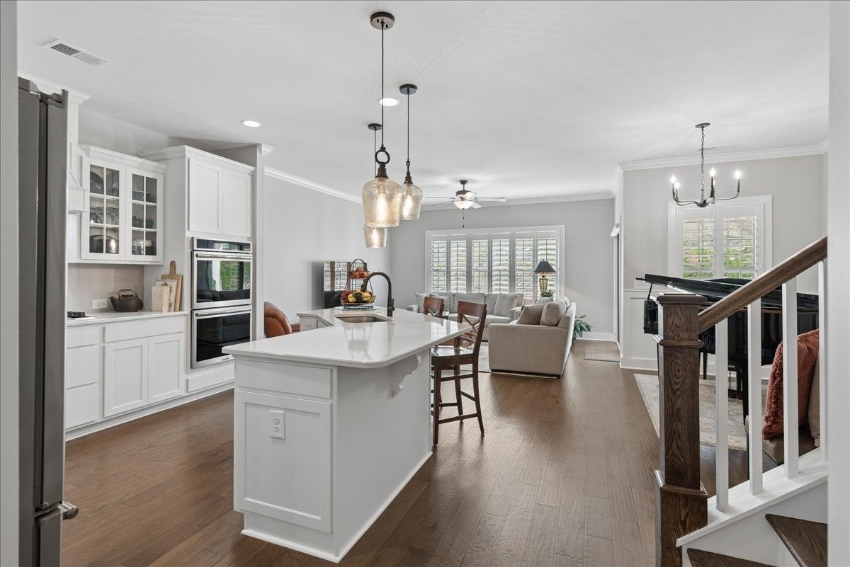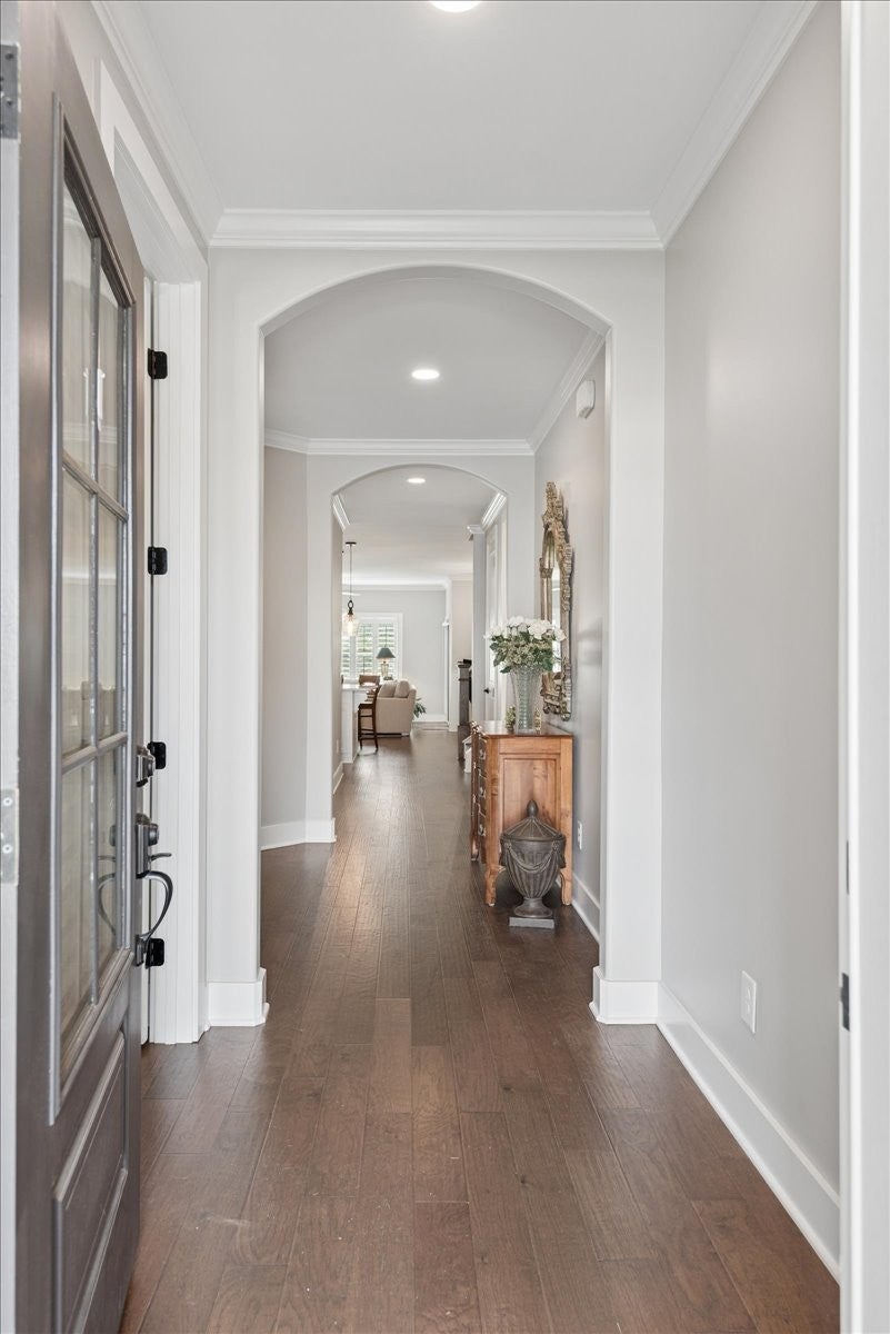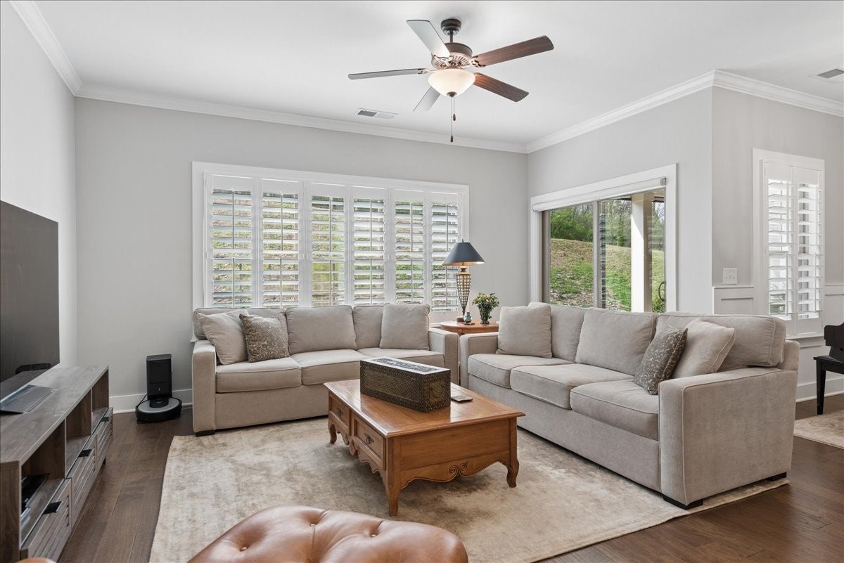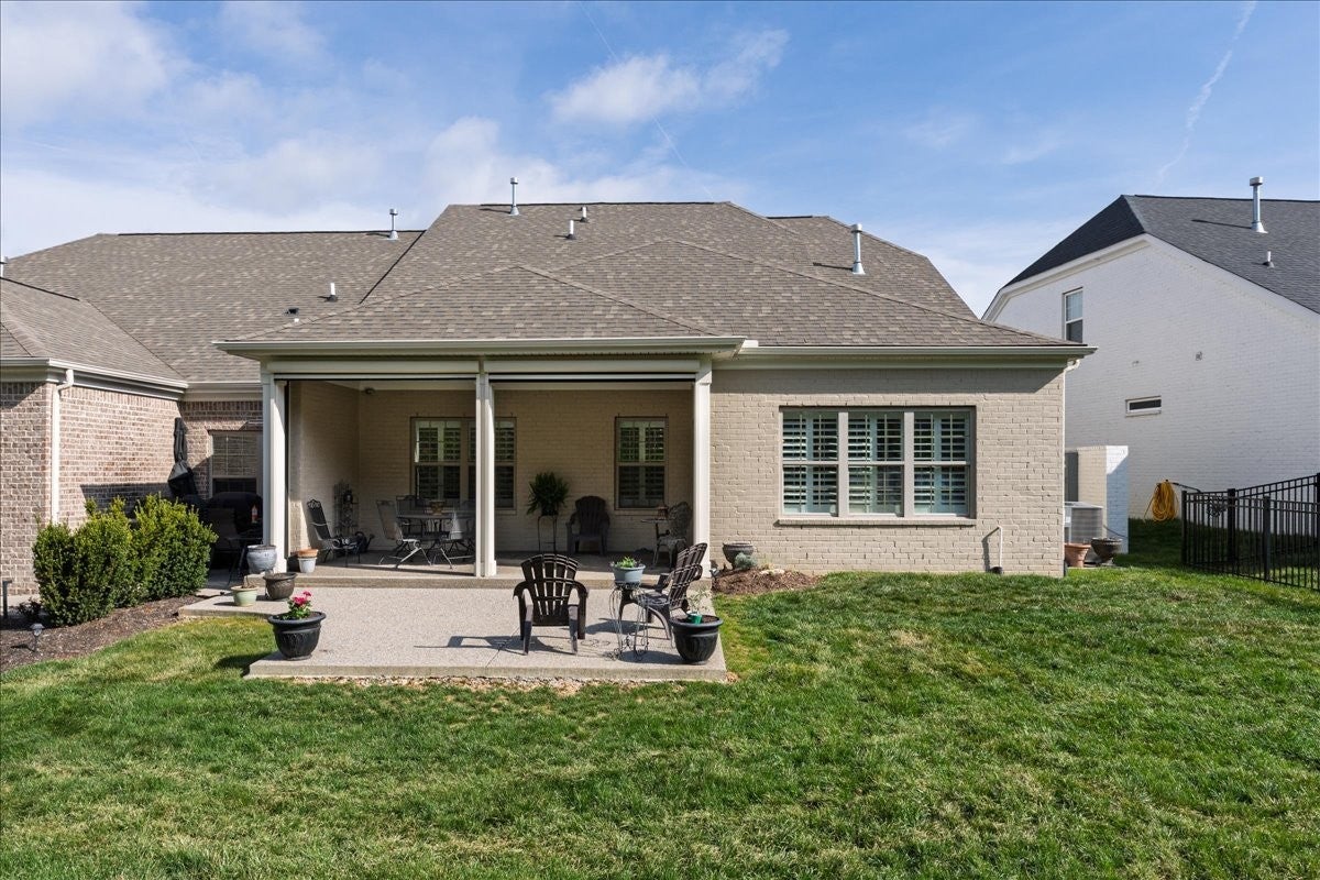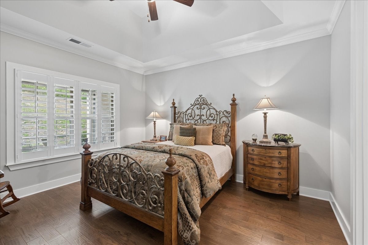 Welcome to this beautifully upgraded home in the highly desirable Millstone community, where luxury finishes and thoughtful details create a truly move-in-ready home. The main level features hardwood flooring throughout, 8-foot doors, craftsman trim, crown molding, and elegant archways. A private study with French glass doors offers the perfect work-from-home space. The gourmet kitchen is a standout with quartz countertops, glass-front cabinetry, and Frigidaire Gallery appliances including a double oven, built-in microwave, and gas cooktop. The open layout flows into the dining area with added wainscoting and updated lighting, and a spacious living room with ceiling fan. The main-level primary suite offers a tray ceiling, spa-like bath with dual vanities, cultured marble countertops, and a tiled walk-in shower with frameless glass door. Ceramic tile flooring is featured in all bathrooms and laundry. Upstairs includes a fully finished second level with full bath—ideal as a private 3rd (or even 4th) bedroom suite with easy access to a hall closet, or perfect for guests, bonus space, or a secluded retreat—plus attic storage. Since purchase, upgrades include plantation shutters, smart recessed lighting, remote patio screens, sealed aggregate exterior surfaces, fresh interior paint, updated fixtures, added shelving, Ring doorbell, and keyless entry. Enjoy the covered patio pre-wired for a ceiling fan, plus a second uncovered aggregate patio—perfect for relaxing or entertaining. This meticulously maintained home offers low-maintenance living with high-end upgrades—Don’t miss it!