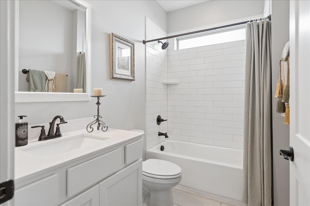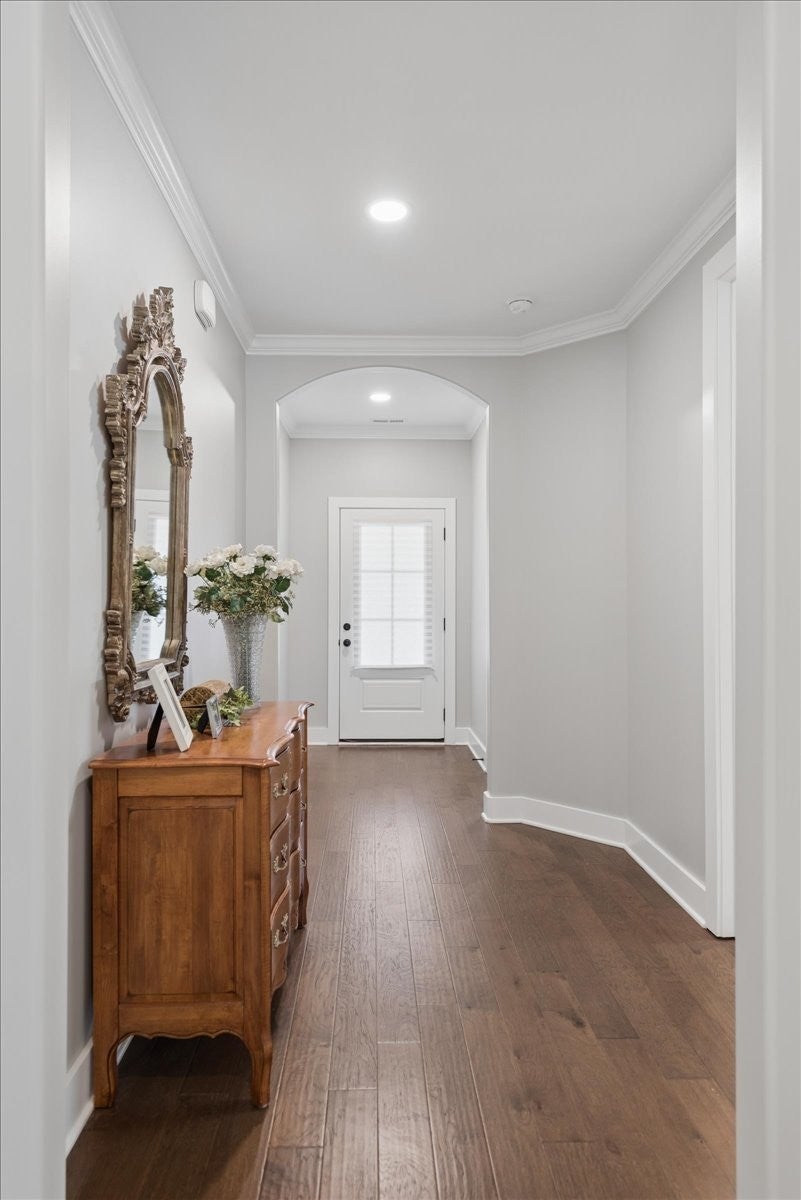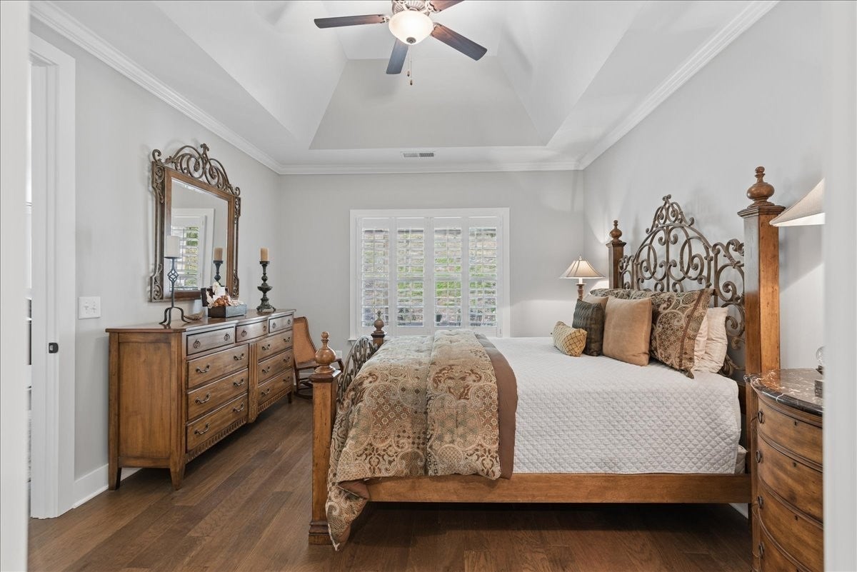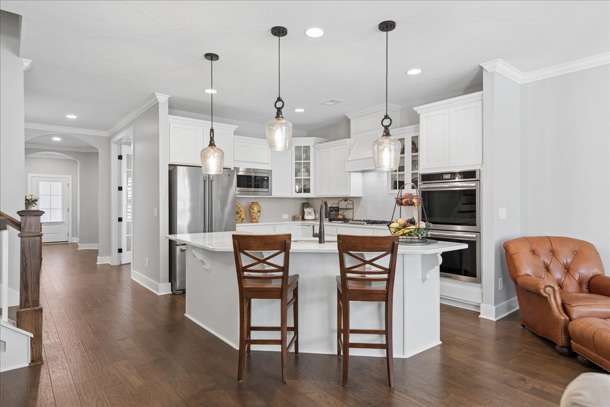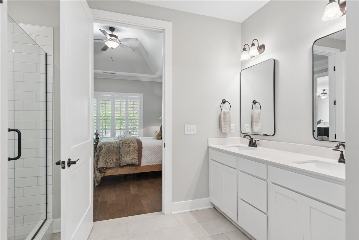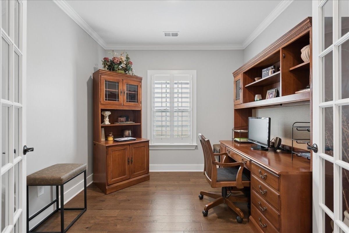 Welcome to this beautifully upgraded home in the highly desirable Millstone community, where luxury finishes and thoughtful details create a truly move-in-ready home. The main level features hardwood flooring throughout, 8-foot doors, craftsman trim, crown molding, and elegant archways. A private study with French glass doors offers the perfect work-from-home space. The gourmet kitchen is a standout with quartz countertops, glass-front cabinetry, and Frigidaire Gallery appliances including a double oven, built-in microwave, and gas cooktop. The open layout flows into the dining area with added wainscoting and updated lighting, and a spacious living room with ceiling fan. The main-level primary suite offers a tray ceiling, spa-like bath with dual vanities, cultured marble countertops, and a tiled walk-in shower with frameless glass door. Ceramic tile flooring is featured in all bathrooms and laundry. Upstairs includes a fully finished second level with full bath—ideal as a private 3rd (or even 4th) bedroom suite with easy access to a hall closet, or perfect for guests, bonus space, or a secluded retreat—plus attic storage. Since purchase, upgrades include plantation shutters, smart recessed lighting, remote patio screens, sealed aggregate exterior surfaces, fresh interior paint, updated fixtures, added shelving, Ring doorbell, and keyless entry. Enjoy the covered patio pre-wired for a ceiling fan, plus a second uncovered aggregate patio—perfect for relaxing or entertaining. This meticulously maintained home offers low-maintenance living with high-end upgrades—Don’t miss it!