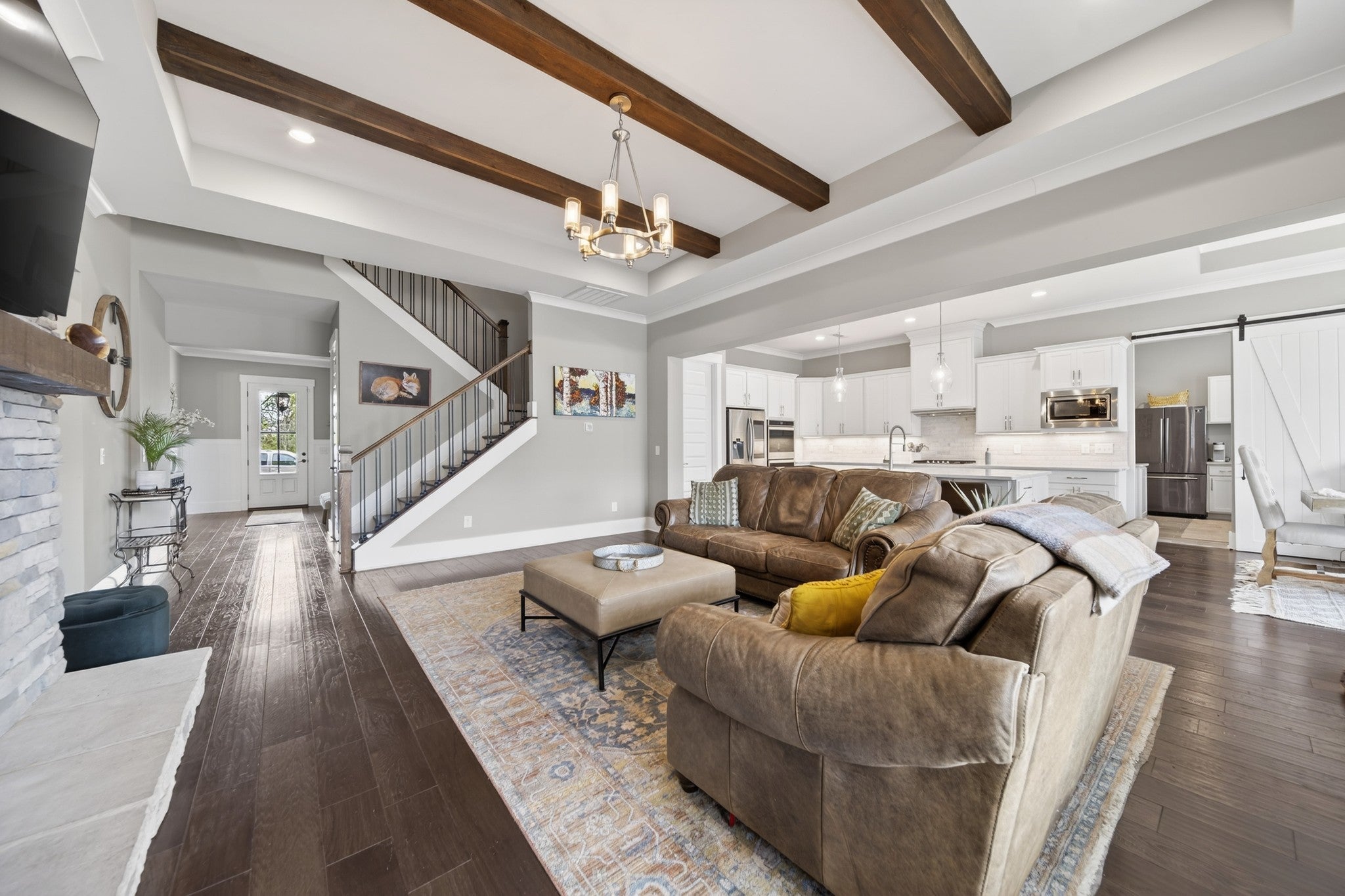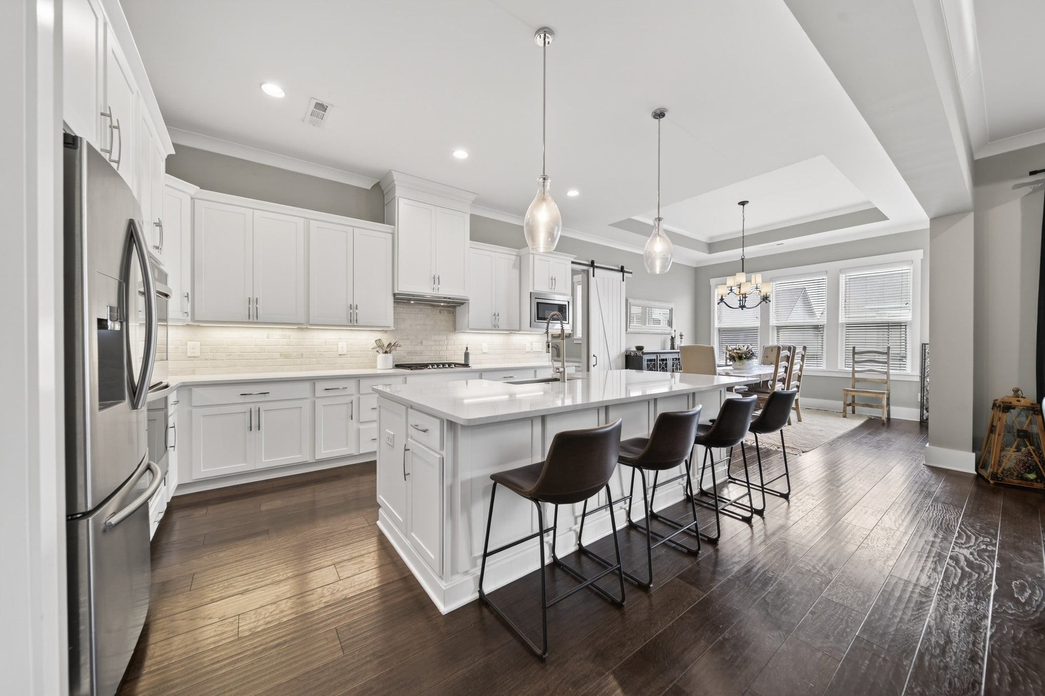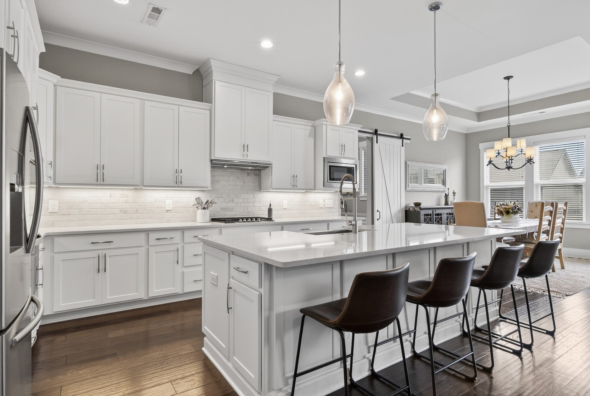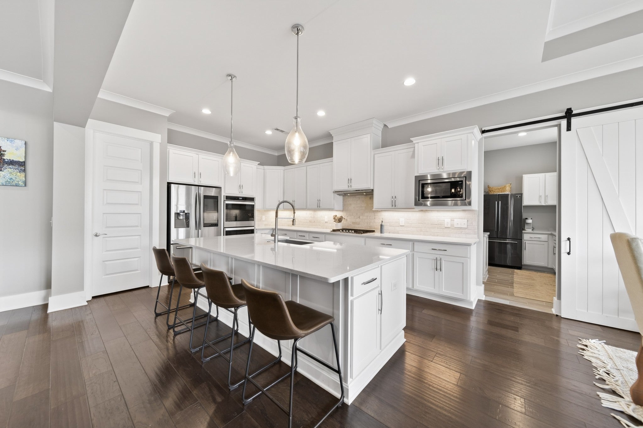 Impeccably maintained, all-brick home, gracefully positioned on one of the larger lots/homesites in Hendersonville's premier luxury enclave, Durham Farms. Thoughtfully designed with refined finishes and timeless style, this residence offers an exceptional open concept layout with expansive living and entertaining spaces throughout. The gourmet chef's kitchen is both stunning and functional, appointed with premium stainless steel appliances, double ovens, an oversized island, and walk-in pantry. An additional "second kitchen" utility room with full size refrigerator, tons of cabinets and work island is adjoined thru a sliding barn door...all seamlessly flowing into the dining area and the grand living room, which features coffered ceilings, custom floating shelves and a showplace 10 ft. floor to ceiling stone gas fireplace. There is a an additional office on the main level and a large bonus room upstairs on the 2nd level with walk-in storage. The home offers four generously sized bedrooms, each with its own private en-suite bath and large walk-in closet, ensuring both comfort and privacy. The main level hosts two bedrooms, including the sizable primary retreat with patio walk-out door, a custom designed closet, spa-like bath, designer tile shower, and dual vanities. Outdoor living includes beautifully landscaped grounds, inground irrigation system, a fully fenced private backyard, two covered porches and a an inviting patio, perfect for relaxing or grilling out. Residents of Durham Farms enjoy resort - style amenities including an elegant clubhouse, pool, state of the art fitness center, scenic walking trails, green spaces, and dog parks-all just a short drive to downtown Nashville. This home blends luxury, space and convenience in one exceptional package.