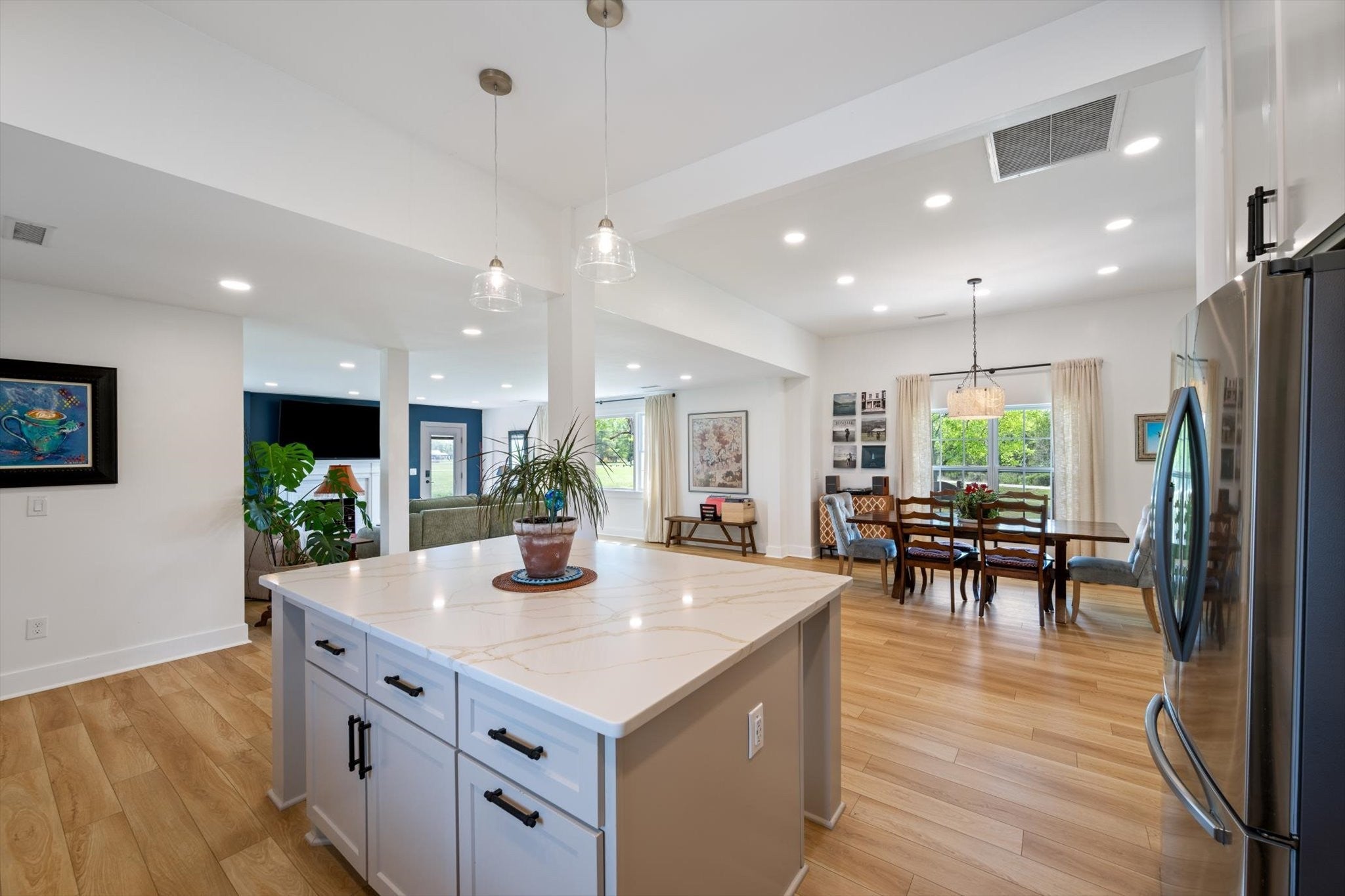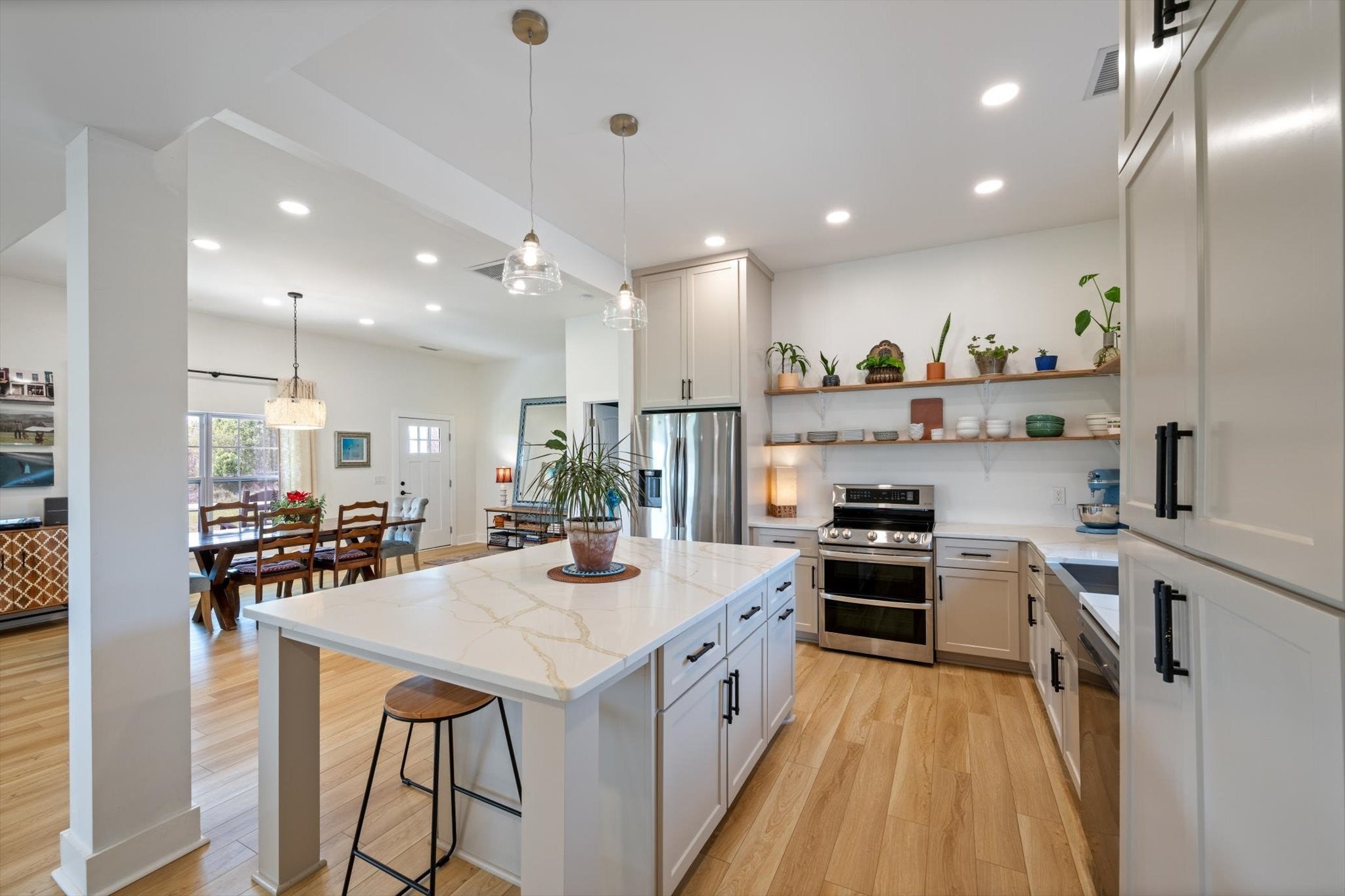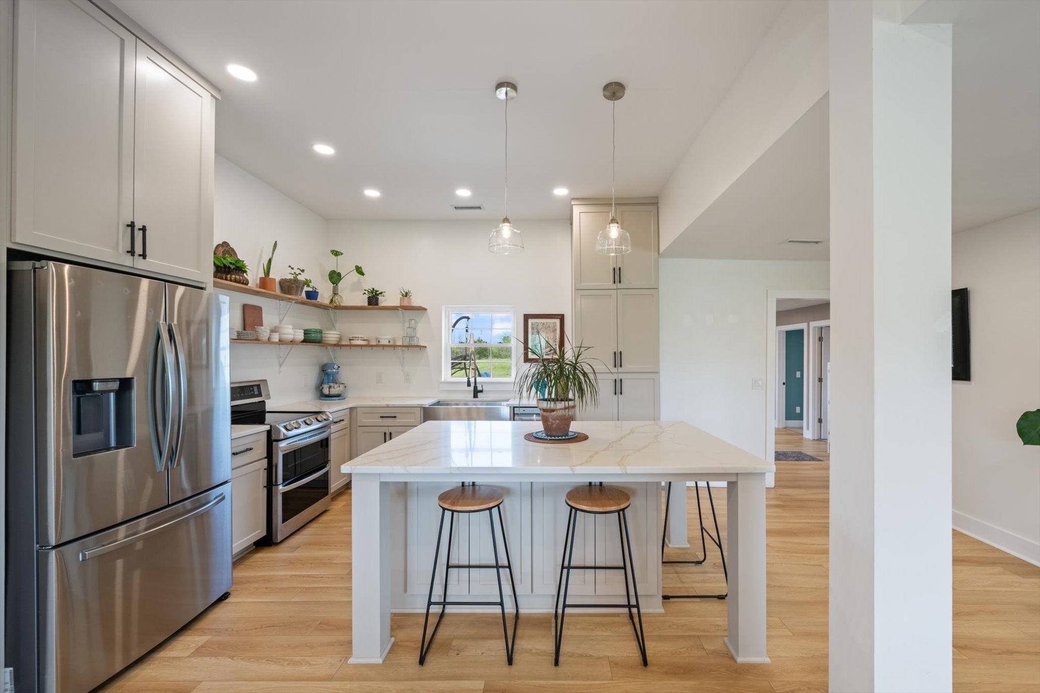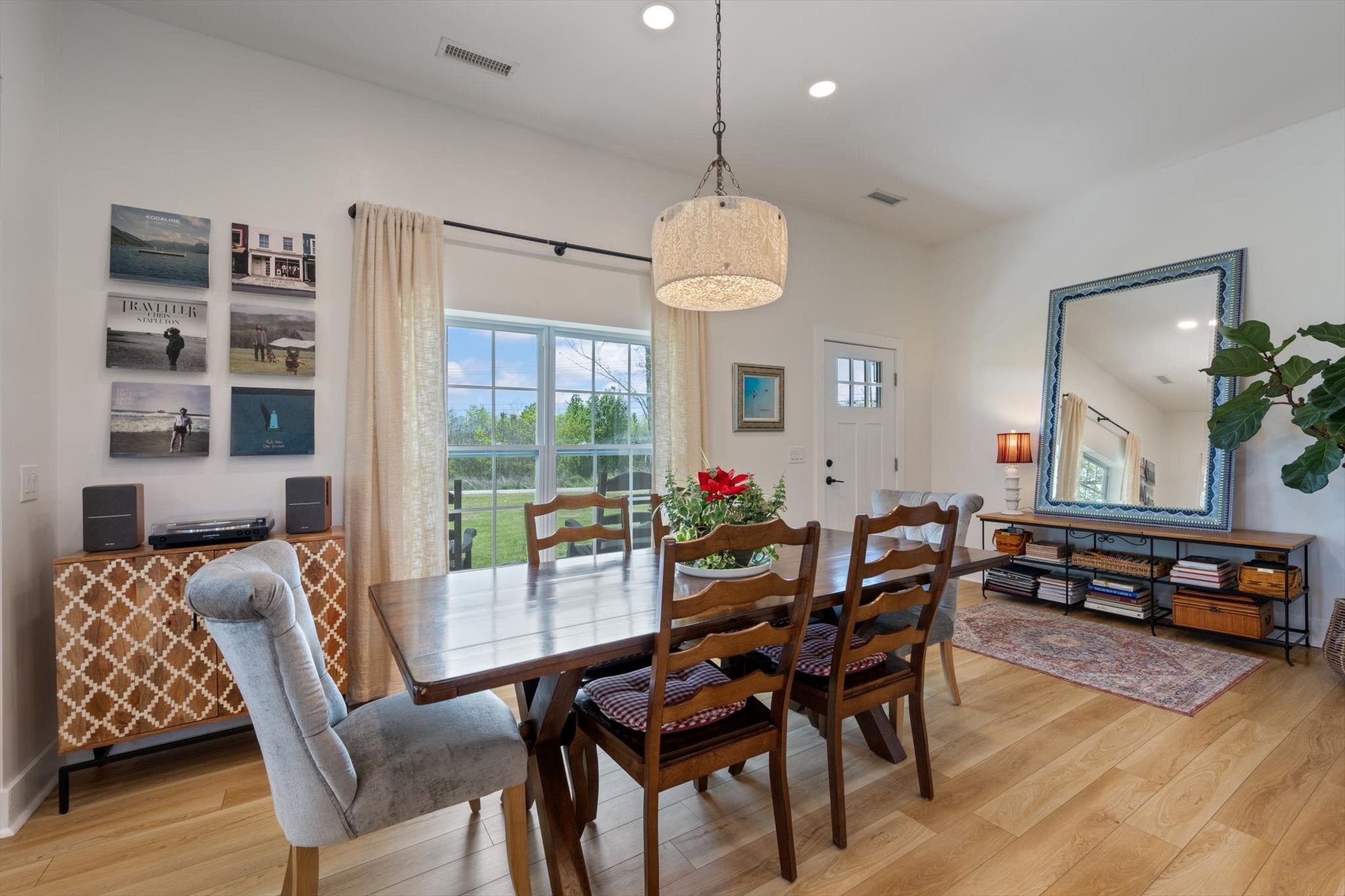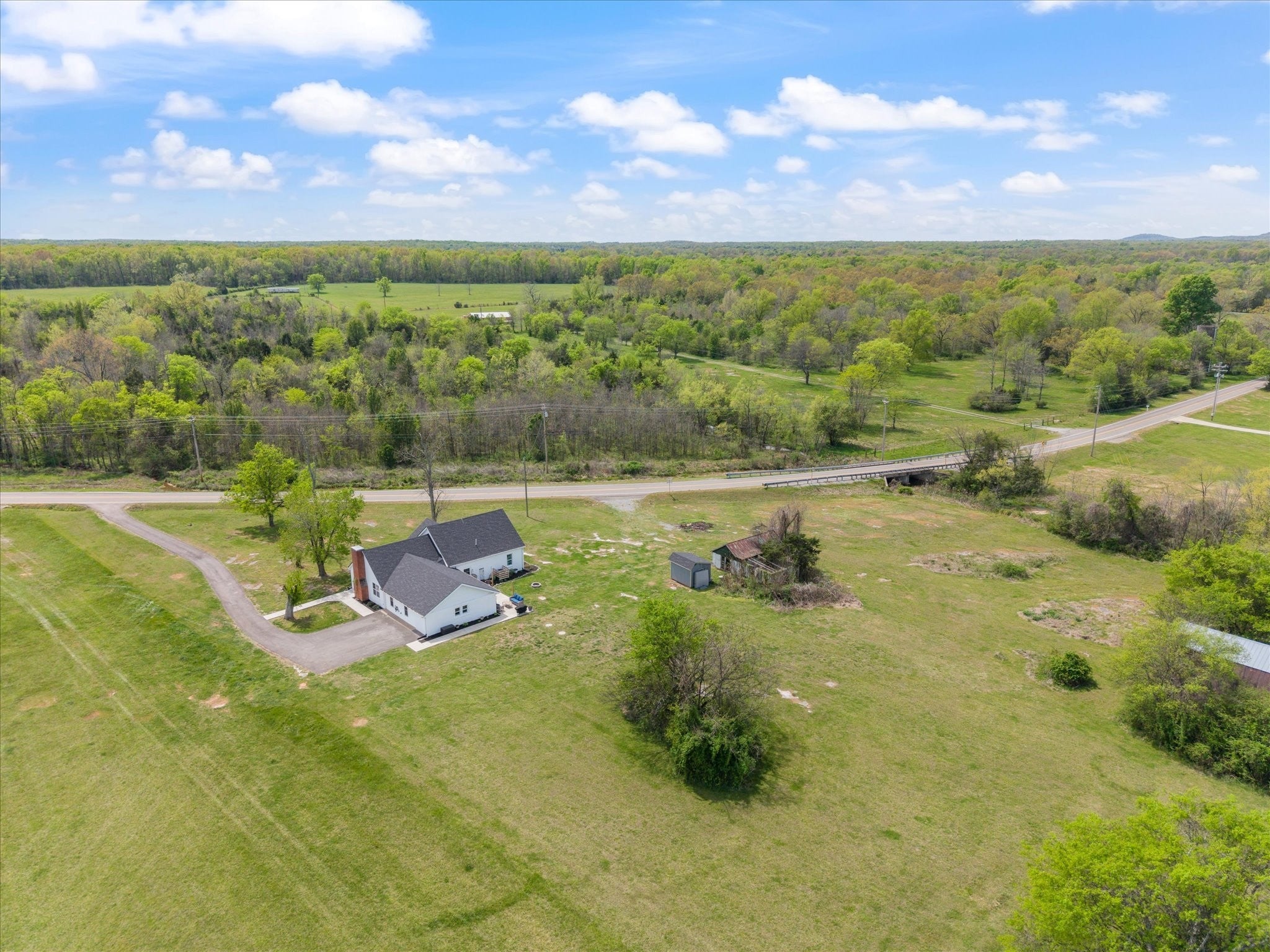 Country charm meets modern living on a beautifully renovated one-level farmhouse set on a mix of cleared and wooded acreage, offering peaceful surroundings with convenient access to city amenities. This 3-bedroom, 2-bath home has been completely remodeled with multiple upgrades throughout, showcasing quality craftsmanship and thoughtful design at every turn. The layout includes a spacious primary suite with a private en suite bath, creating a comfortable and functional retreat. The home showcases an open-concept living design, complemented by an eat-in kitchen with all the upgrades and dedicated formal dining room, providing flexibility for both casual meals and more formal gatherings. The home features two additional bedrooms, an office nook, and flex/utility space. A separate media room adds additional space for entertainment or relaxation. Outdoors, the property truly shines with a creek, established walking paths, and ample open space to explore and unwind. The covered front porch provides a welcoming entry, while the back patio offers an ideal setting for hosting family and friends. The expansive acreage offers endless possibilities—perfect for ATV riding, trail walking, and enjoying local wildlife—allowing you to truly make the property your own private retreat along with the potential to add a second dwelling. Located just minutes from shopping, dining, and easy interstate access, this home provides the rare opportunity to enjoy serene acreage without sacrificing convenience. Experience the charm of farmhouse living with modern comforts in a truly desirable setting. Ask your favorite realtor for the home renovation list!