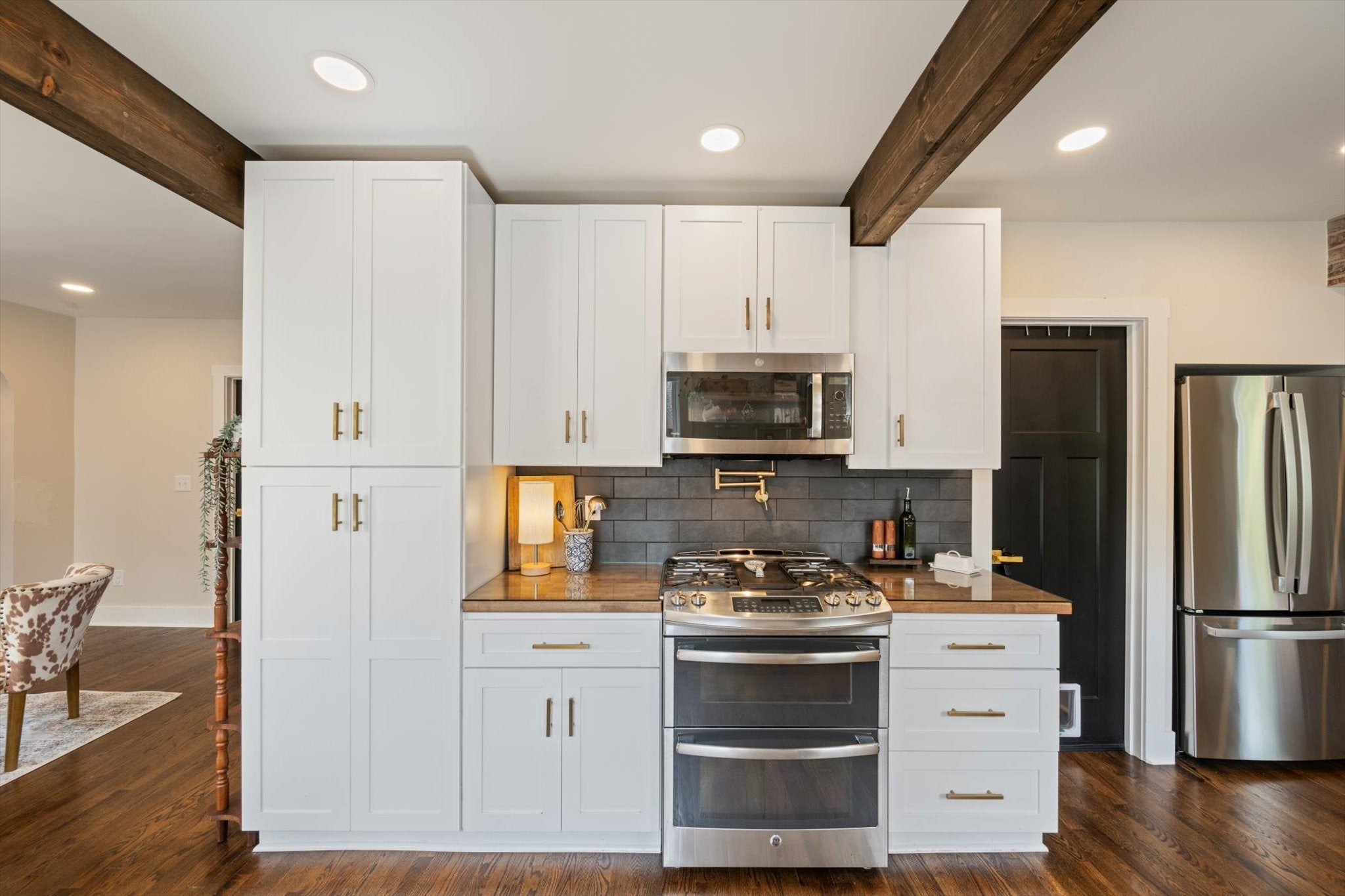 - Electric Oven, Built-In Electric Range, Dishwasher, Microwave, Refrigerator, Stainless Steel Appliance(s)