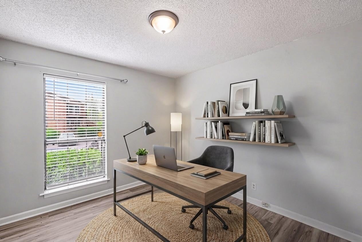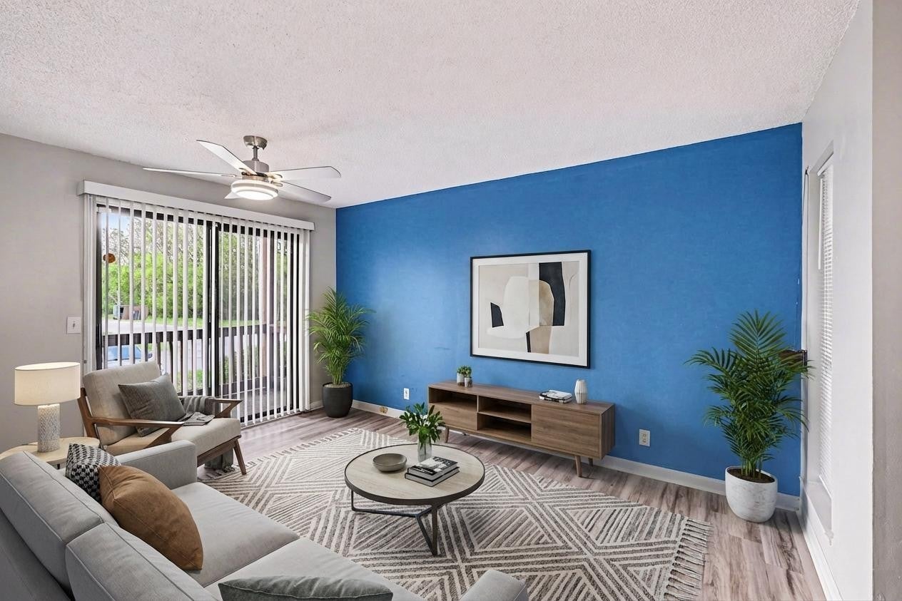Move right into this updated ground-level condo offering easy access and a bright, open-concept layout. Featuring 2 spacious bedrooms and 1 full bath, this home showcases stylish plank flooring throughout the main living areas, including the foyer, dining space, kitchen, and bathroom. The inviting living room includes a ceiling fan and opens directly to a private balcony with peaceful views of the creek and nearby picnic/grilling area. The kitchen is well-equipped with a double ceramic sink, tile backsplash, pantry, and full appliance package including refrigerator, stove, microwave, and dishwasher. Both bedrooms are generously sized with oversized double closets, while the updated bathroom offers a separate vanity area and tub/shower combo with upgraded fixtures. Additional highlights include a conveniently located utility area, security system, newer large-capacity water heater, and modern paint colors throughout. A standard door knob will be installed prior to closing.