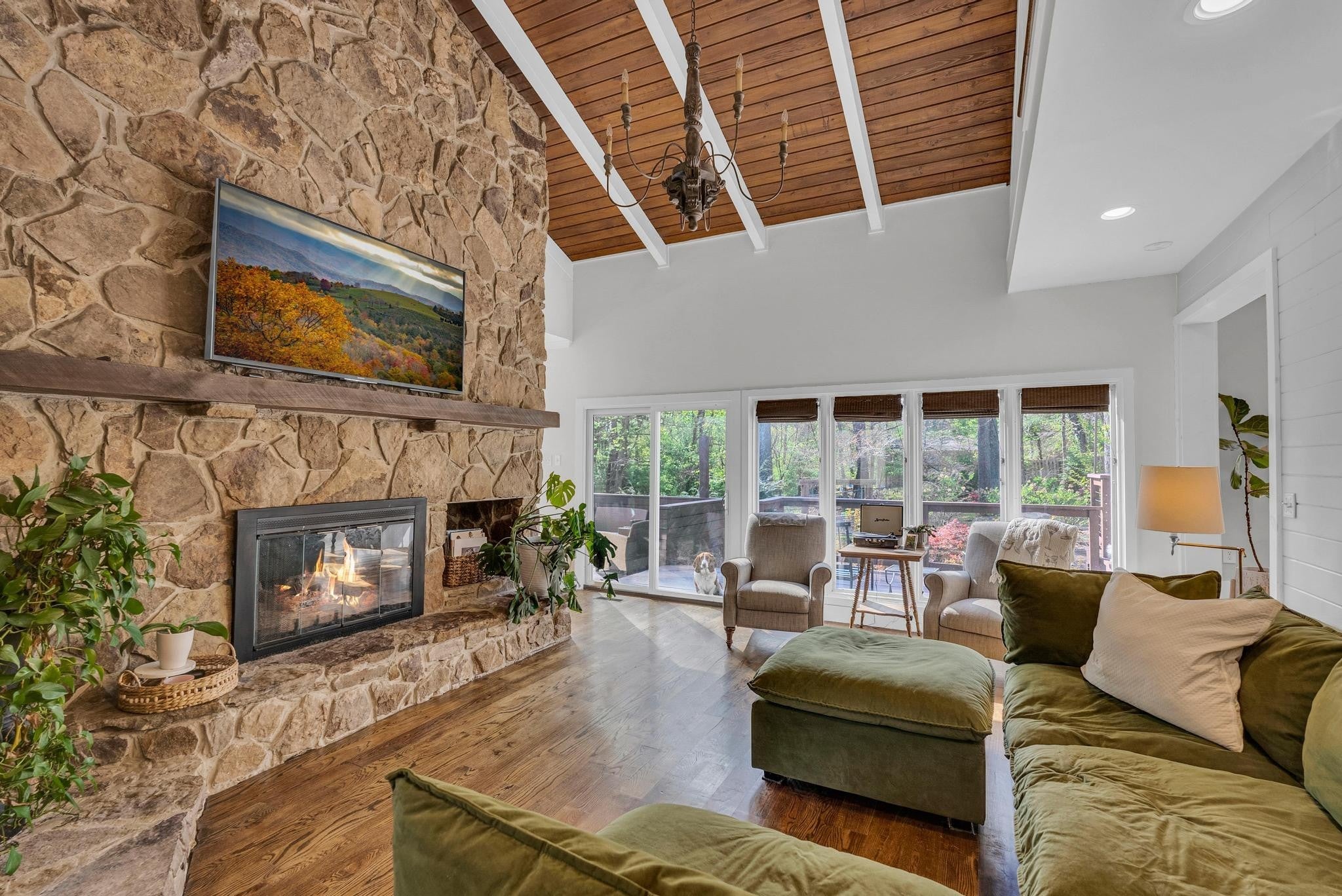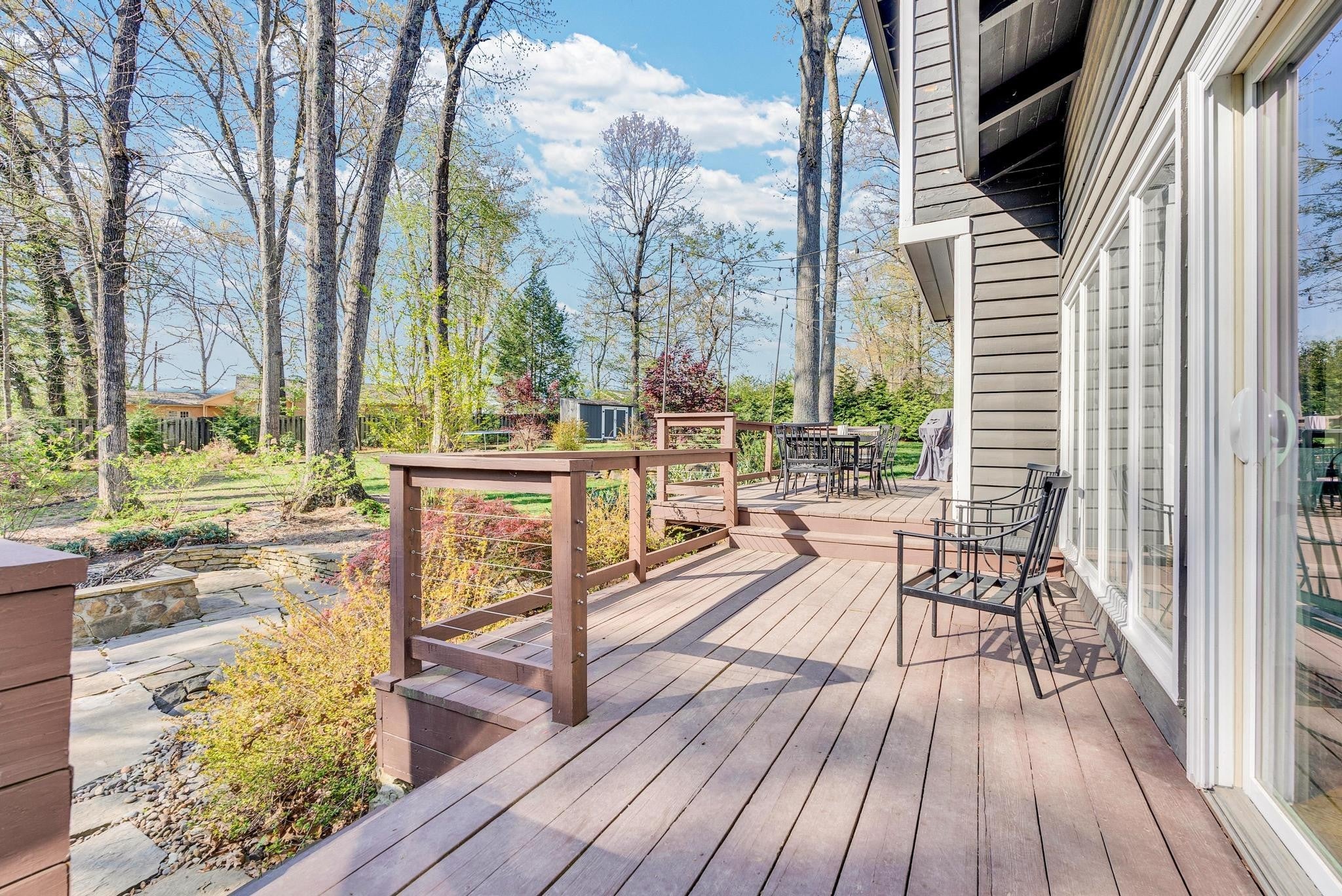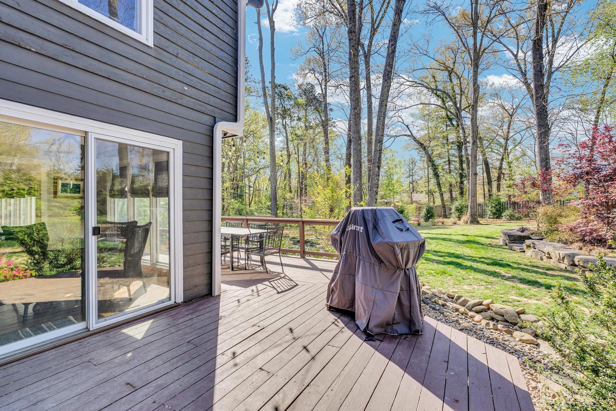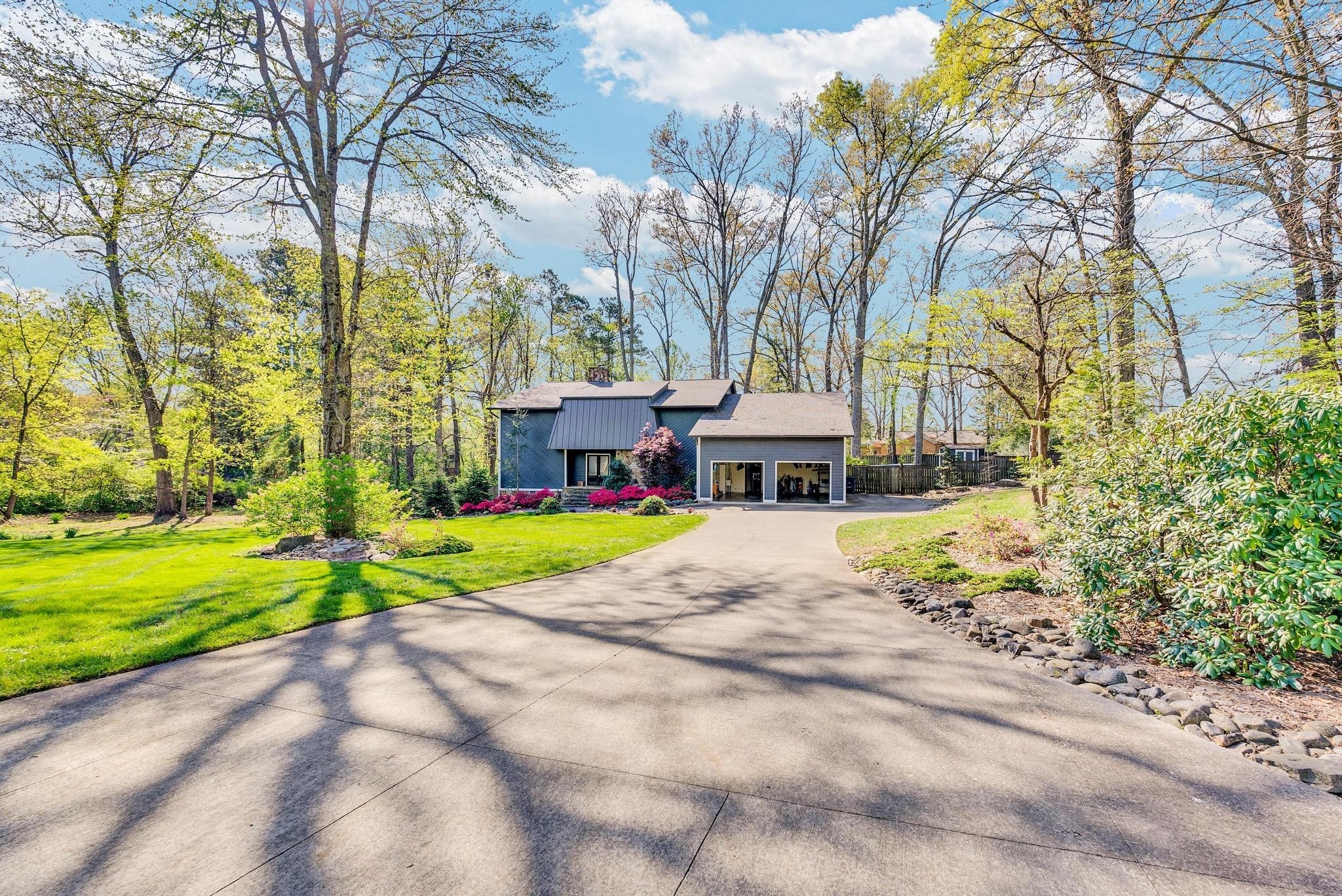 Exceptional 4-bedroom, 2.5-bath contemporary residence set on a private, tree-lined lot in an established setting. A striking architectural exterior with rich charcoal tones, dramatic rooflines, and manicured landscaping creates unforgettable curb appeal. Inside, sophisticated living spaces are anchored by a stunning floor-to-ceiling stone fireplace, blending timeless elegance with modern design. The updated kitchen features stylish finishes, quality cabinetry, and ample workspace, and is seamlessly connected to the living room—perfect for everyday living and entertaining. On the opposite side of the living room, a dedicated dining room provides a defined yet accessible space for hosting gatherings. A spacious bonus room offers flexibility for a home office, media room, or additional living space to suit your needs. Step outside to an expansive deck overlooking a park-like, fully fenced backyard—an ideal setting for relaxing, entertaining, or enjoying the peaceful natural surroundings. Expansive windows invite natural light and serene views throughout, while the thoughtfully designed floor plan ensures effortless flow for both refined entertaining and everyday comfort. Surrounded by mature trees and lush seasonal color, this property offers a rare blend of privacy, luxury, and architectural character—truly a standout residence that combines modern sophistication with natural beauty.