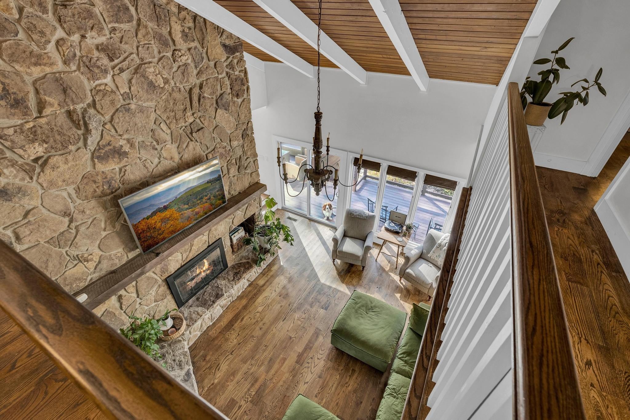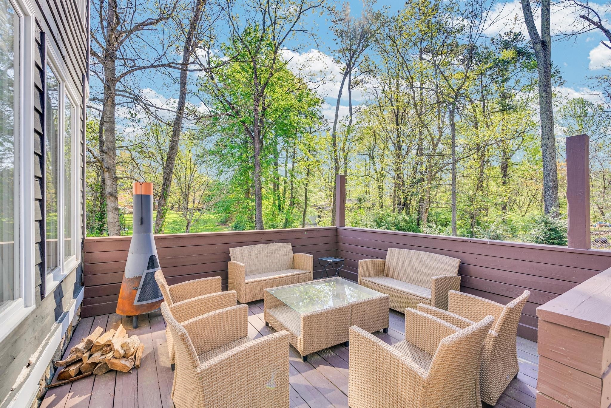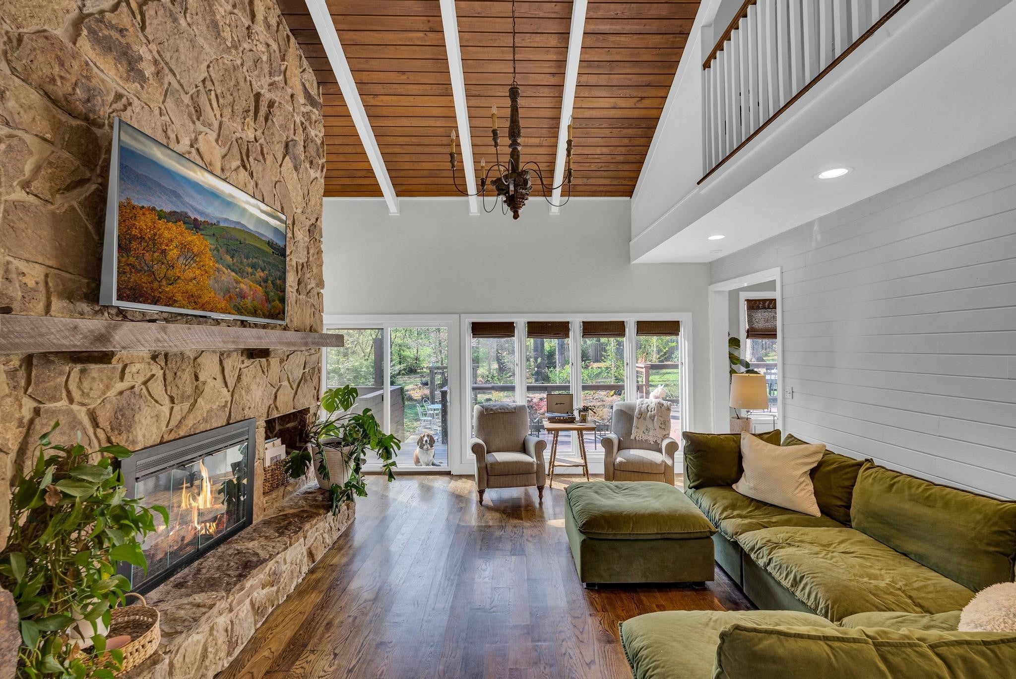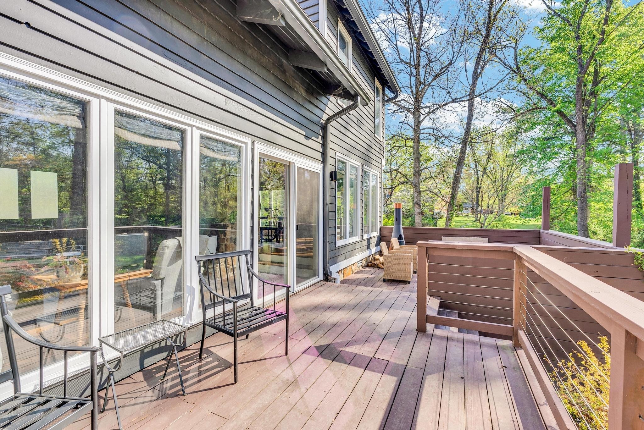Exceptional 4-bedroom, 2.5-bath contemporary residence set on a private, tree-lined lot in an established setting. A striking architectural exterior with rich charcoal tones, dramatic rooflines, and manicured landscaping creates unforgettable curb appeal. Inside, sophisticated living spaces are anchored by a stunning floor-to-ceiling stone fireplace, blending timeless elegance with modern design. The updated kitchen features stylish finishes, quality cabinetry, and ample workspace, and is seamlessly connected to the living room—perfect for everyday living and entertaining. On the opposite side of the living room, a dedicated dining room provides a defined yet accessible space for hosting gatherings. A spacious bonus room offers flexibility for a home office, media room, or additional living space to suit your needs. Step outside to an expansive deck overlooking a park-like, fully fenced backyard—an ideal setting for relaxing, entertaining, or enjoying the peaceful natural surroundings. Expansive windows invite natural light and serene views throughout, while the thoughtfully designed floor plan ensures effortless flow for both refined entertaining and everyday comfort. Surrounded by mature trees and lush seasonal color, this property offers a rare blend of privacy, luxury, and architectural character—truly a standout residence that combines modern sophistication with natural beauty.