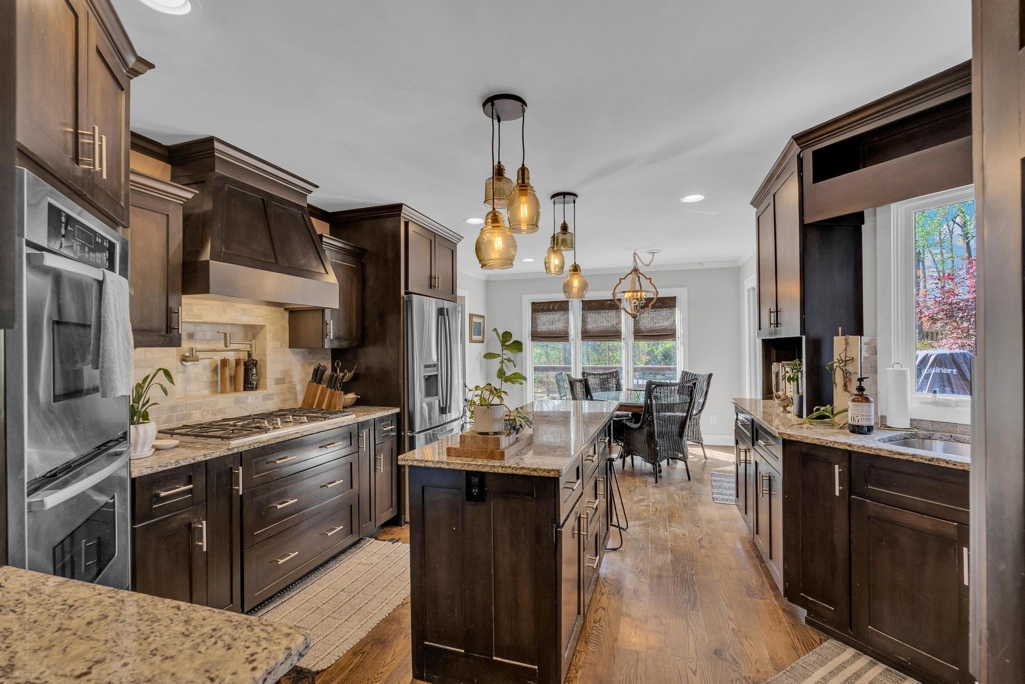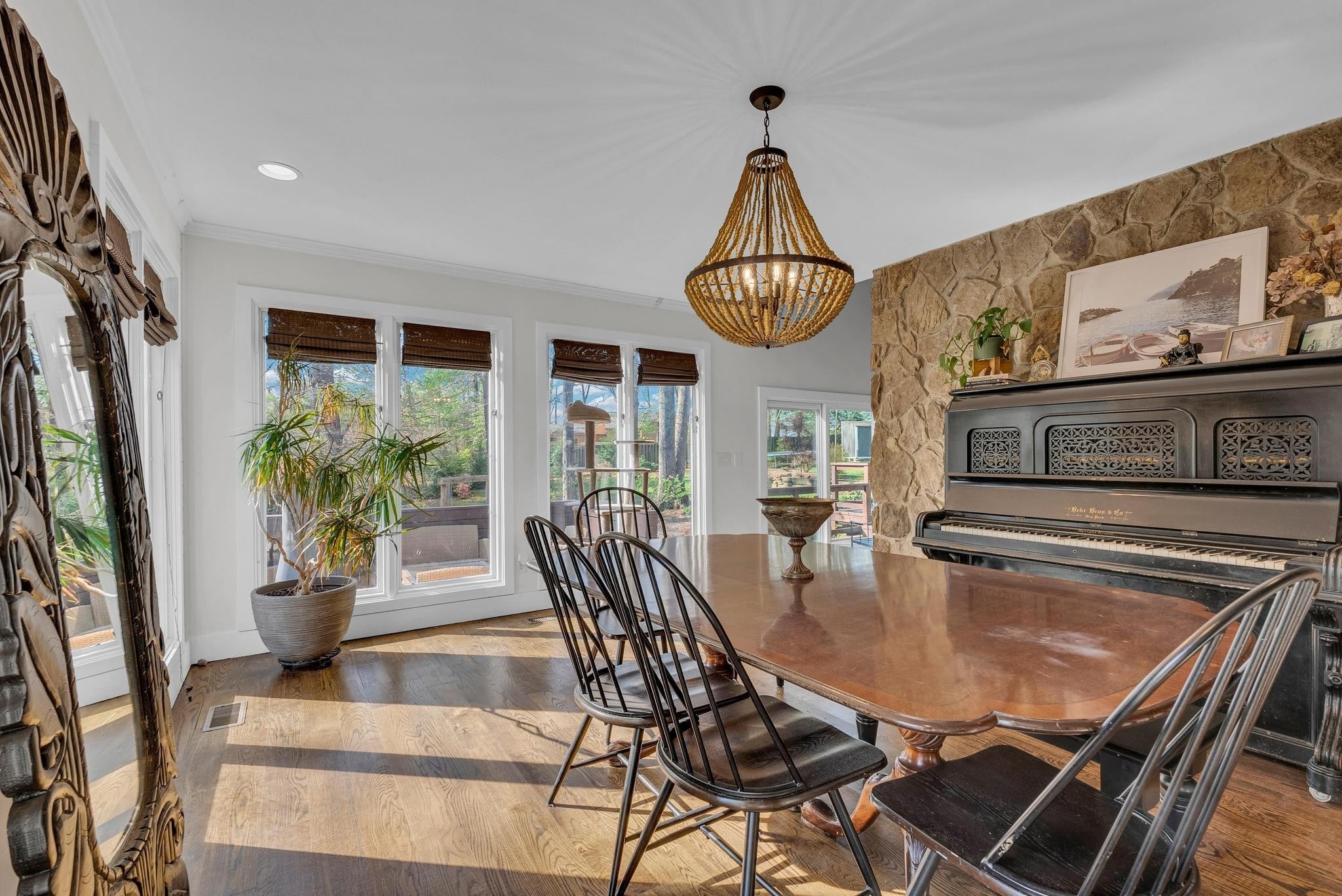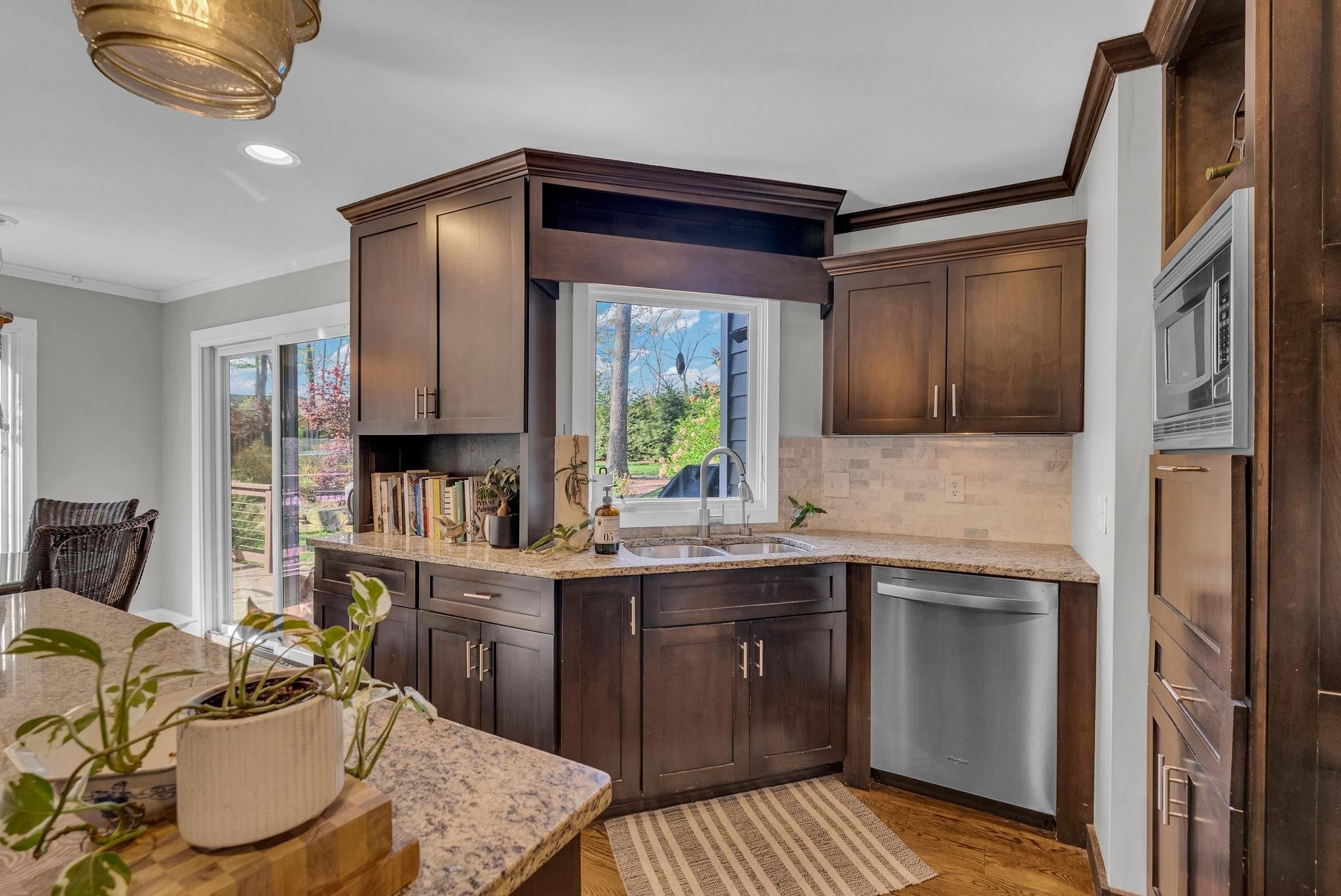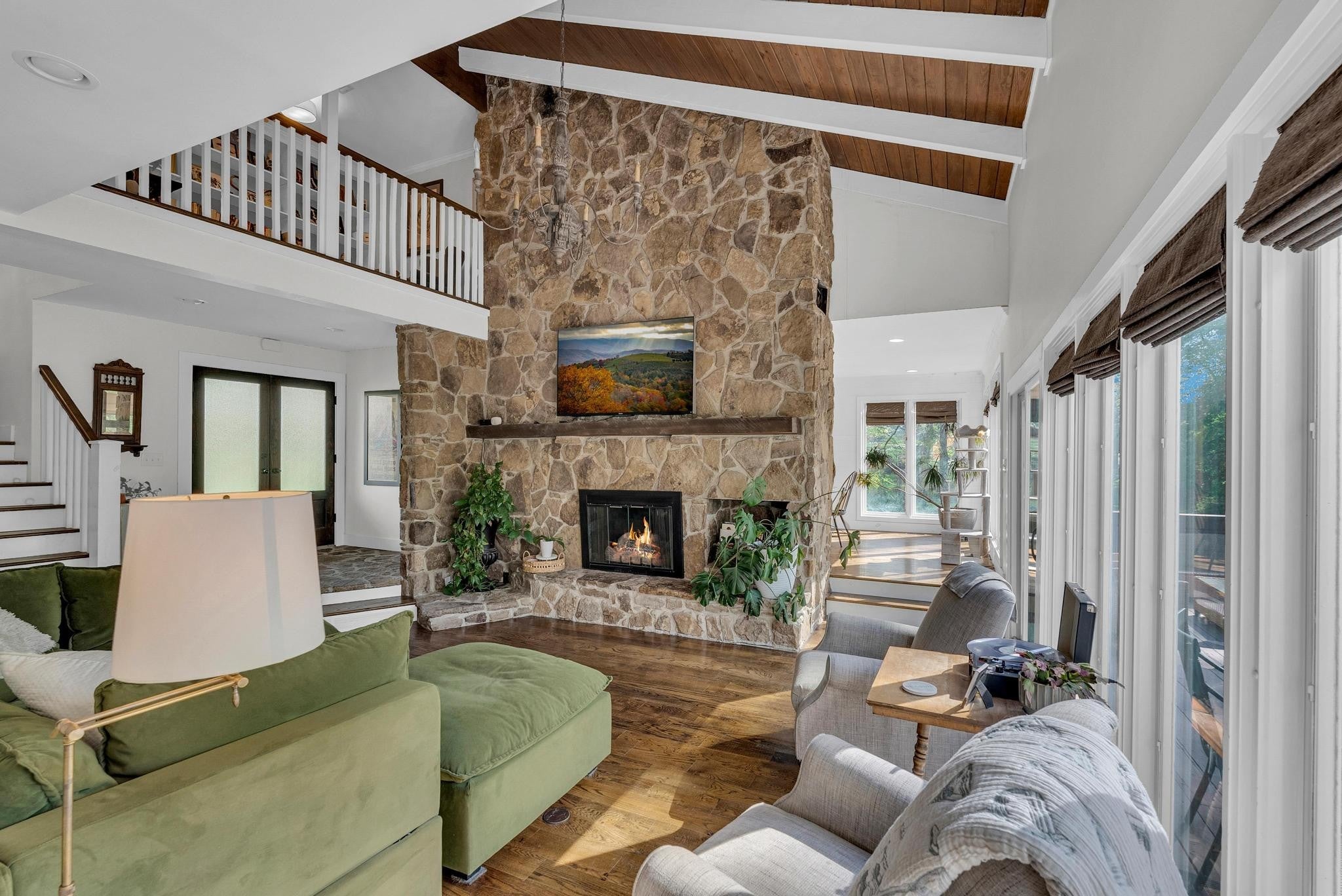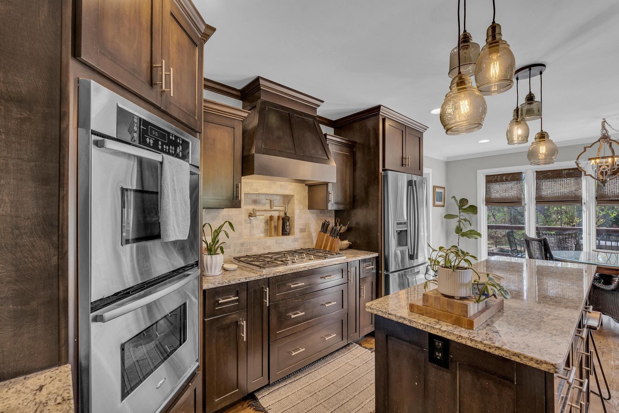 Exceptional 4-bedroom, 2.5-bath contemporary residence set on a private, tree-lined lot in an established setting. A striking architectural exterior with rich charcoal tones, dramatic rooflines, and manicured landscaping creates unforgettable curb appeal. Inside, sophisticated living spaces are anchored by a stunning floor-to-ceiling stone fireplace, blending timeless elegance with modern design. The updated kitchen features stylish finishes, quality cabinetry, and ample workspace, and is seamlessly connected to the living room—perfect for everyday living and entertaining. On the opposite side of the living room, a dedicated dining room provides a defined yet accessible space for hosting gatherings. A spacious bonus room offers flexibility for a home office, media room, or additional living space to suit your needs. Step outside to an expansive deck overlooking a park-like, fully fenced backyard—an ideal setting for relaxing, entertaining, or enjoying the peaceful natural surroundings. Expansive windows invite natural light and serene views throughout, while the thoughtfully designed floor plan ensures effortless flow for both refined entertaining and everyday comfort. Surrounded by mature trees and lush seasonal color, this property offers a rare blend of privacy, luxury, and architectural character—truly a standout residence that combines modern sophistication with natural beauty.