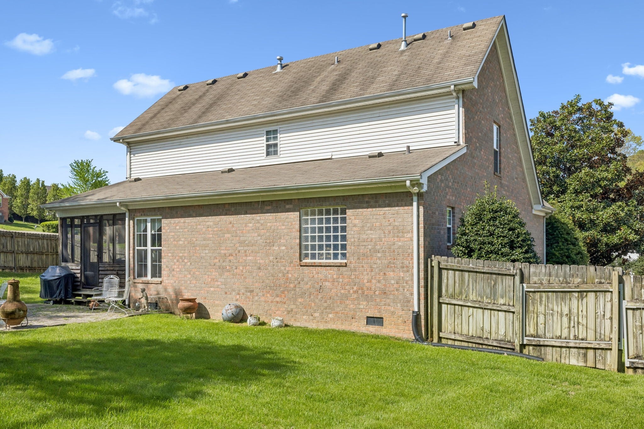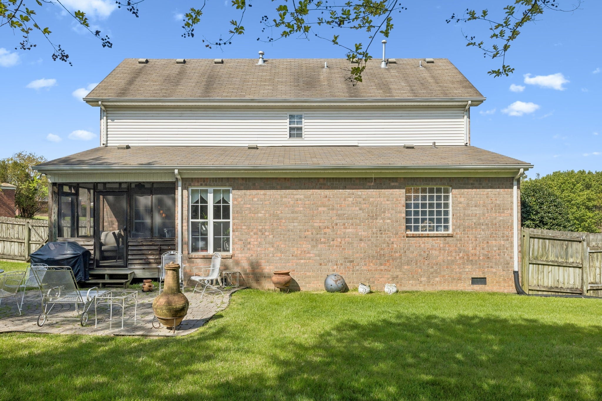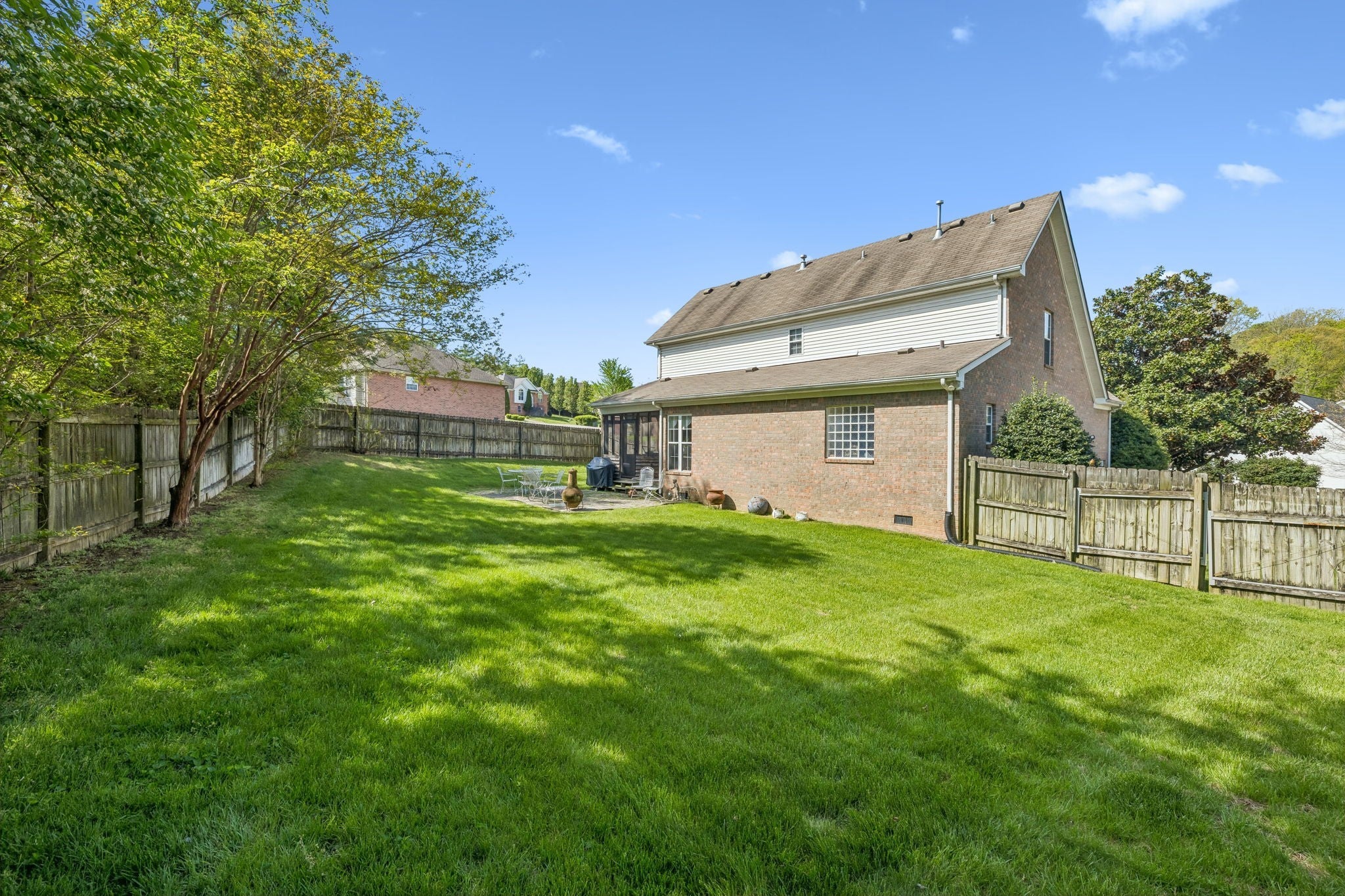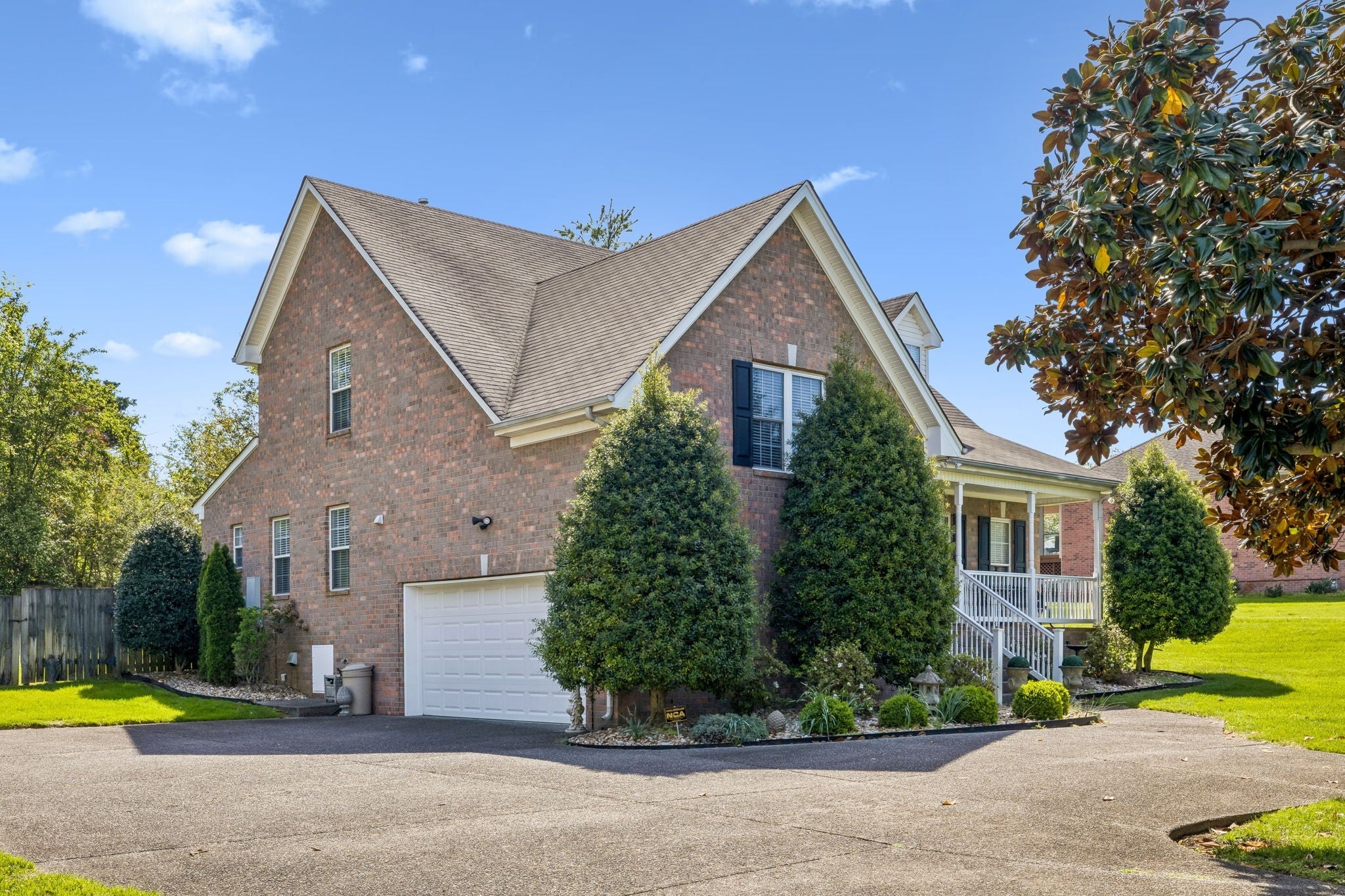 NO HOA! Former model home with many upgrades. Maintenance free front porch & railings. Established lawn with total irrigation system, landscaping with river rock and 6 ft privacy fencing. Spacious home is great for entertaining with open floorplan on main level and large den on second floor. Stainless steel appliances, granite countertops in kitchen and baths. Tile shower with glass enclosure. Garage has central Heat and air. Lots of crown molding and can lights throughout. Oversized aggregate driveway with turnaround space.Beautifully maintained and show ready!