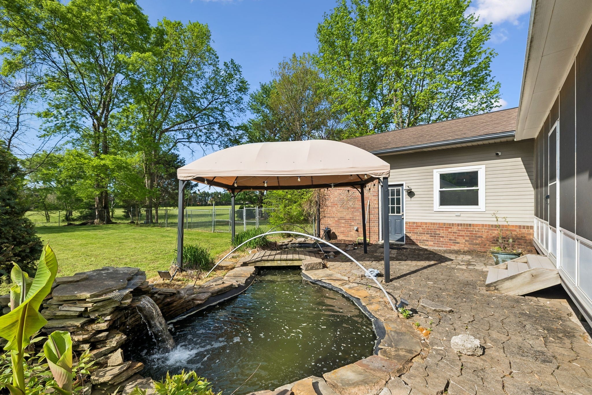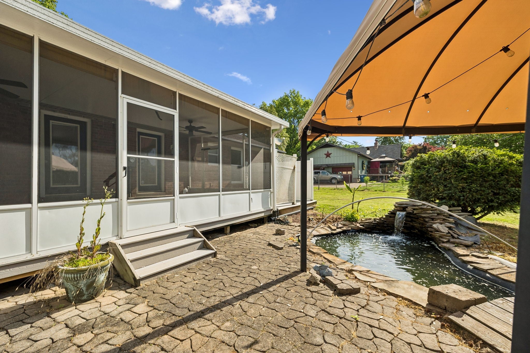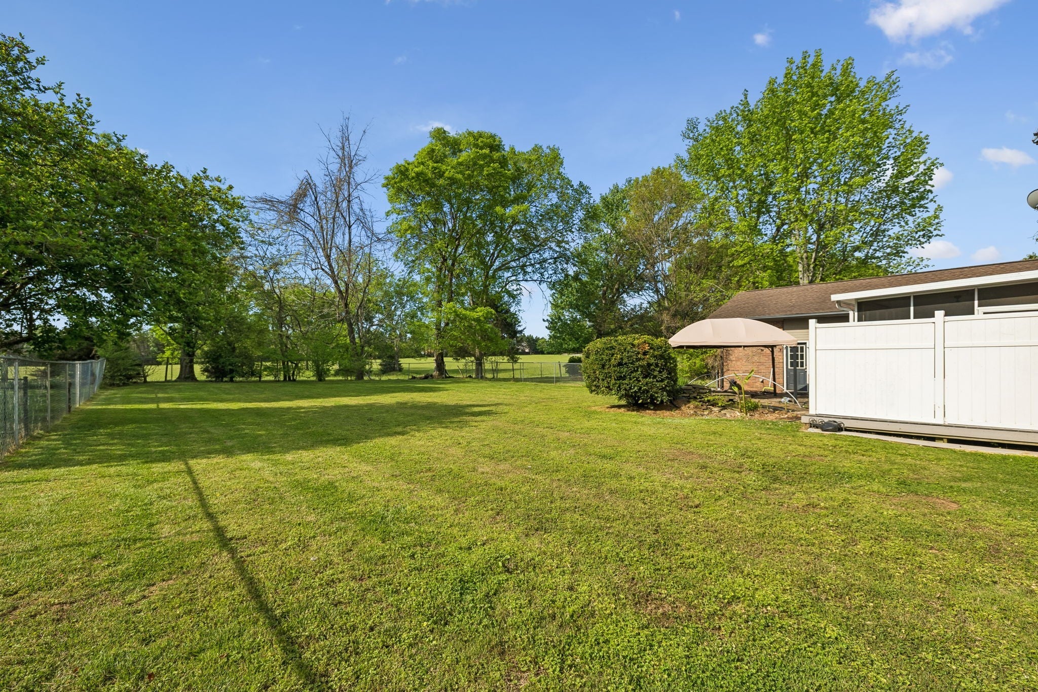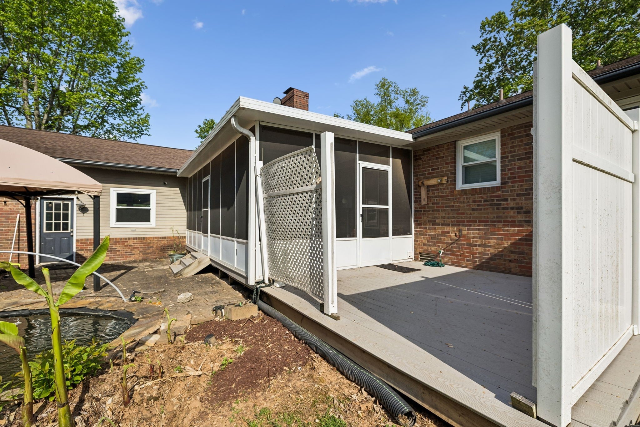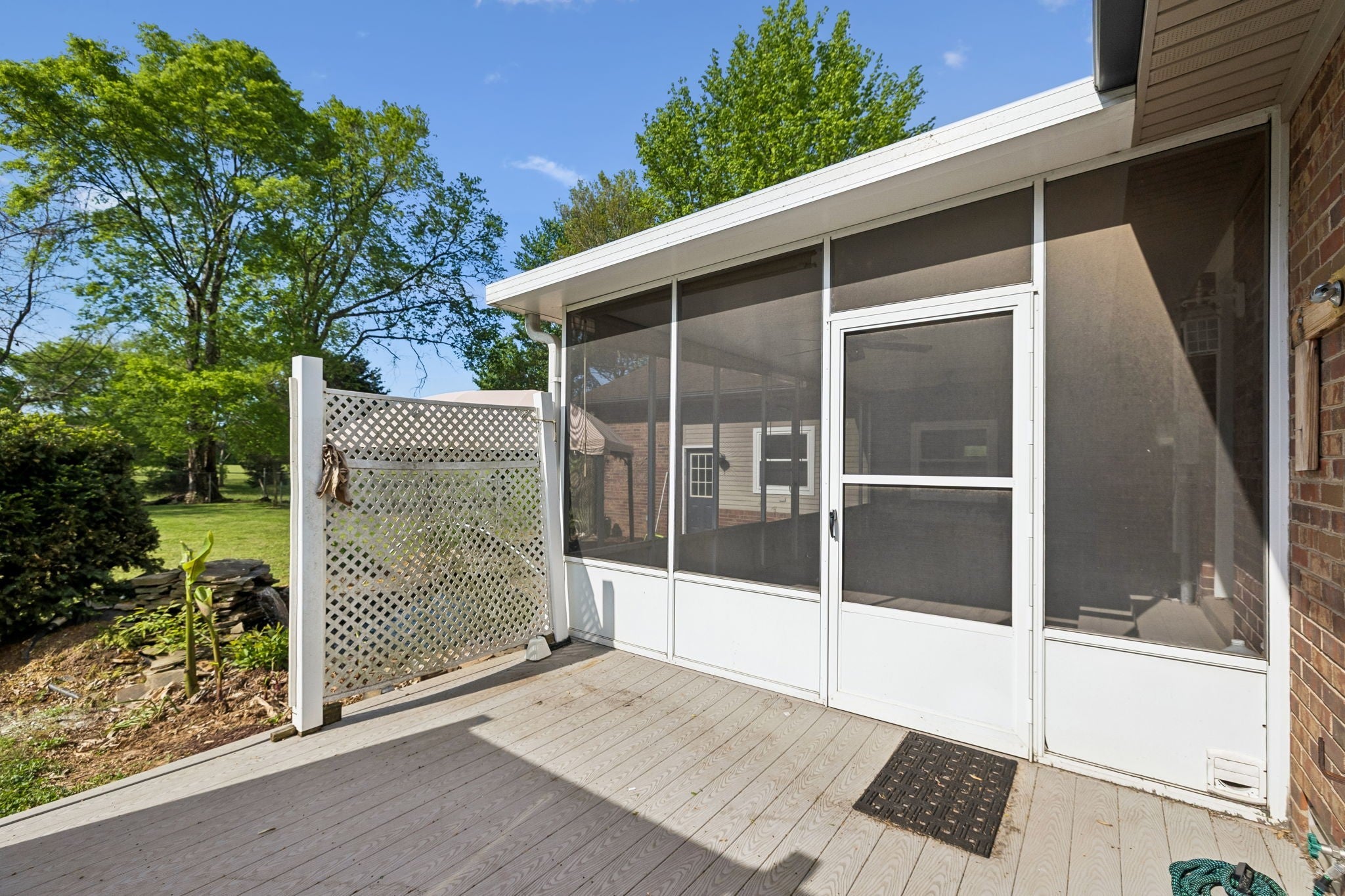 All-brick, one-level ranch situated on a large, level corner lot in a pristine neighborhood with underground utilities and no city taxes—yet just minutes from all the shopping, dining, and conveniences of Murfreesboro. The property backs up to larger acreage, offering added privacy and a peaceful setting. This 3 bedroom, 2 bath home features approximately 2,001 square feet with a 2-car garage, including a 21' x 8' workshop area. Inside, you’ll find a tiled entry foyer, spacious eat-in kitchen with abundant cabinetry and a sliding window above the sink, and a comfortable den with a brick fireplace and gas logs. A separate living room/dining room combination provides additional space for entertaining. Primary suite includes a walk-in shower, while the secondary bath features a jacuzzi-style tub and granite countertops. Hardwood flooring runs throughout most of the home, with tile in the utility room and bathrooms. Outdoor living is a standout with a covered front porch, a 24' x 12' screened-in porch with Trex decking, an additional 12' x 11' open deck, and a paver patio area on ground level. The backyard is beautifully maintained with chain-link fencing, a koi pond with waterfall, and mature landscaping. Additional features include an aggregate driveway, tankless water heater, whole-home HEPA inline duct filter, humidifier system, and new double-pane argon windows installed in 2021, along with leaf guard gutter protection.