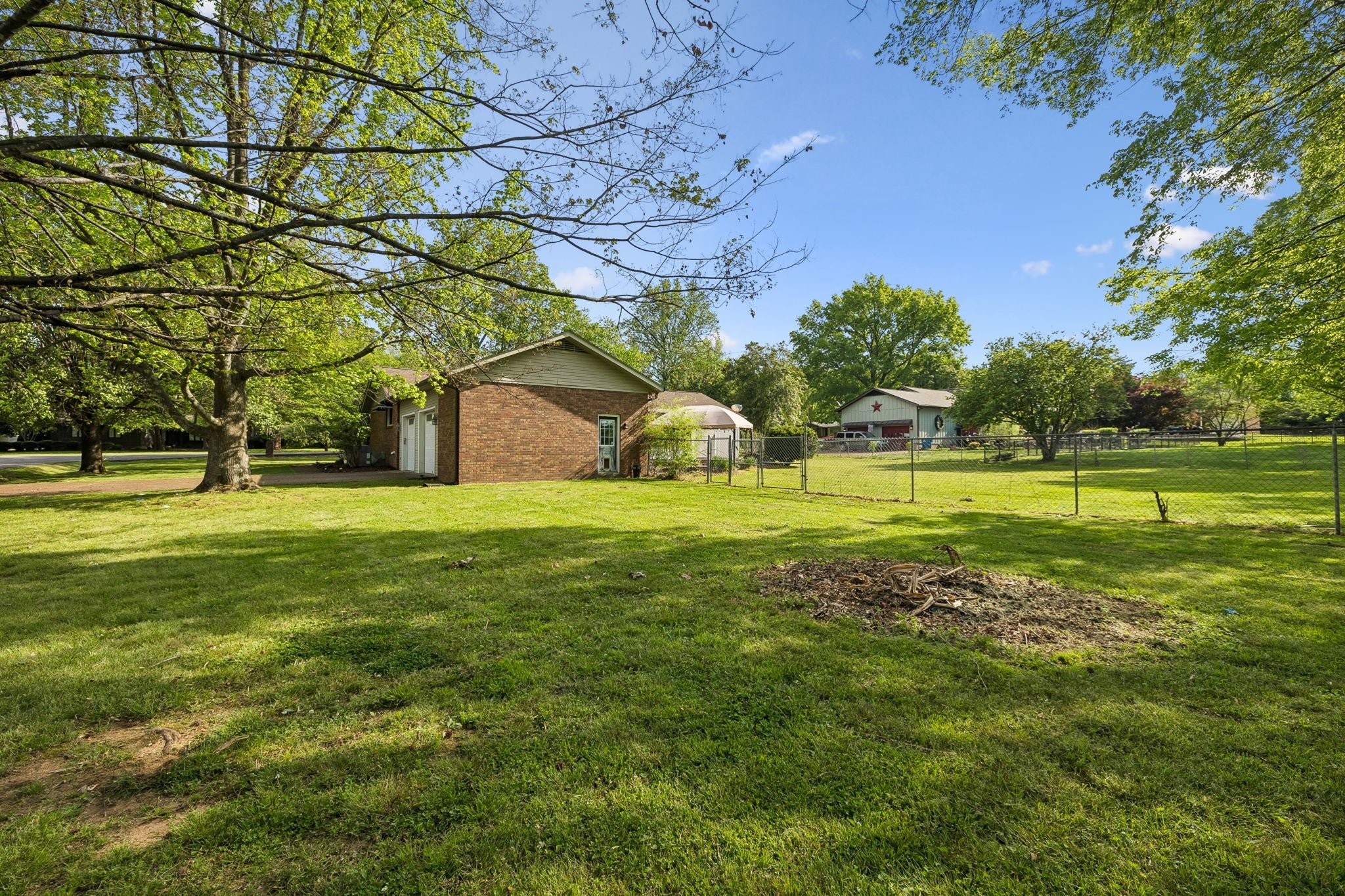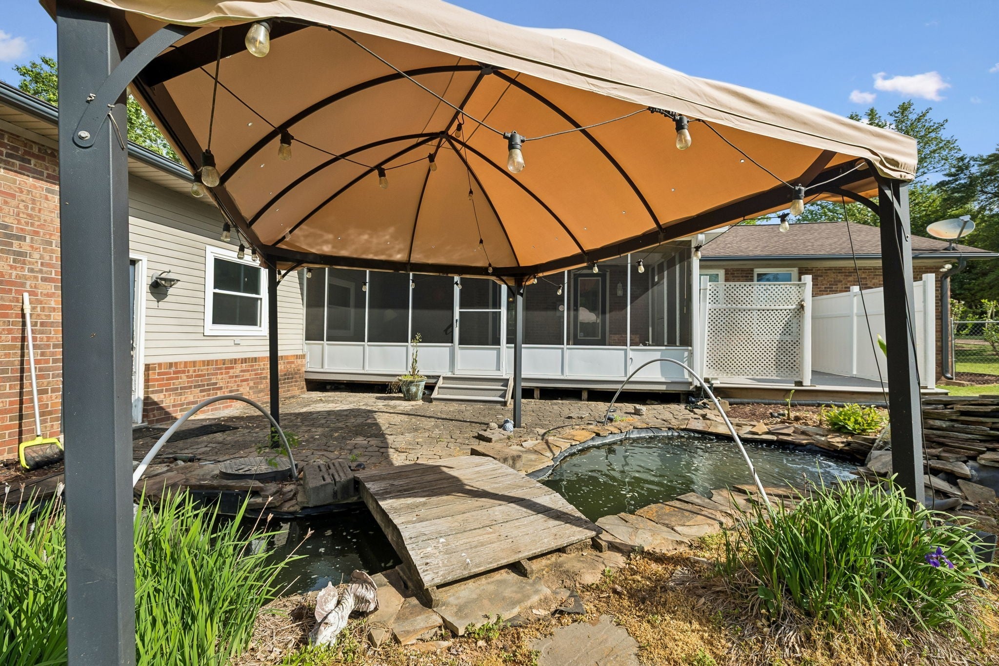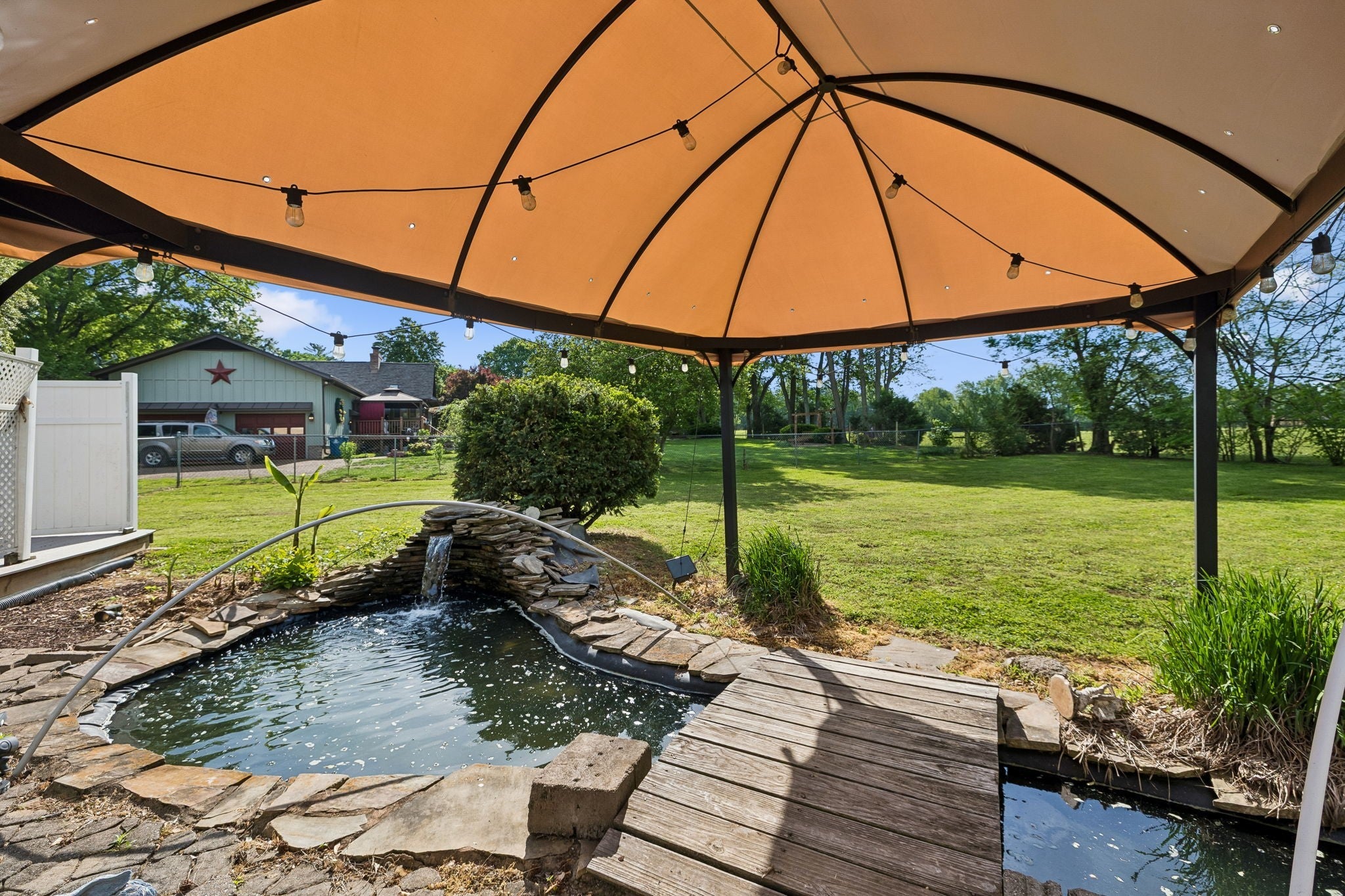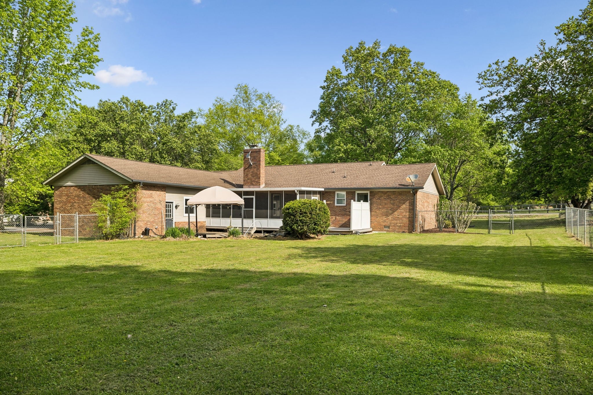 All-brick, one-level ranch situated on a large, level corner lot in a pristine neighborhood with underground utilities and no city taxes—yet just minutes from all the shopping, dining, and conveniences of Murfreesboro. The property backs up to larger acreage, offering added privacy and a peaceful setting. This 3 bedroom, 2 bath home features approximately 2,001 square feet with a 2-car garage, including a 21' x 8' workshop area. Inside, you’ll find a tiled entry foyer, spacious eat-in kitchen with abundant cabinetry and a sliding window above the sink, and a comfortable den with a brick fireplace and gas logs. A separate living room/dining room combination provides additional space for entertaining. Primary suite includes a walk-in shower, while the secondary bath features a jacuzzi-style tub and granite countertops. Hardwood flooring runs throughout most of the home, with tile in the utility room and bathrooms. Outdoor living is a standout with a covered front porch, a 24' x 12' screened-in porch with Trex decking, an additional 12' x 11' open deck, and a paver patio area on ground level. The backyard is beautifully maintained with chain-link fencing, a koi pond with waterfall, and mature landscaping. Additional features include an aggregate driveway, tankless water heater, whole-home HEPA inline duct filter, humidifier system, and new double-pane argon windows installed in 2021, along with leaf guard gutter protection.