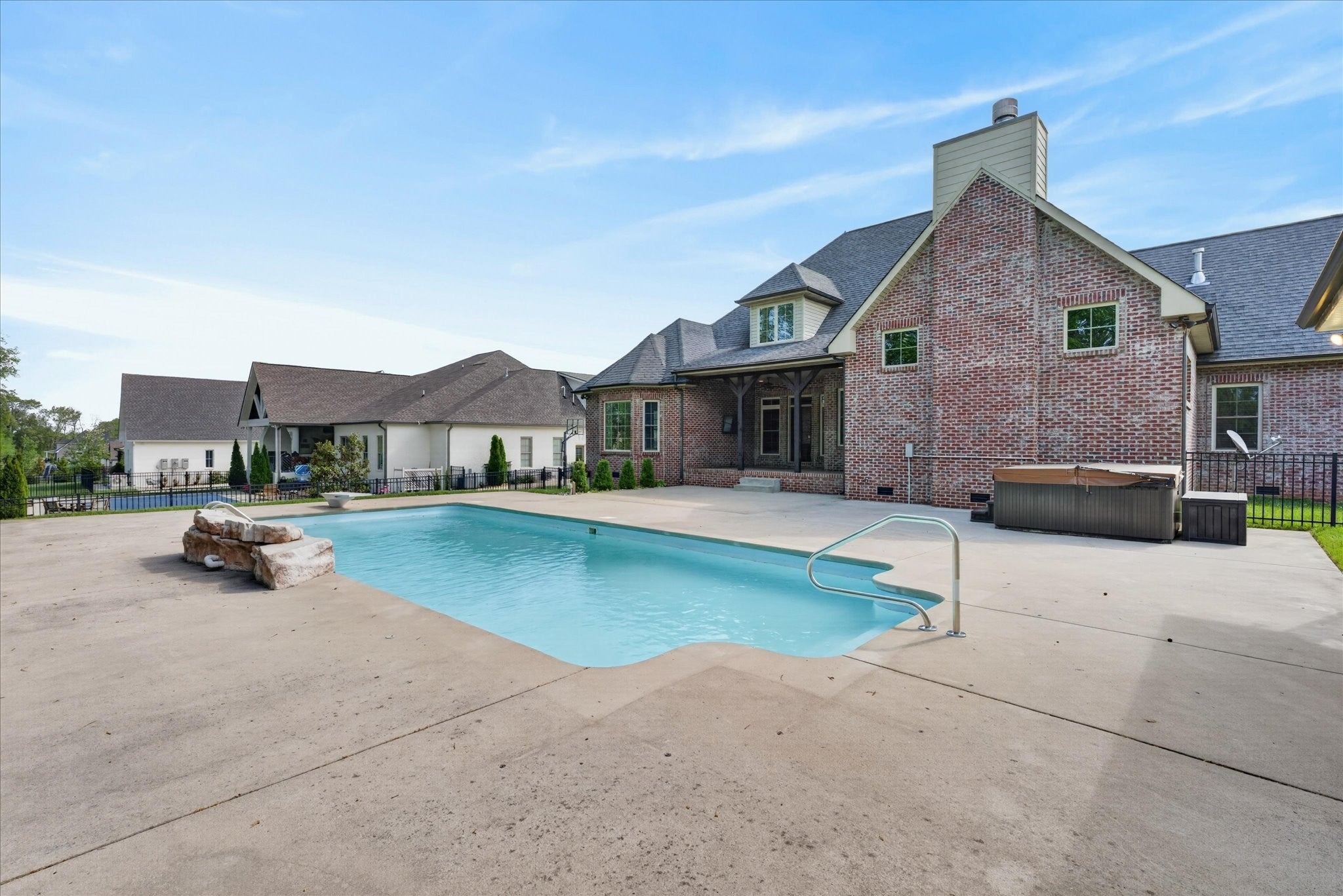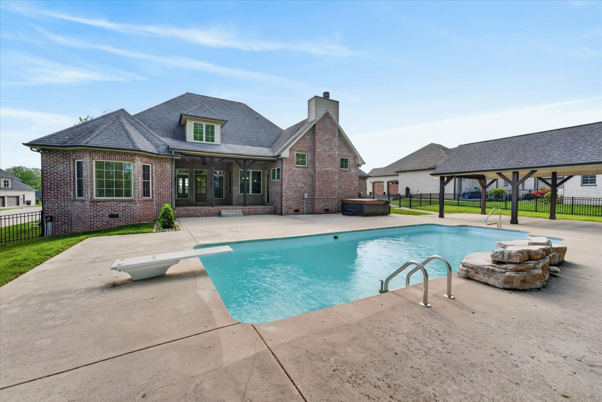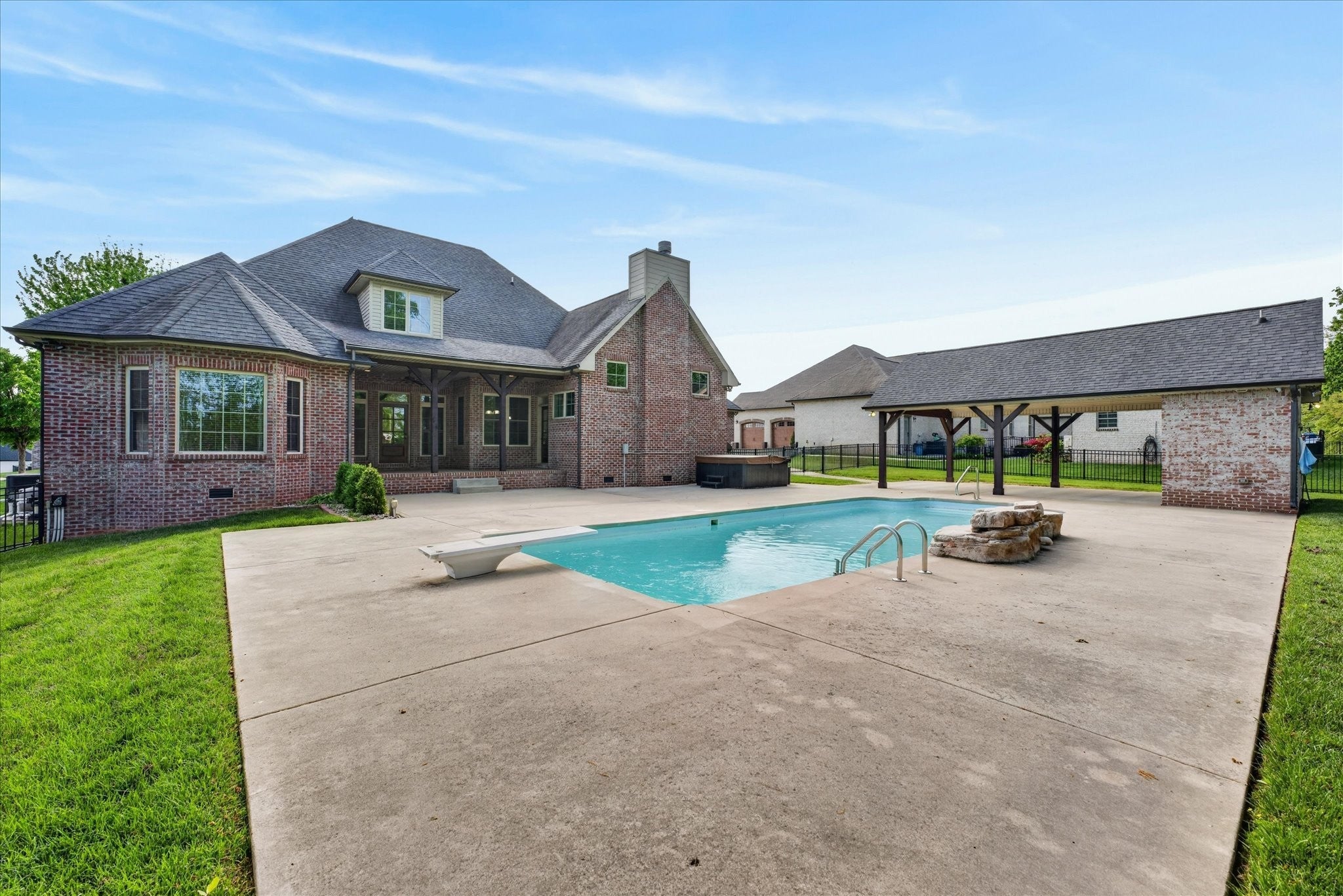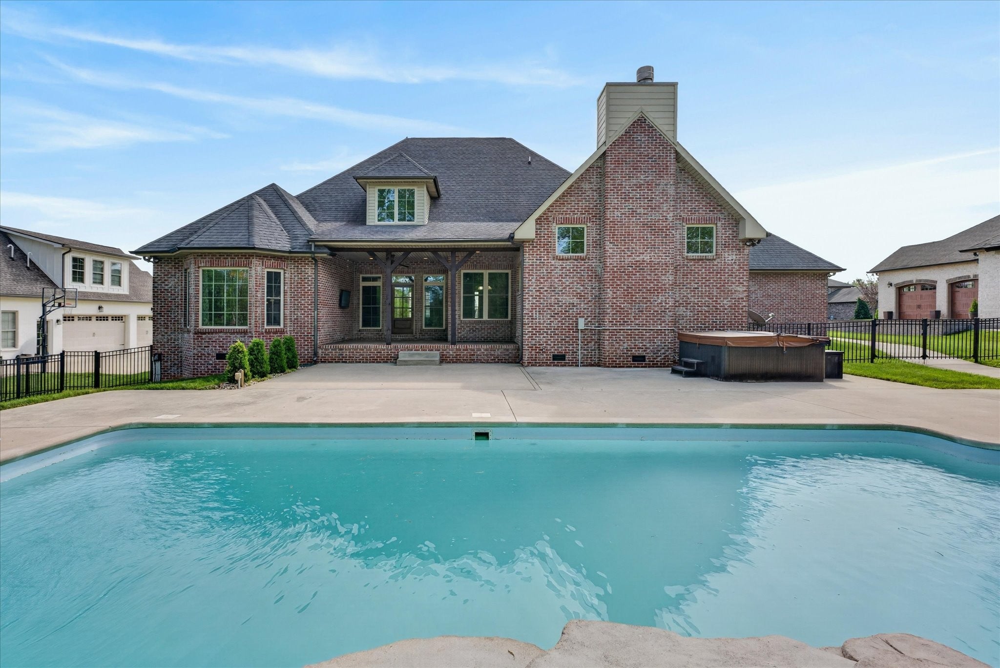 Stunning four bedroom, four and a half bath home in a prime location just minutes from all the conveniences of Madison Street! This beautifully maintained home features a three car garage, fresh paint, and all new carpet throughout. You’re welcomed by a beautifully tiled entryway that leads into a formal living room with a coffered ceiling and gorgeous herringbone hardwood floors. The heart of the home includes new hardwood floors in the kitchen and family room, where you’ll find a show stopping space featuring a plank ceiling and a floor to ceiling gas fireplace with stone and shiplap, complete with a remote. The large eat in kitchen offers granite countertops, stainless steel appliances including a double oven, and plenty of cabinet space. The primary suite is a true retreat with a tray shiplap ceiling, a spacious en suite featuring a double vanity, corner tub, walk in tiled shower, and an oversized walk in closet. All guest bedrooms are generously sized, and the second level includes a versatile bonus room with a door, closet, and full bath, perfect for a fifth bedroom, as well as two additional office spaces. The outdoor space is just as impressive, with a covered patio, beautifully maintained in ground fiberglass pool, and a pool house with covered cabana, half bath, and large storage area. The hot tub conveys, and the fully fenced backyard makes this the perfect space for relaxing or entertaining!