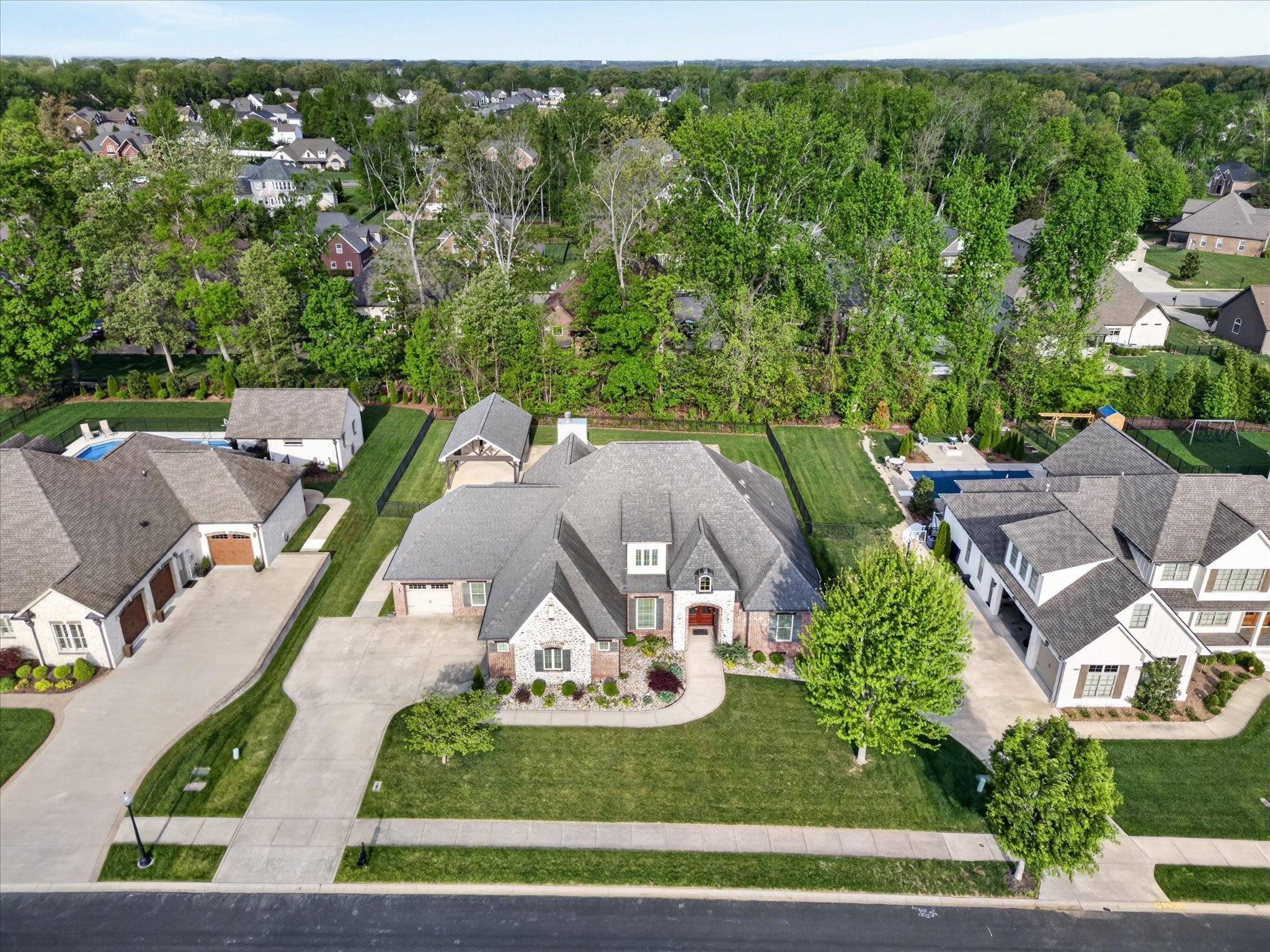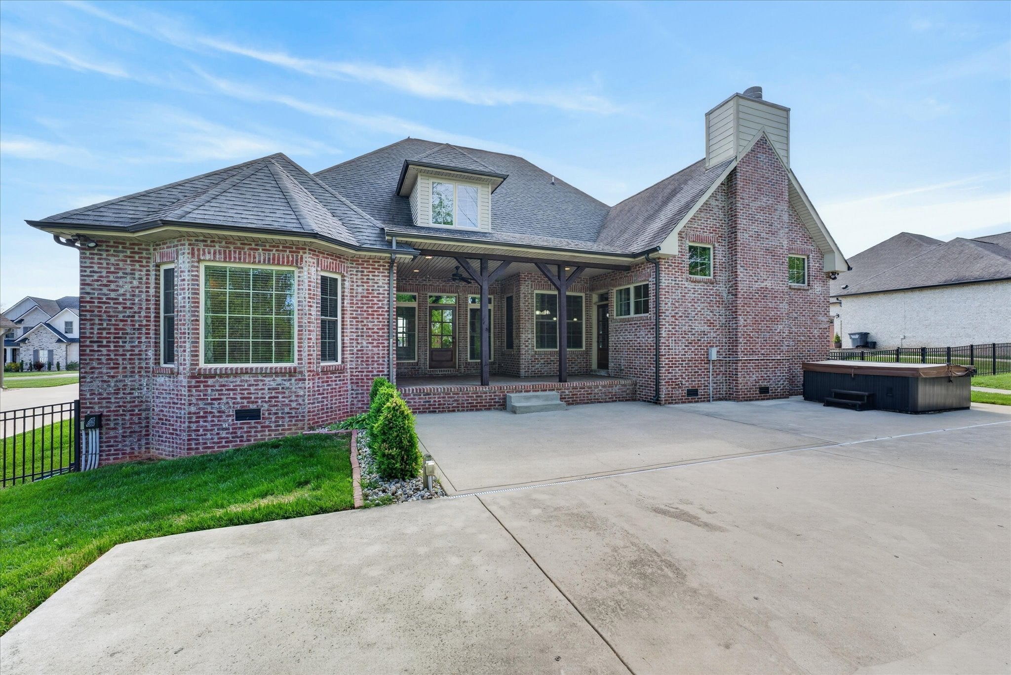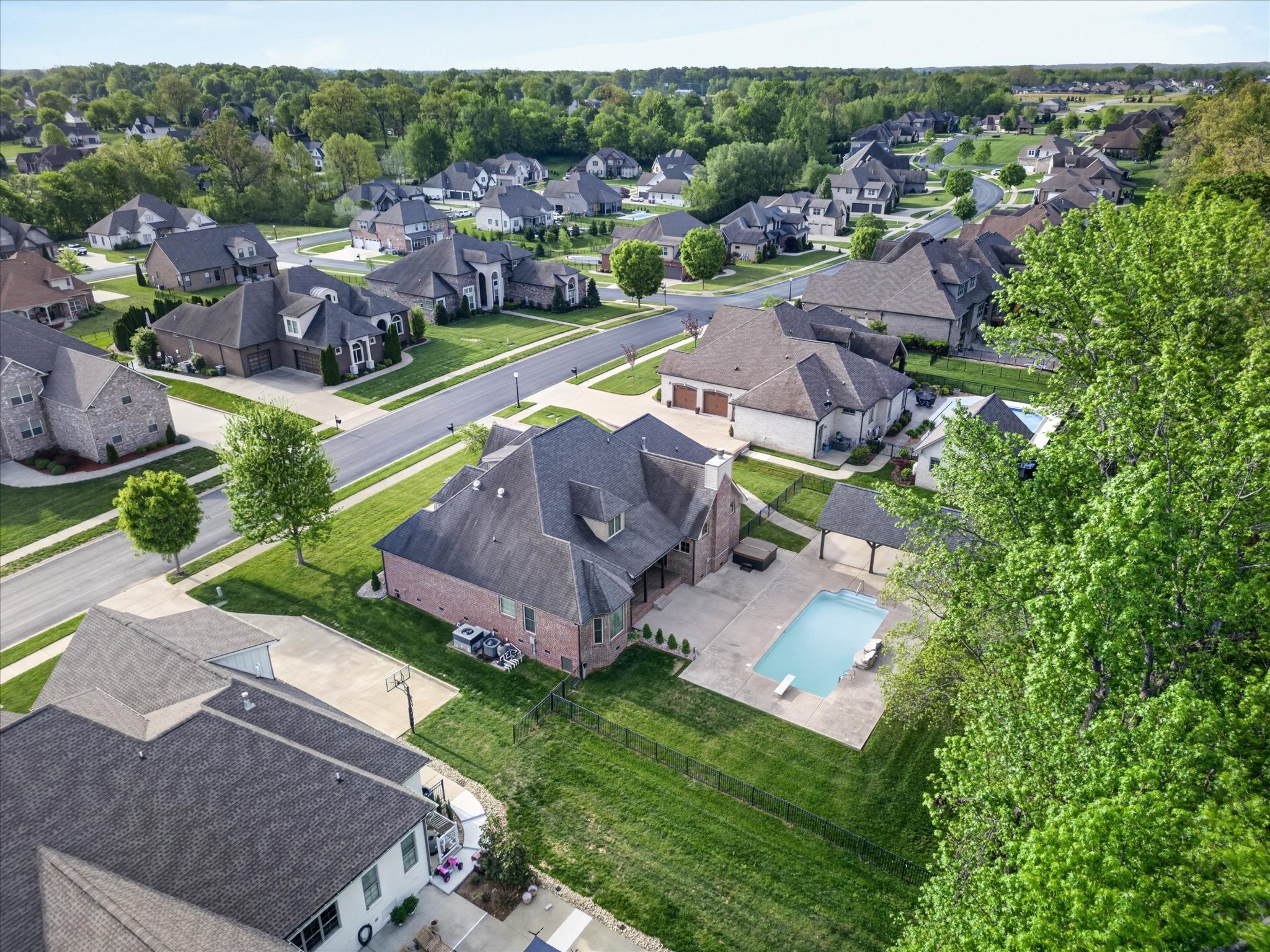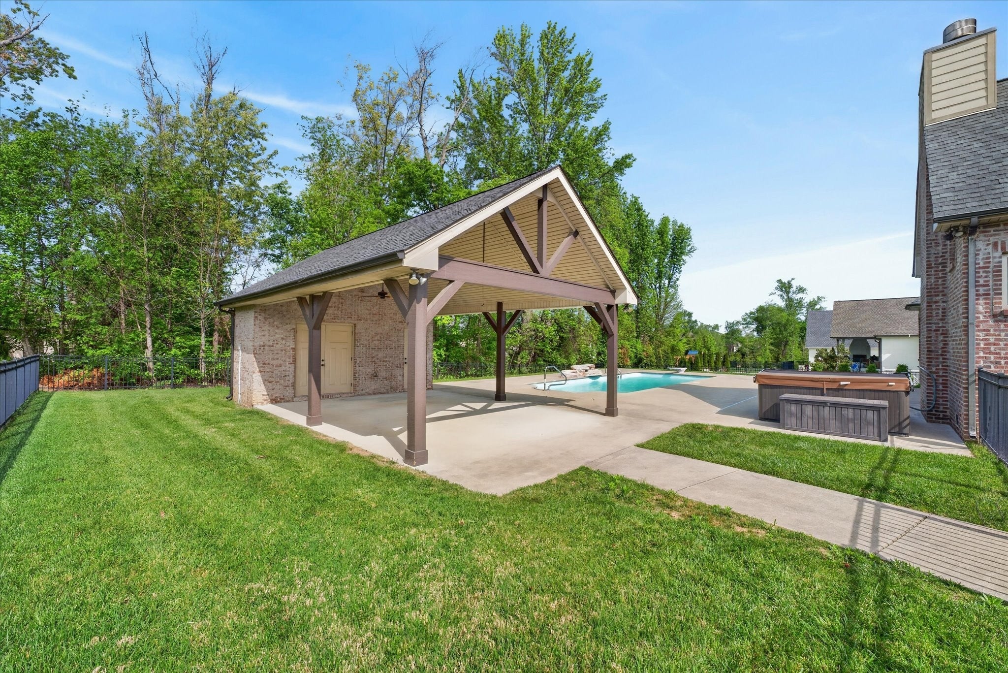 Stunning four bedroom, four and a half bath home in a prime location just minutes from all the conveniences of Madison Street! This beautifully maintained home features a three car garage, fresh paint, and all new carpet throughout. You’re welcomed by a beautifully tiled entryway that leads into a formal living room with a coffered ceiling and gorgeous herringbone hardwood floors. The heart of the home includes new hardwood floors in the kitchen and family room, where you’ll find a show stopping space featuring a plank ceiling and a floor to ceiling gas fireplace with stone and shiplap, complete with a remote. The large eat in kitchen offers granite countertops, stainless steel appliances including a double oven, and plenty of cabinet space. The primary suite is a true retreat with a tray shiplap ceiling, a spacious en suite featuring a double vanity, corner tub, walk in tiled shower, and an oversized walk in closet. All guest bedrooms are generously sized, and the second level includes a versatile bonus room with a door, closet, and full bath, perfect for a fifth bedroom, as well as two additional office spaces. The outdoor space is just as impressive, with a covered patio, beautifully maintained in ground fiberglass pool, and a pool house with covered cabana, half bath, and large storage area. The hot tub conveys, and the fully fenced backyard makes this the perfect space for relaxing or entertaining!