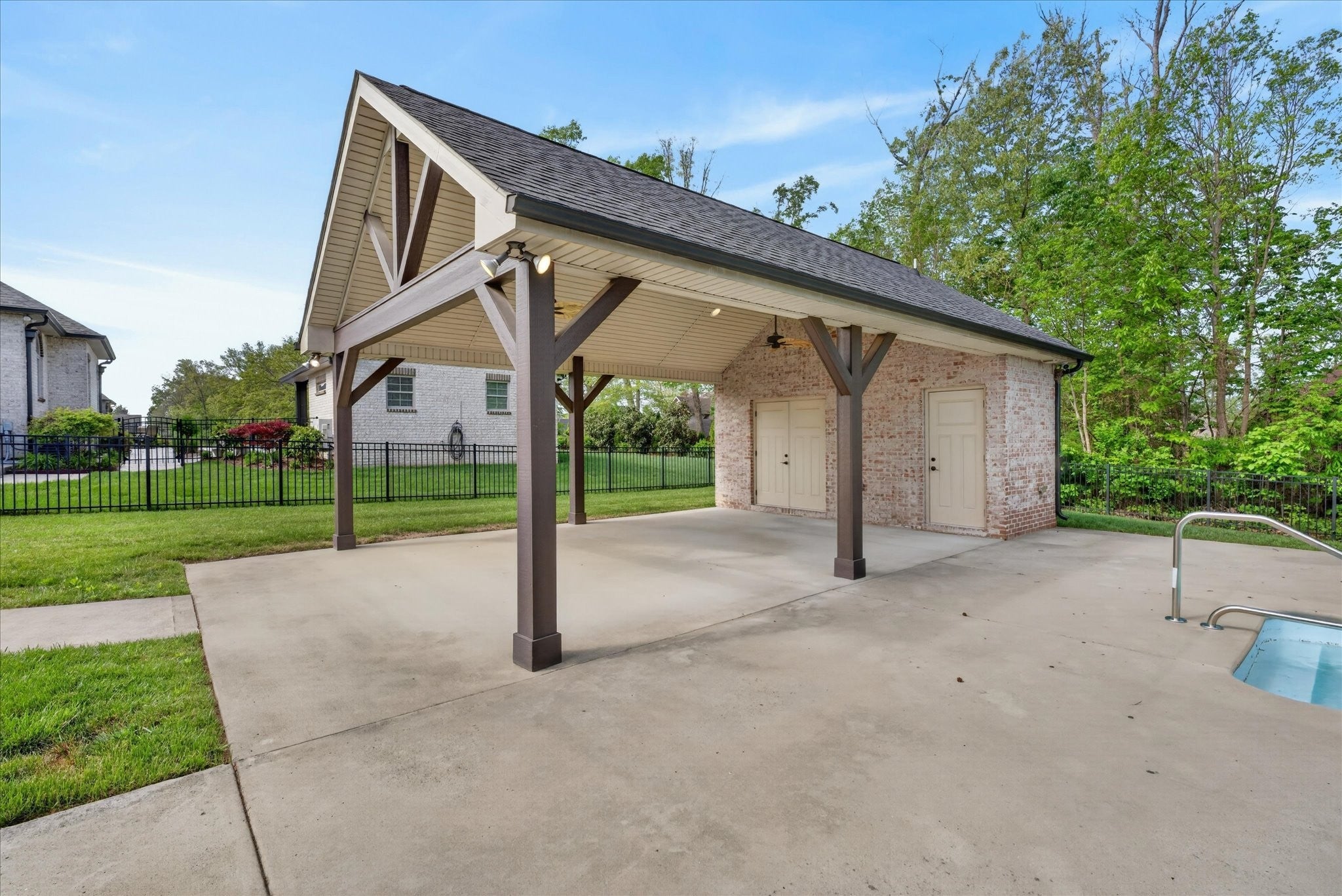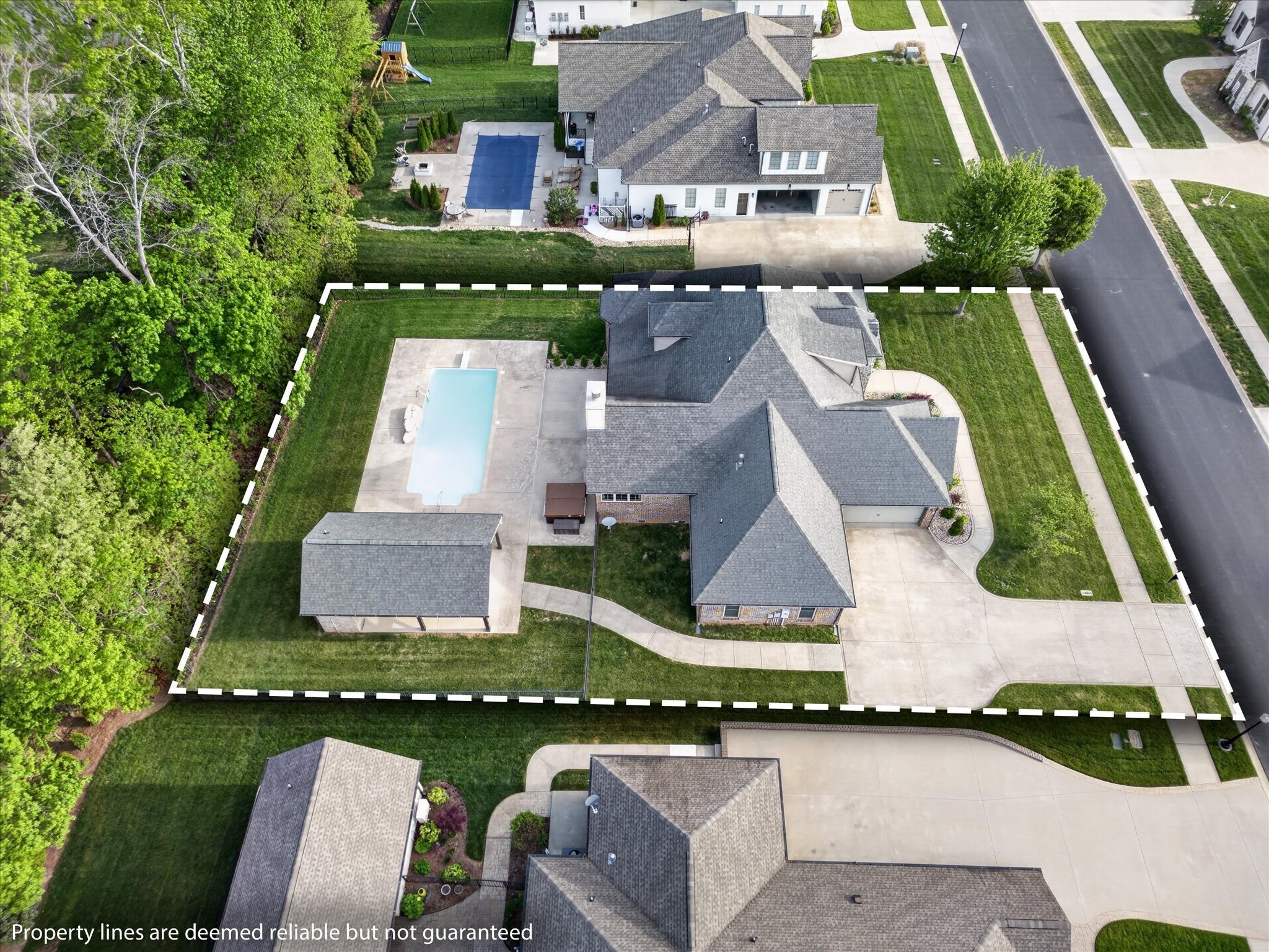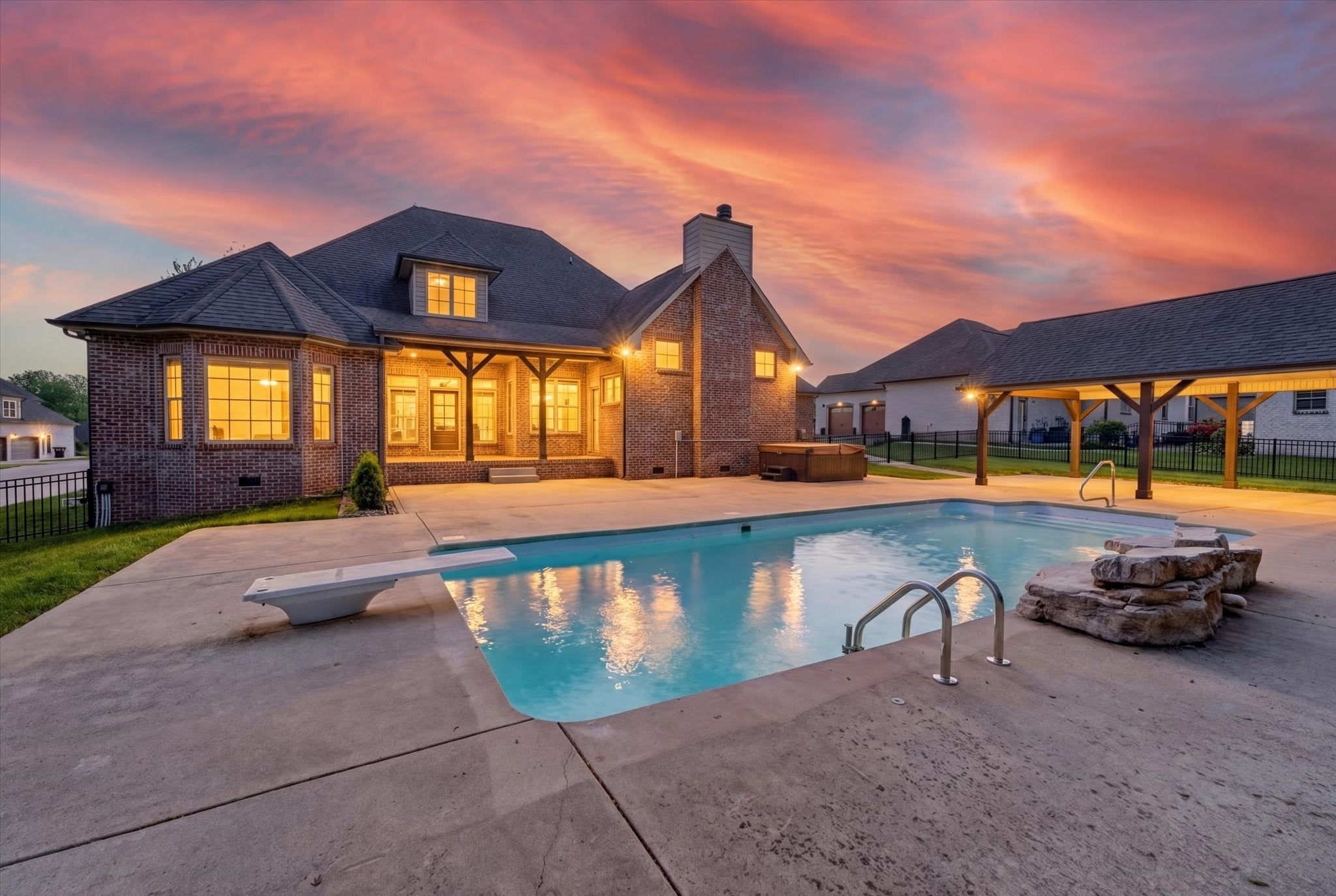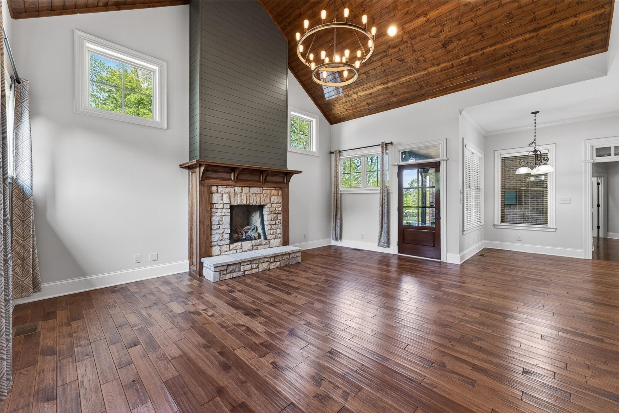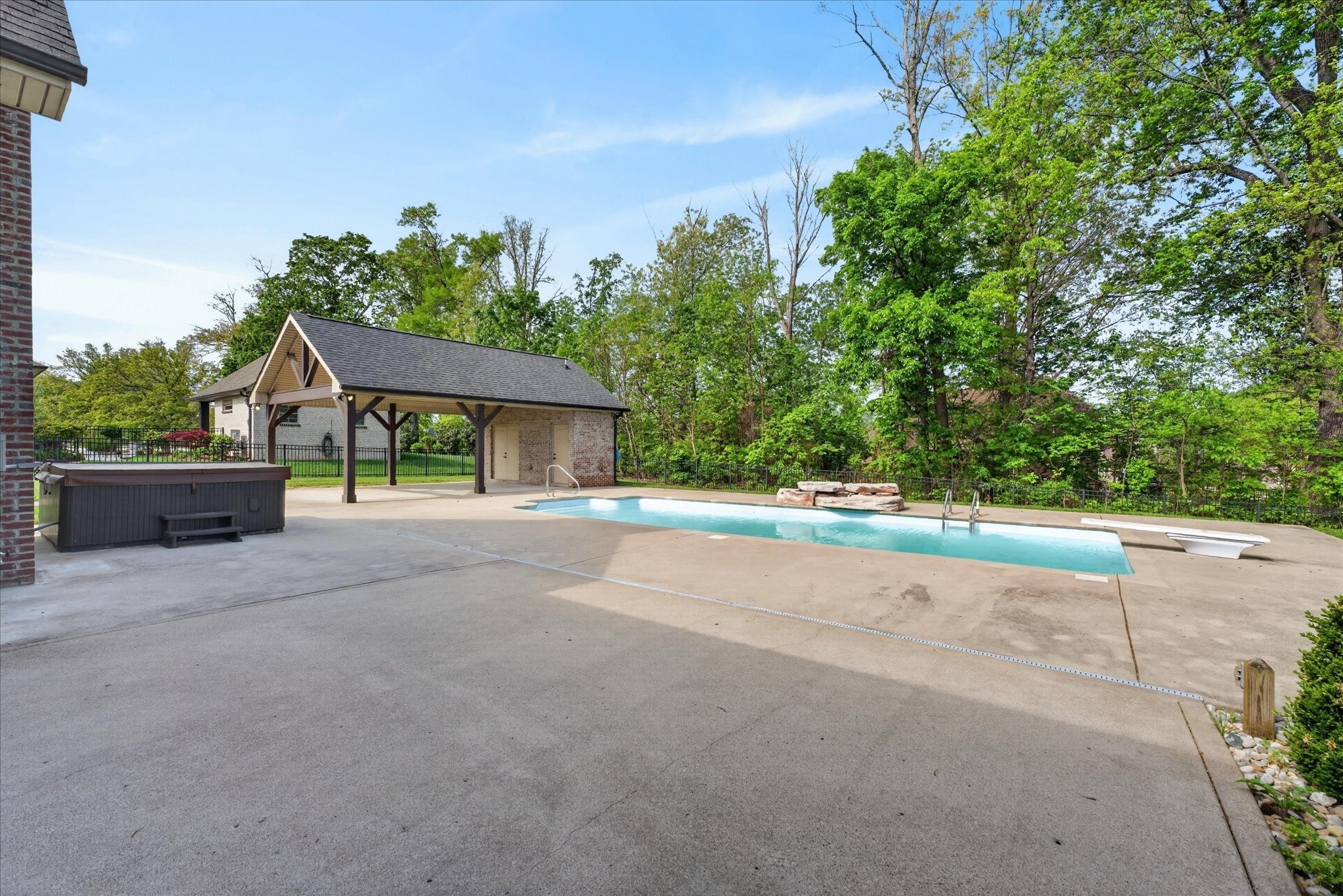 Stunning four bedroom, four and a half bath home in a prime location just minutes from all the conveniences of Madison Street! This beautifully maintained home features a three car garage, fresh paint, and all new carpet throughout. You’re welcomed by a beautifully tiled entryway that leads into a formal living room with a coffered ceiling and gorgeous herringbone hardwood floors. The heart of the home includes new hardwood floors in the kitchen and family room, where you’ll find a show stopping space featuring a plank ceiling and a floor to ceiling gas fireplace with stone and shiplap, complete with a remote. The large eat in kitchen offers granite countertops, stainless steel appliances including a double oven, and plenty of cabinet space. The primary suite is a true retreat with a tray shiplap ceiling, a spacious en suite featuring a double vanity, corner tub, walk in tiled shower, and an oversized walk in closet. All guest bedrooms are generously sized, and the second level includes a versatile bonus room with a door, closet, and full bath, perfect for a fifth bedroom, as well as two additional office spaces. The outdoor space is just as impressive, with a covered patio, beautifully maintained in ground fiberglass pool, and a pool house with covered cabana, half bath, and large storage area. The hot tub conveys, and the fully fenced backyard makes this the perfect space for relaxing or entertaining!