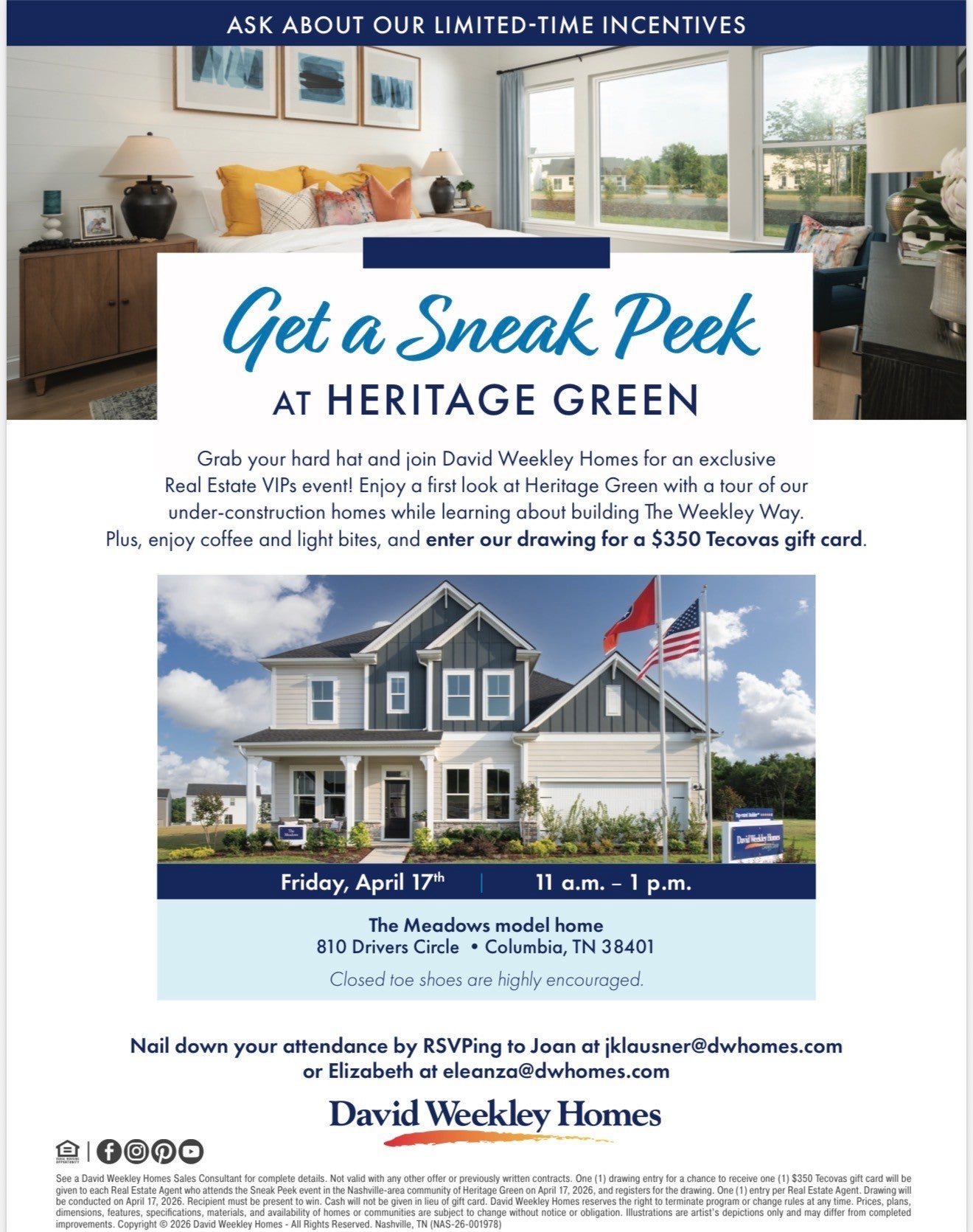 GRAND OPENING INCENTIVES - Heritage Green at Columbia TN Opens May 15th! Our popular, sought-after Meadows floorplan is our model and truly comes alive with a seamless, open flow that makes entertaining feel effortless and everyday living even more enjoyable. Award-winning David Weekley Homes is one of America's largest privately-held builders, there is a reason we're celebrating 50 years in the business! The kitchen showcases carefully selected finishes, featuring Carrera Roma white quartz countertops, Burlap & Cream toned cabinetry, white herringtone tile backsplash, gas range, and champagne bronze hardware - creating an elegant and functional centerpiece of the home. The Owner’s Retreat and an additional bedroom on the main level offer flexible living options, while a spacious retreat upstairs provides the perfect spot for relaxing or gathering. The Owner’s Bathroom Suite offers a spa-like haven, highlighting a freestanding soaking tub alongside a separate walk-in shower adorned with a checkered-patterned slate tile and champagne bronze hardware for a refined, sophisticated finish. Oversized windows fill the home with an abundance of natural light. Heritage Green is designed to bring neighbors together, with landscaped green spaces, and walkable areas to relax, unwind, and connect. Embrace the vibrant Columbia lifestyle with nearby shops and local dining of the charming Historic Downtown just minutes away. Connect with the David Weekley Homes at Heritage Green team to learn more about the renowned, industry-leading warranty included with this new construction home in Columbia, TN. Come experience the David Weekley Difference!